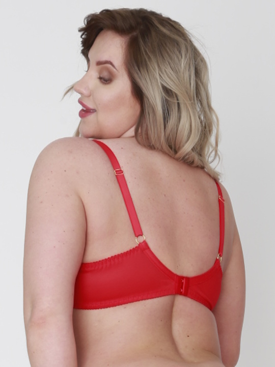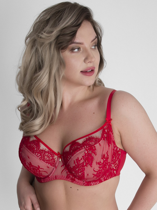 Состав: полиамид 80%, эластан 20% Бюстгальтер A-71 M в красном цвете выполнен на косточках, с боковыми поддержками, чашки мягкие, шитые из гипюра с цветочным рисунком, продублированы телесной сеткой, верх чашек из сетки и кружева с  ресничками , спинка из микрофибры продублирована плотной сеткой.  Бретельки не съемные, регулируются по длине, на спине застёжка - удлинитель на крючках, фурнитура металлическая цвета желтого золота.