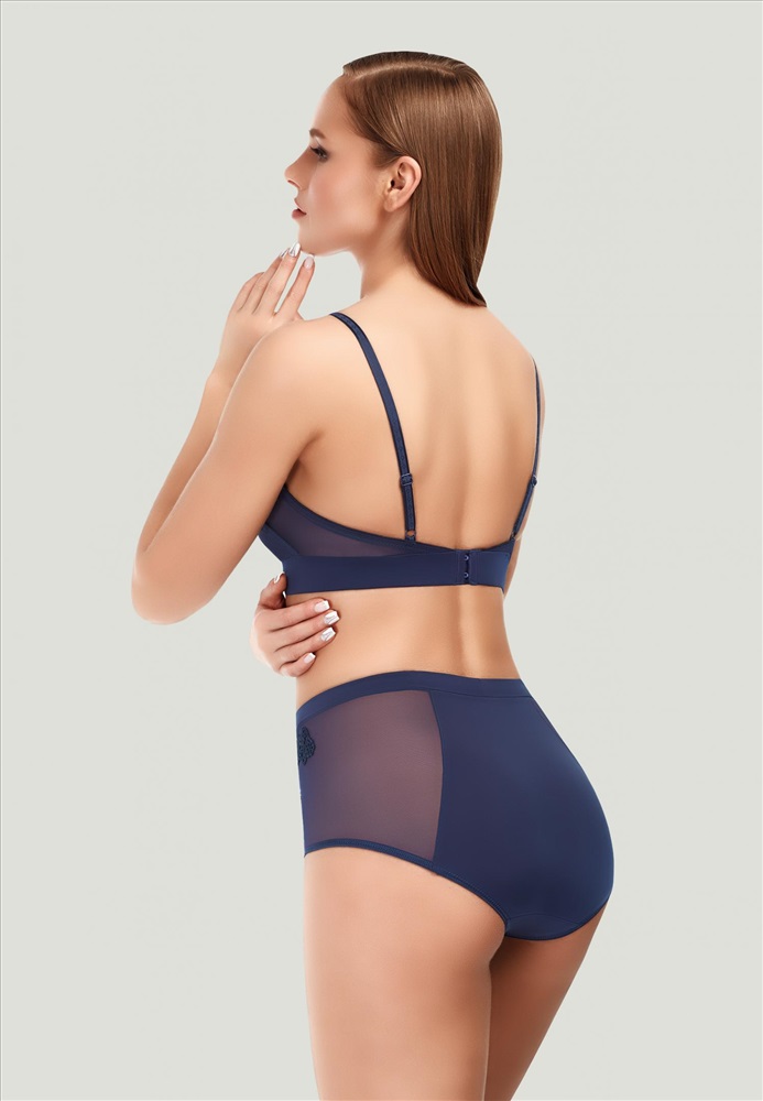 Мягкий бюстгальтер без косточек и бокового шва дарит абсолютное ощущение комфорта и легкости. Мягкие чашки из тонкой сетки перекрываются декоративной деталью из сетки с вышитым мотивом в области декольте. Стан из микрофибры с чистым краем в подворот, внутри эластичная резинка.