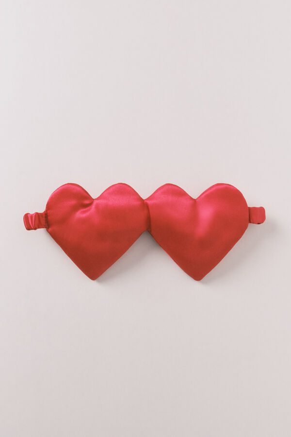 Antifaz para dormir, confeccionado en tejido efecto satén súper suave al tacto, con forma de corazones, en color rojo. Perfecto para dormir con un toque glamuroso y sin que moleste la luz.