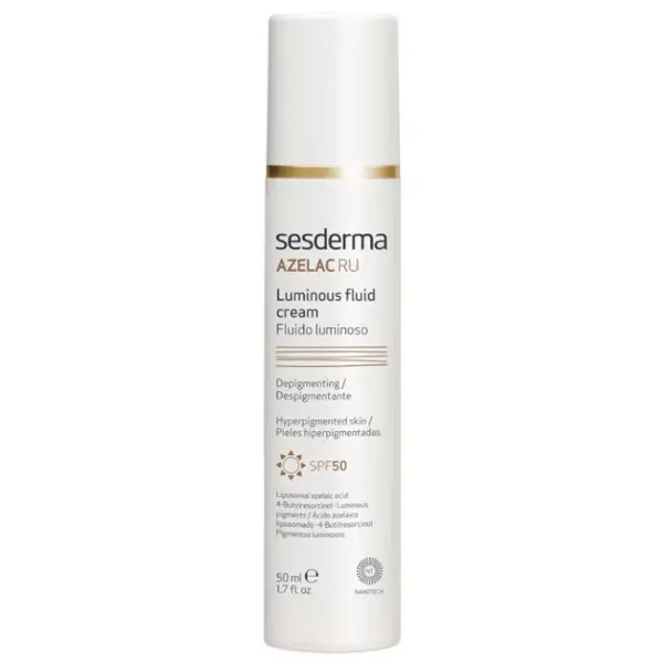 Precio unidad: 59.98 € / 100 ml Marca: 39,99 Sesderma Azelac RU Fluido Luminoso SPF50 50 ml Fluido luminoso con activos despigmentantes liposomados que mejoran la apariencia de las manchas y unifican el tono de la piel. BENEFICIOS - Gracias a su nueva fórmula con ácido tranexámico aumenta su eficacia despigmentante, apoyada por la acción del ácido azelaico y el 4-butil-resorcinol. - Reduce la apariencia de las manchas, aclara el tono y previene la aparición de nuevas hiperpigmentaciones. - Bloquea y reduce la producción de melanina de forma eficaz. - Contiene pigmentos luminosos que aportan luminosidad y homogenizan el tono de la piel, y factor de crecimiento TGF-BETA2, que regenera la matriz dérmica y refuerza el sostén de la piel. - Puede usarse durante todo el año, incluso en verano, puesto que tiene protección SPF50, contiene filtros físicos y químicos que protegen de los daños UV del sol. - Indicado para todo tipo de pieles. - Sin retinol, por lo que es apto para embarazadas. Consejo técnicoEste despigmentante es adecuado para usar durante todo el año, incluso en verano. Además, es perfecto para proteger la piel del sol a diario gracias a su factor de protección solar SPF50.Комментарии к товару