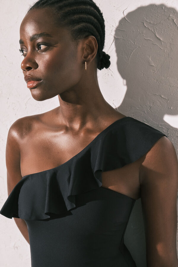 Bañador moldeador liso especialmente diseñado para cubrir las necesidades incluso de las tallas más grandes. Línea asimétrica con volante que se prolonga hasta el hombro. Con copa extraíble, goma bajo pecho y tirante regulable para mejor sujeción. Tejido especialmente diseñado para comodidad y sujeción, siendo elastico en las 4 direcciones. Completamente forrado.