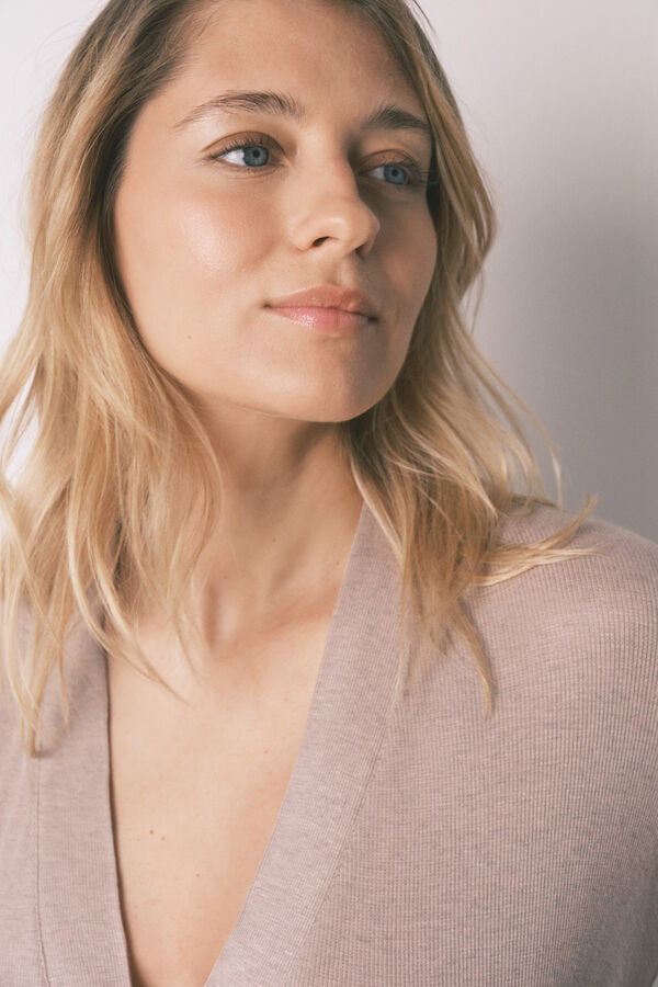 Bata de la colección de maternity en un suave tejido de viscosa melange en canalé. Largo midi, de manga larga con encaje a contraste en puño. Cruce regulable mediante cinturón del mismo género. Las fibras LENZING™ ECOVERO™ se obtienen de madera y celulosa sostenibles, a partir de fuentes certificadas y controladas.