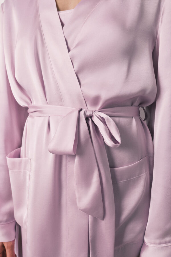 Bata midi de manga larga, lisa, confeccionada en tejido de satén, estilo cruzada, con cinturón para un mayor y mejor ajuste. Combínala con un pijama o camisón para estar en casa cómoda y con estilo.