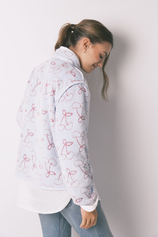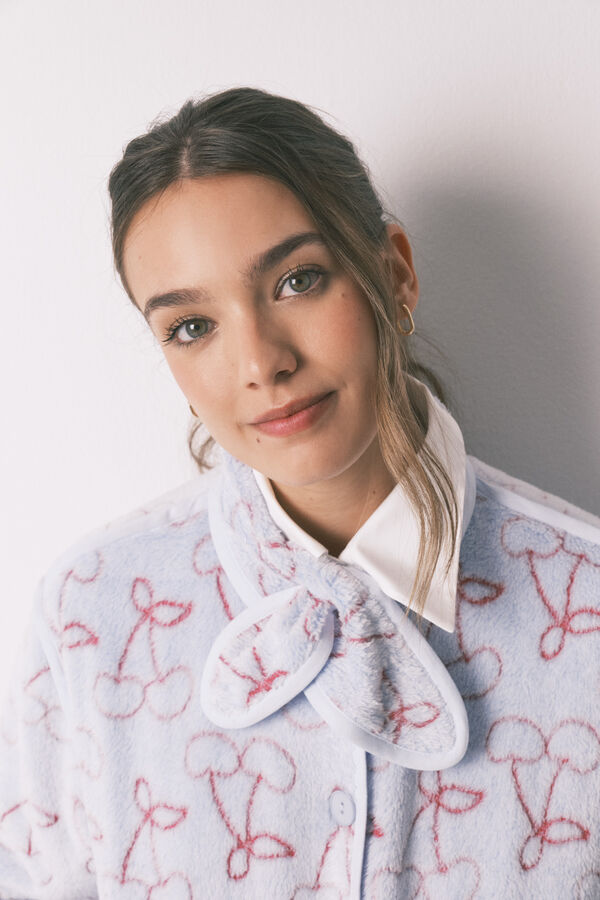 Bata estampada en polar de pelo en efecto Jacquard. Escote redondo envivado a tono con un atado en el cuello, abotonadura en el centro a tono y canesú, sisas, bolsillos y bajos envivados a tono. El tejido principal contiene al menos un 50% de fibras de poliéster reciclado.