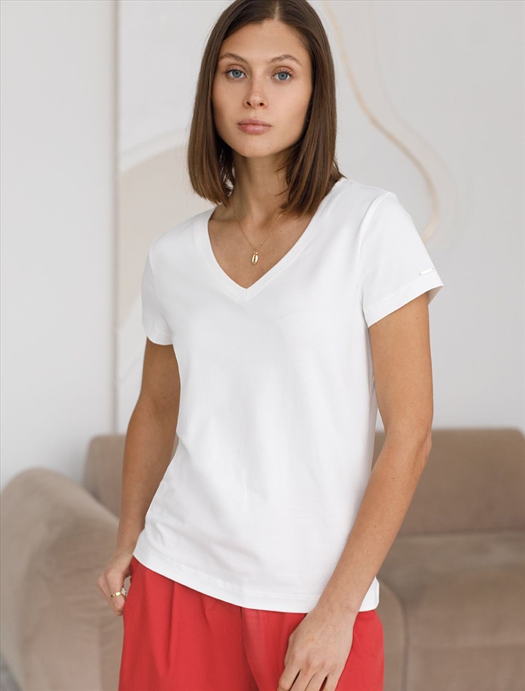 Базовая футболка белого цвета с V-образным вырезом выполнена из премиального хлопка. Добавление эластана в состав изделия способствует формоустойчивости. Футболка выполнена из качественного натурального материала, отлично сидит по фигуре и подходит для отдыха и работы. Преимущество этой модели - V-образный вырез, который подчеркивает линию шеи и придает внешнему виду элегантность. Такой фасон гармонично вписывается как в классические, так и в современные гардеробы. Декольте делает изделие более женственным и визуально вытягивает силуэт, создавая ощущение легкости. Такая футболка средней длины и классического кроя идеально подойдет под любую одежду. Модель доступна в больших размерах, чтобы каждая женщина могла подчеркнуть свою индивидуальность.