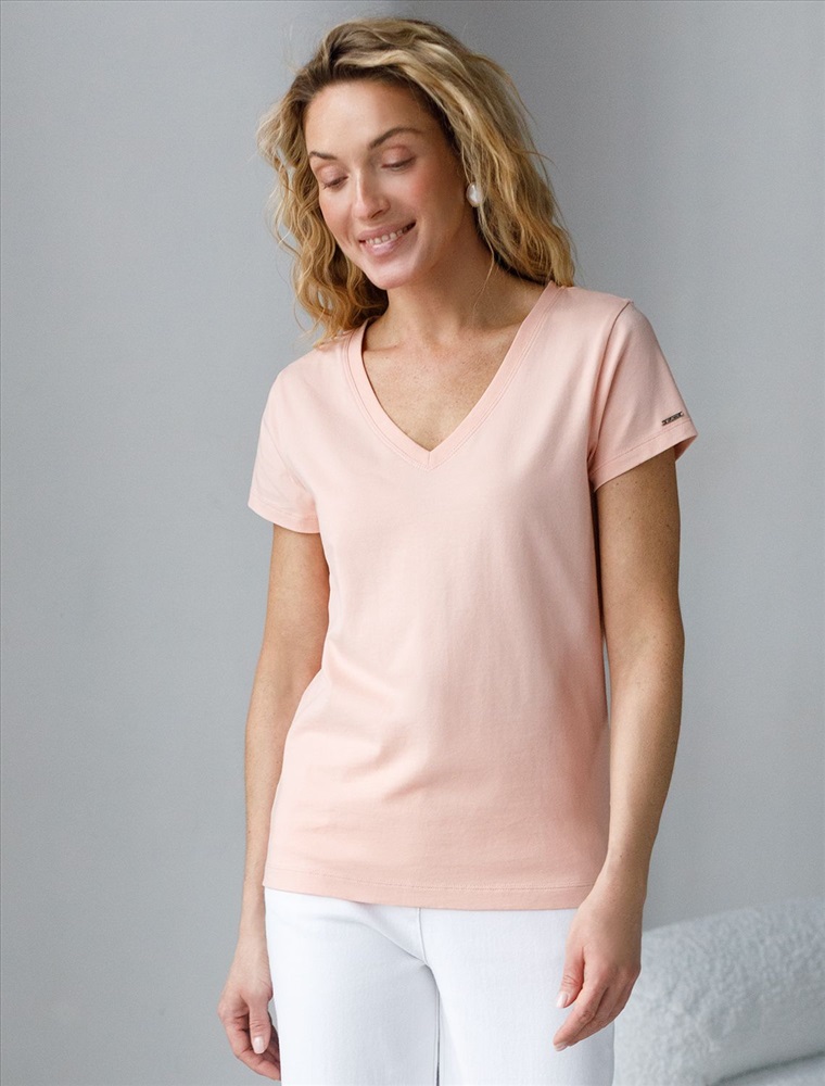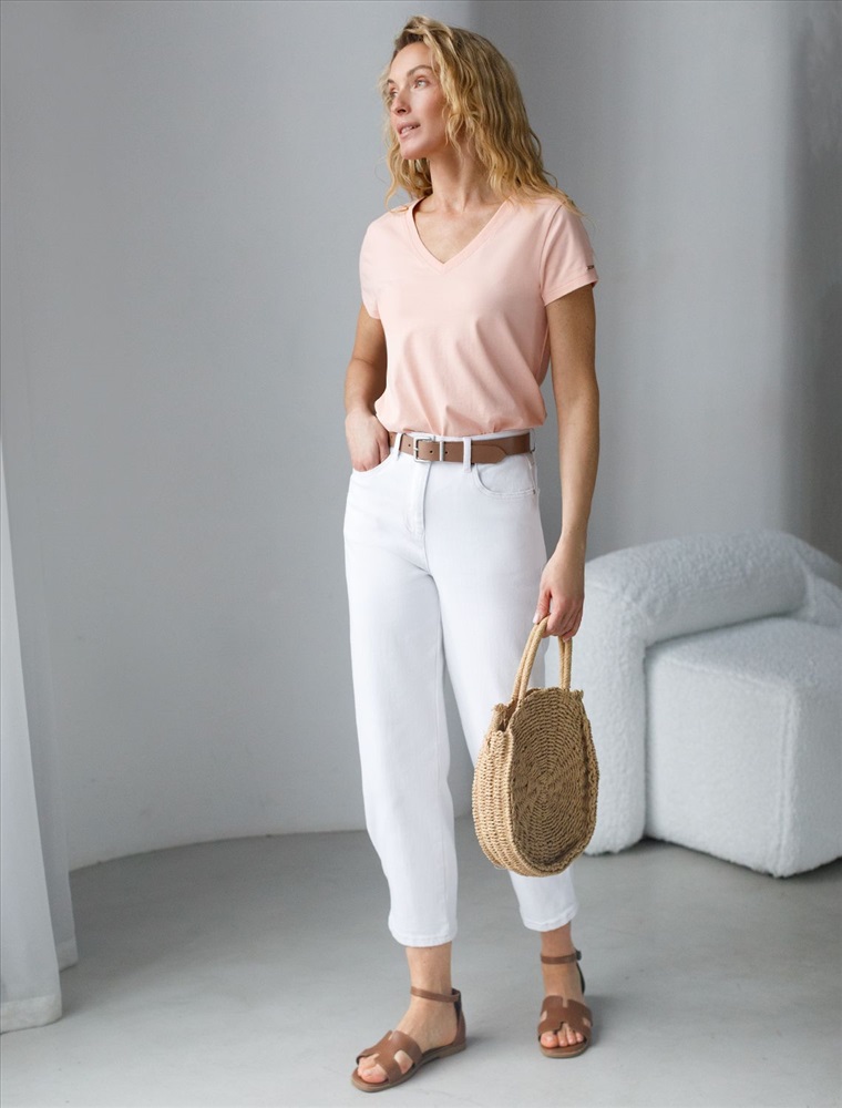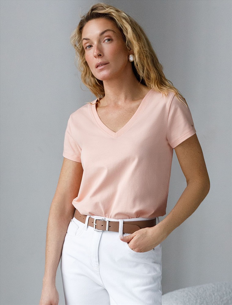 Плотность: 170 Г/м2 Базовая футболка пудрового цвета с V-образным вырезом выполнена из премиального хлопка. Добавление эластана в состав изделия способствует формоустойчивости. Футболка выполнена из качественного натурального материала, отлично сидит по фигуре и подходит для отдыха и работы. Преимущество этой модели - V-образный вырез, который подчеркивает линию шеи и придает внешнему виду элегантность. Такой фасон гармонично вписывается как в классические, так и в современные гардеробы. Декольте делает изделие более женственным и визуально вытягивает силуэт, создавая ощущение легкости. Такая футболка средней длины и классического кроя идеально подойдет под любую одежду. Модель доступна в больших размерах, чтобы каждая женщина могла подчеркнуть свою индивидуальность. Комментарии к товару