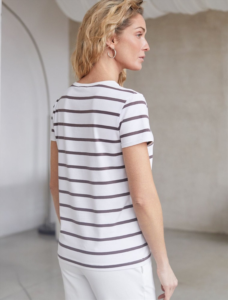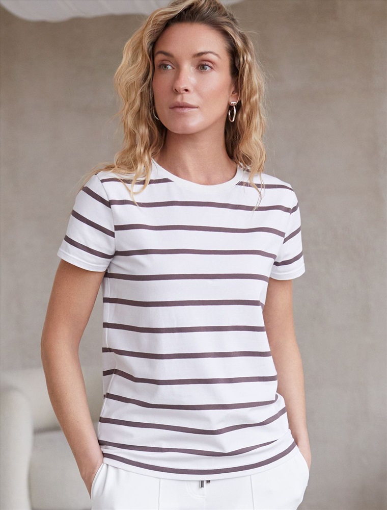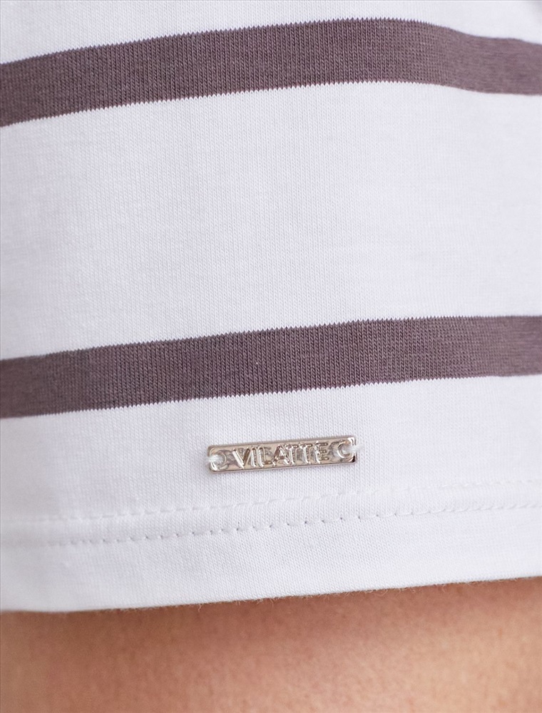 Плотность: 170 Г/м2 Стильная и модная женская футболка белого цвета в кофейную полоску станет отличным дополнением к вашему гардеробу. Футболка плотностью 170 Г/м2 изготовлена из премиального хлопка с добавлением эластана. Добавление эластана в состав изделия способствует формоустойчивости. Эта классическая футболка подходит для создания кэжуал образа на каждый день и идеально подойдет для работы. Модель не мнется, что делает ее практичным вариантом для активных женщин, которые ценят стиль и удобство. Благодаря современному принту полоска эта футболка легко комбинируется с различными элементами гардероба. Она станет универсальным решением для тех, кто предпочитает комфортный стиль casual. Повседневная футболка подчеркнет вашу индивидуальность и позволит вам выглядеть привлекательно в любой ситуации. Легкость в уходе и высокая износостойкость делают ее незаменимой вещью в вашем гардеробе. Одевайте эту модель как на работу, так и на встречу с друзьями — она всегда будет уместна! Стильная и практичная модель с простым кроем и лаконичным дизайном - идеальный вариант для тех, кто ценит качество, минимализм и классический стиль в одежде. Комментарии к товару