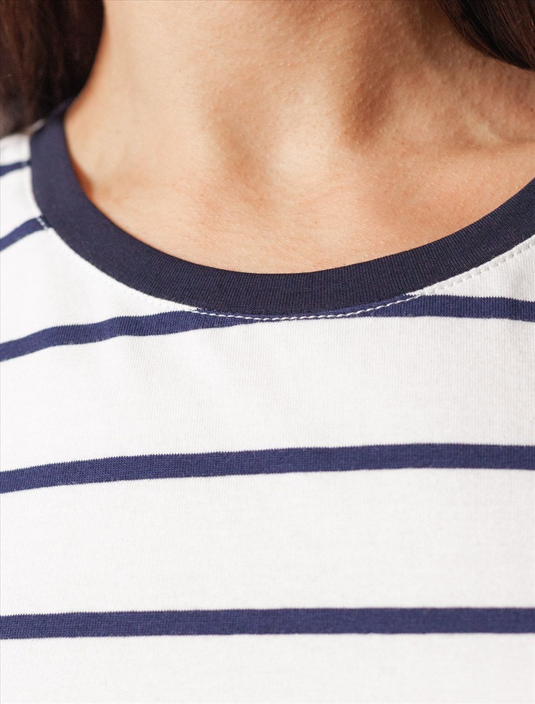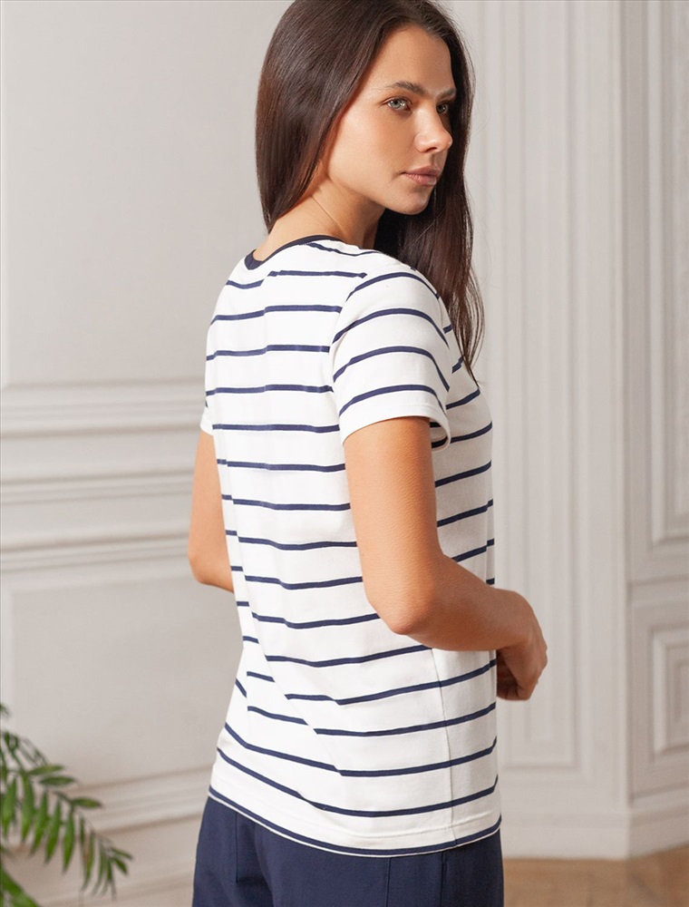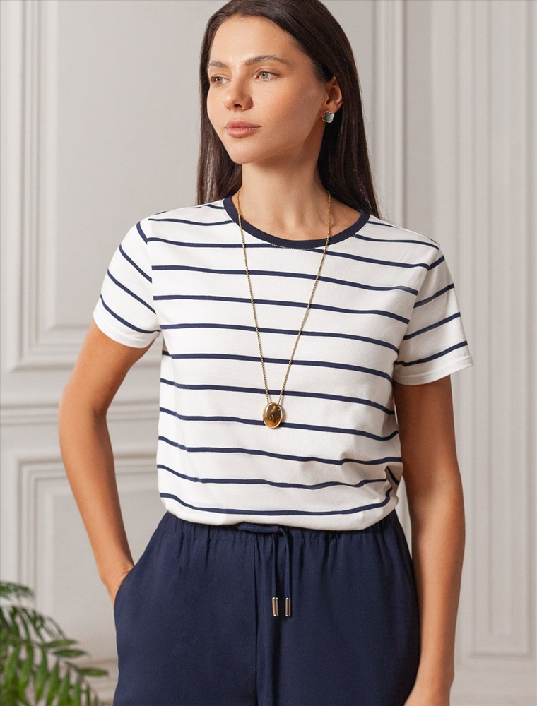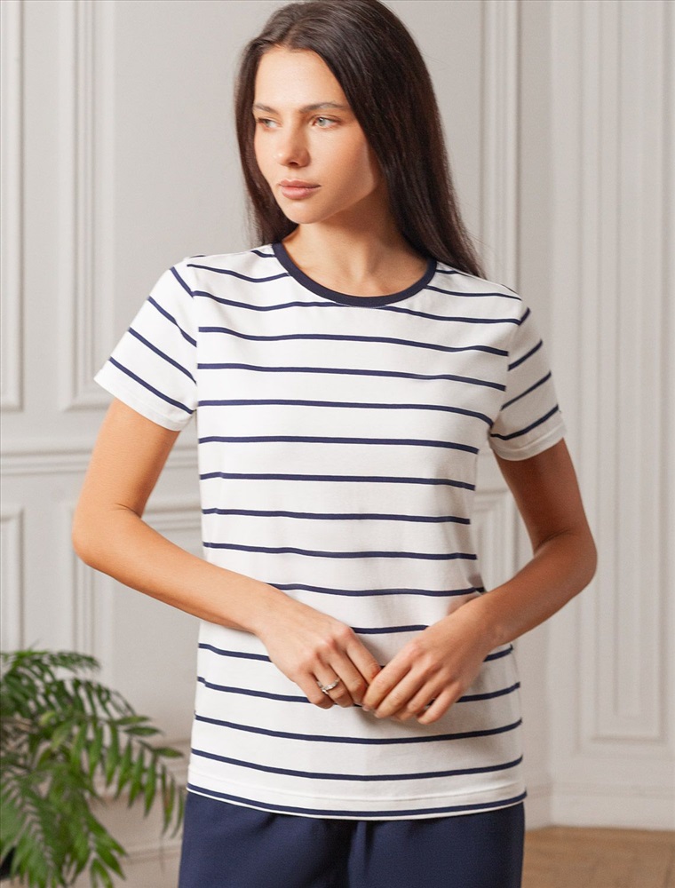 Плотность: 170 Г/м2 Стильная и модная женская футболка белого цвета в темно-синюю полоску станет отличным дополнением к вашему гардеробу. Футболка плотностью 170 Г/м2 изготовлена из премиального хлопка с добавлением эластана. Добавление эластана в состав изделия способствует формоустойчивости. Эта классическая футболка подходит для создания кэжуал образа на каждый день и идеально подойдет для работы. Модель не мнется, что делает ее практичным вариантом для активных женщин, которые ценят стиль и удобство. Благодаря современному принту полоска эта футболка легко комбинируется с различными элементами гардероба. Она станет универсальным решением для тех, кто предпочитает комфортный стиль casual. Повседневная футболка подчеркнет вашу индивидуальность и позволит вам выглядеть привлекательно в любой ситуации. Легкость в уходе и высокая износостойкость делают ее незаменимой вещью в вашем гардеробе. Одевайте эту модель как на работу, так и на встречу с друзьями — она всегда будет уместна! Стильная и практичная модель с простым кроем и лаконичным дизайном - идеальный вариант для тех, кто ценит качество, минимализм и классический стиль в одежде. Комментарии к товару