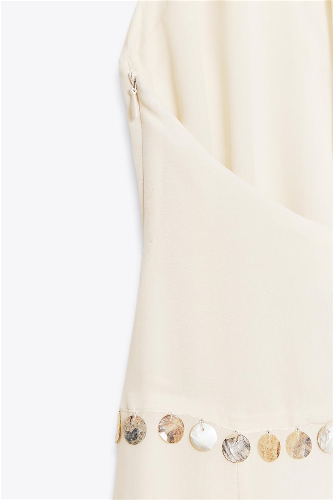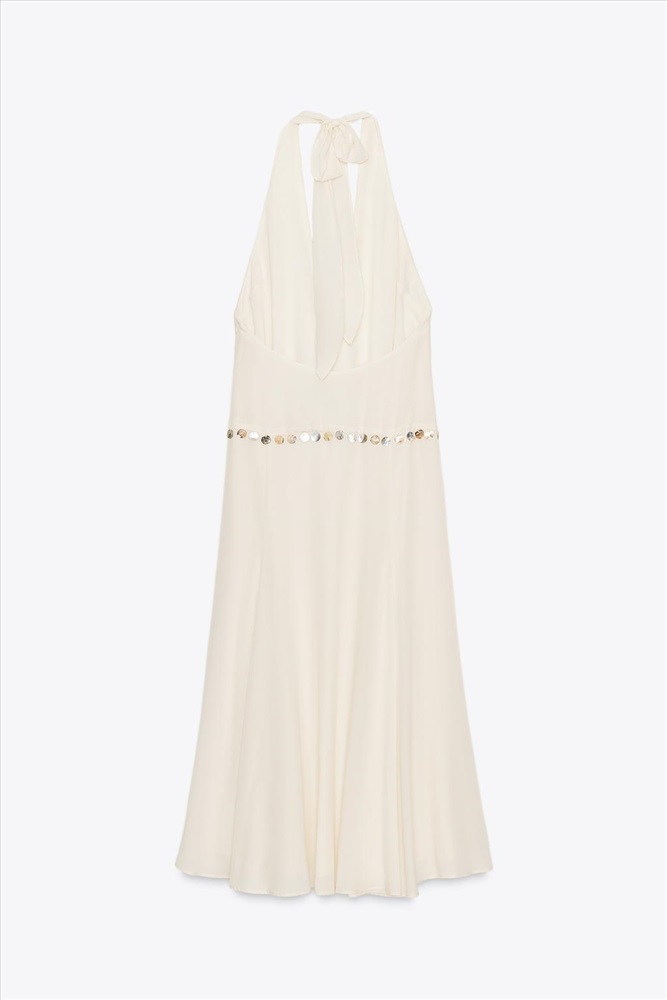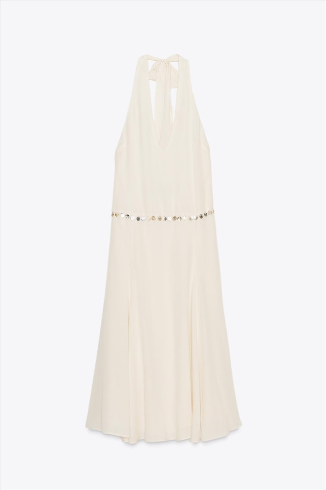 Midi dress made from lyocell. Halter neck that can be adjusted with a tie and v-neck. Combined inner cotton lining. Open back. Beaded appliqué detail. Side zip fastening concealed in the seam. COMPOSITION, CARE & ORIGIN COMPOSITION OUTER SHELL 100% lyocell LINING 100% polyester Which contains at least: LINING 100% RCS certified recycled polyester CERTIFIED MATERIALS RCS CERTIFIED RECYCLED POLYESTER Nowadays, recycled polyester is mainly made from PET plastic waste. This is a type of plastic that is widely used in a variety of items, such as plastic bottles. Using recycled materials helps limit the production of virgin polyester fibre. It is certified to the Recycled Claim Standard (RCS), which verifies the recycled content and tracks it from source to final product. Certified by Intertek 193341 More information CARE Caring for your garments to extend their useful life. Lower temperature washes and delicate spin cycles are gentler on garments and help to protect the colour, shape and structure of the fabric.