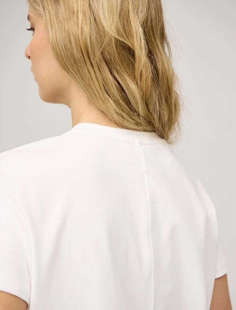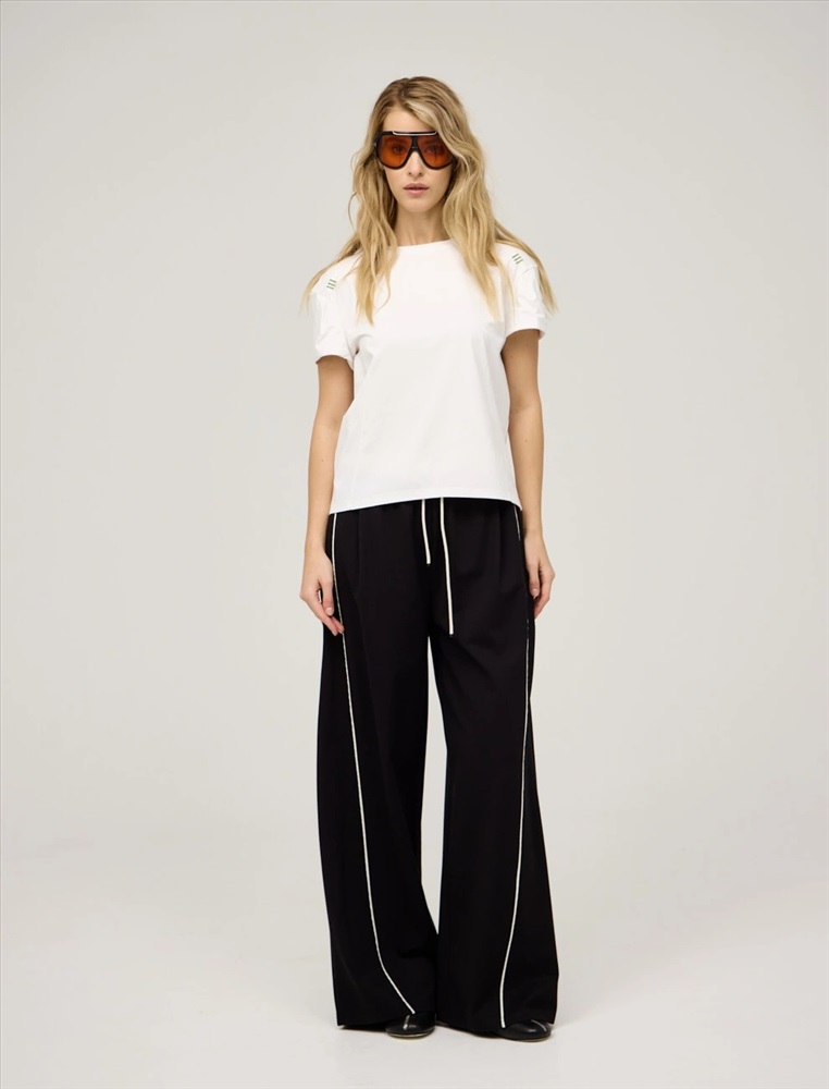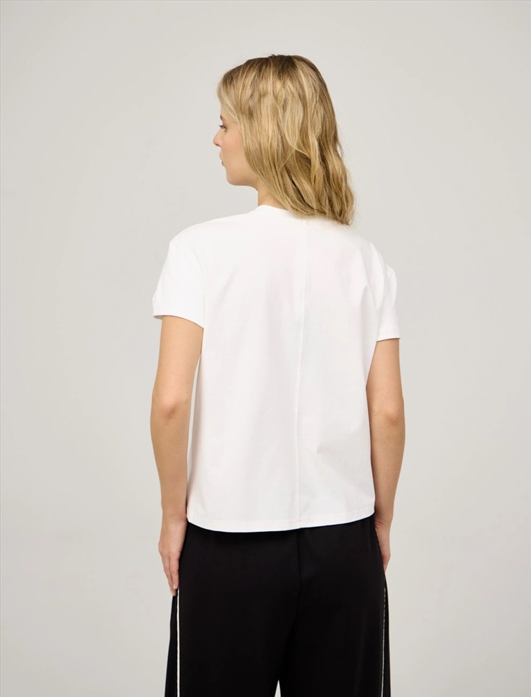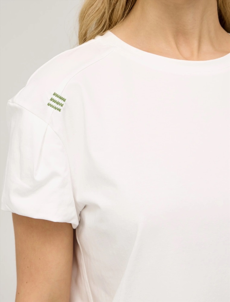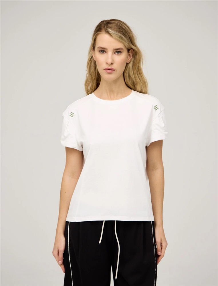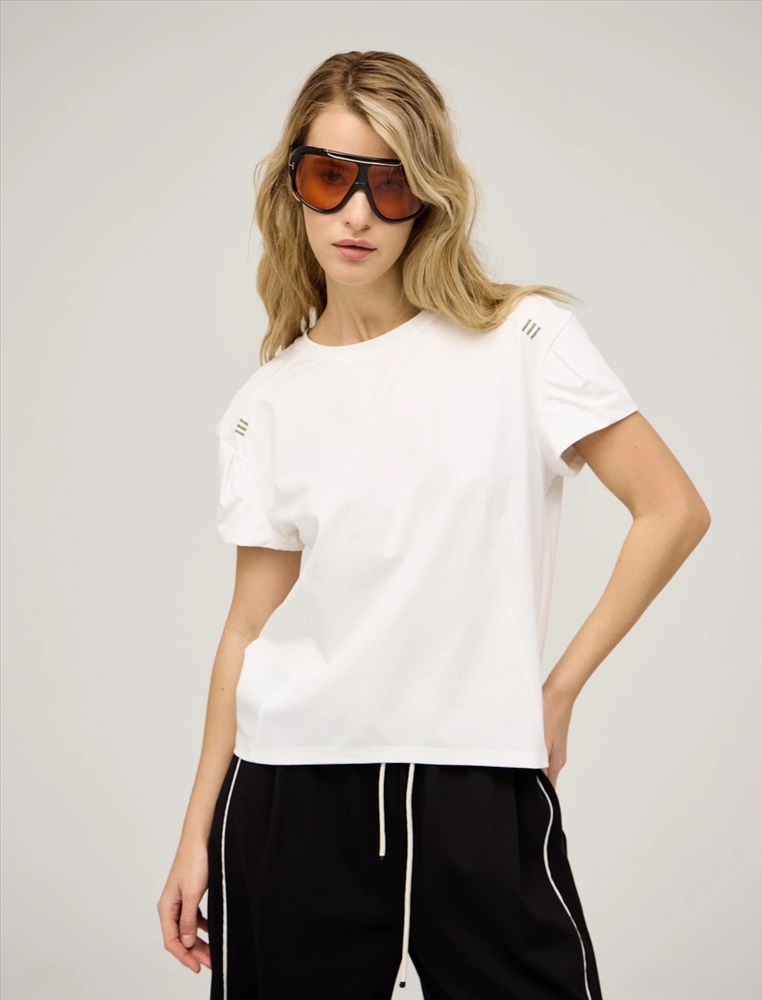Футболка прямого силуэта с короткими рукавами и круглой горловиной. По передней части изделия, на уровне плеч — рельефные швы и контрастная вышивка с гиперболизированными закрепками. Рукава короткие, двойные, с вертикальной складкой. По переду изделия две вертикальные вытачки для лучшей посадки. Выполнена из хлопка (95%) и спандекса, обеспечивающих комфорт и долговечность. Представлена в белом и черном цвете.