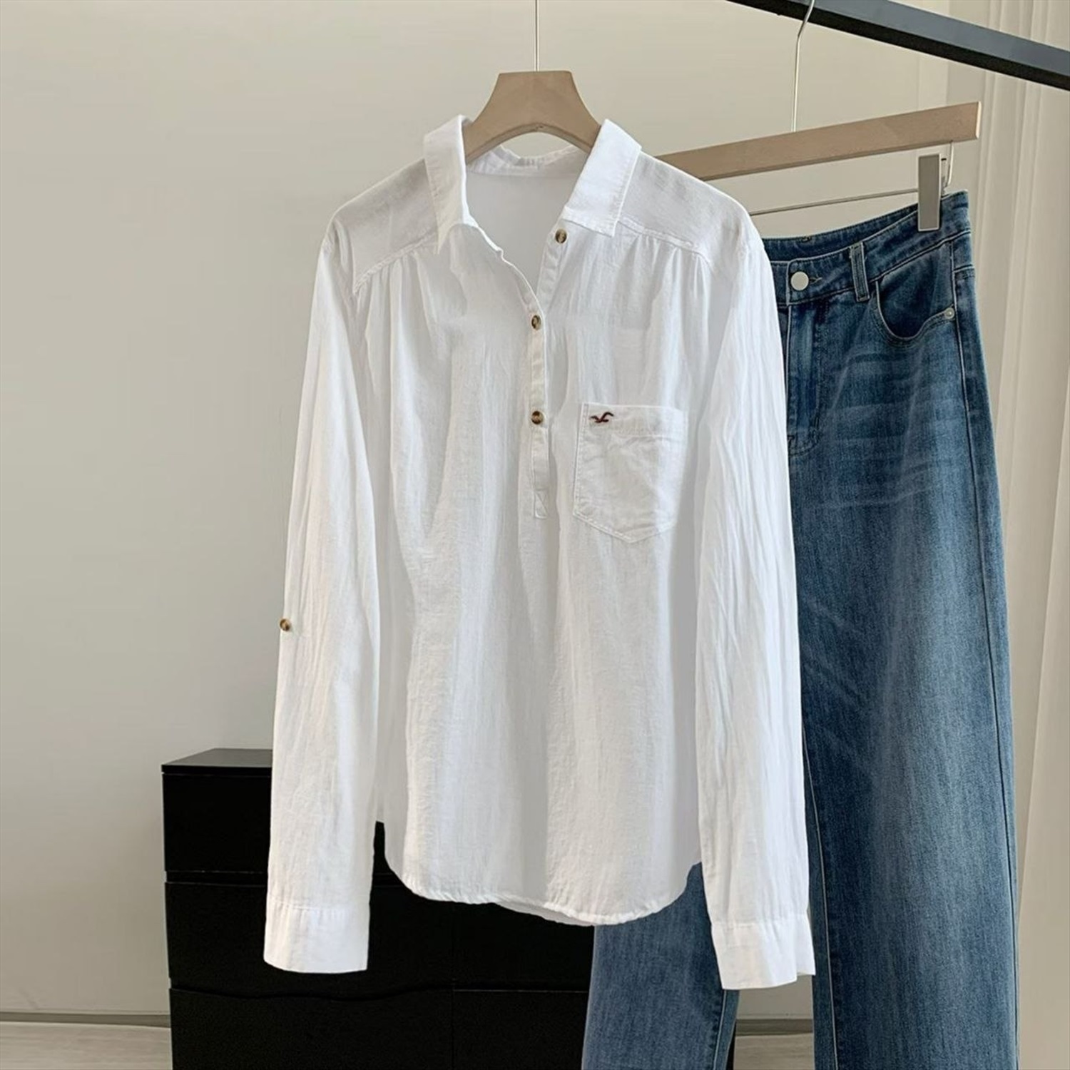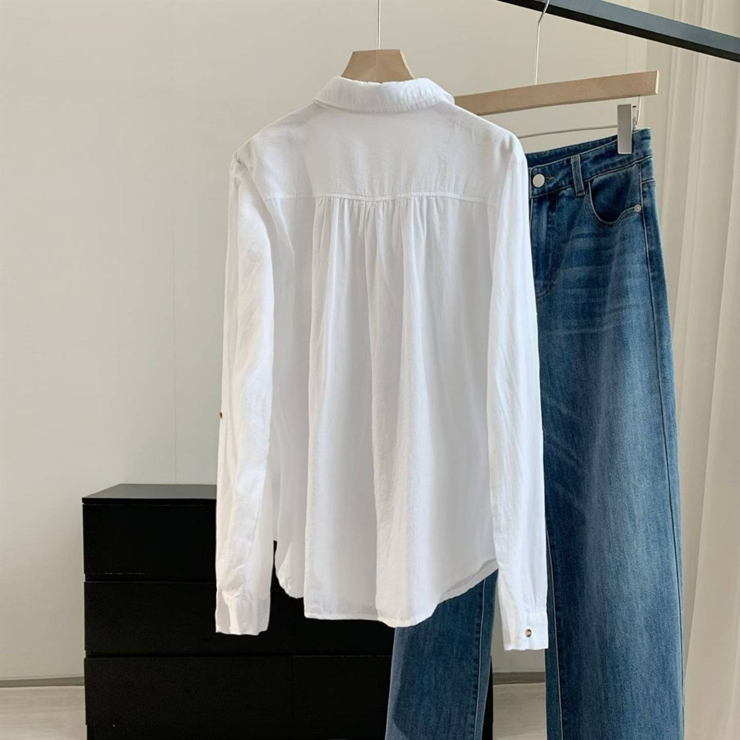 Свободный крой, на рукавах есть пуговицы, можно красиво подогнуть.