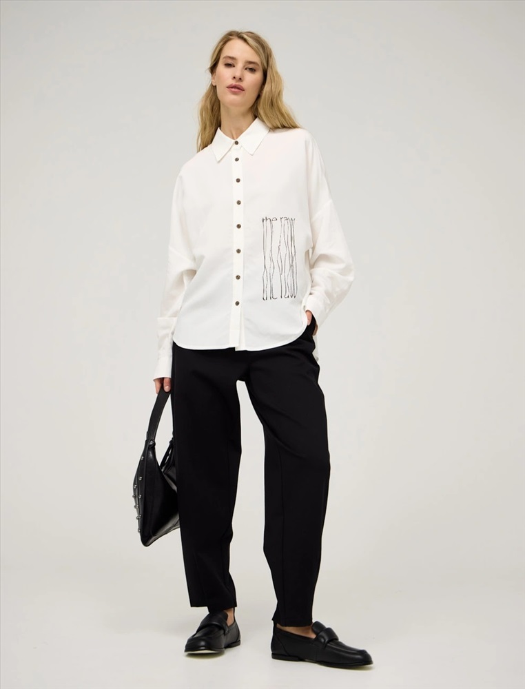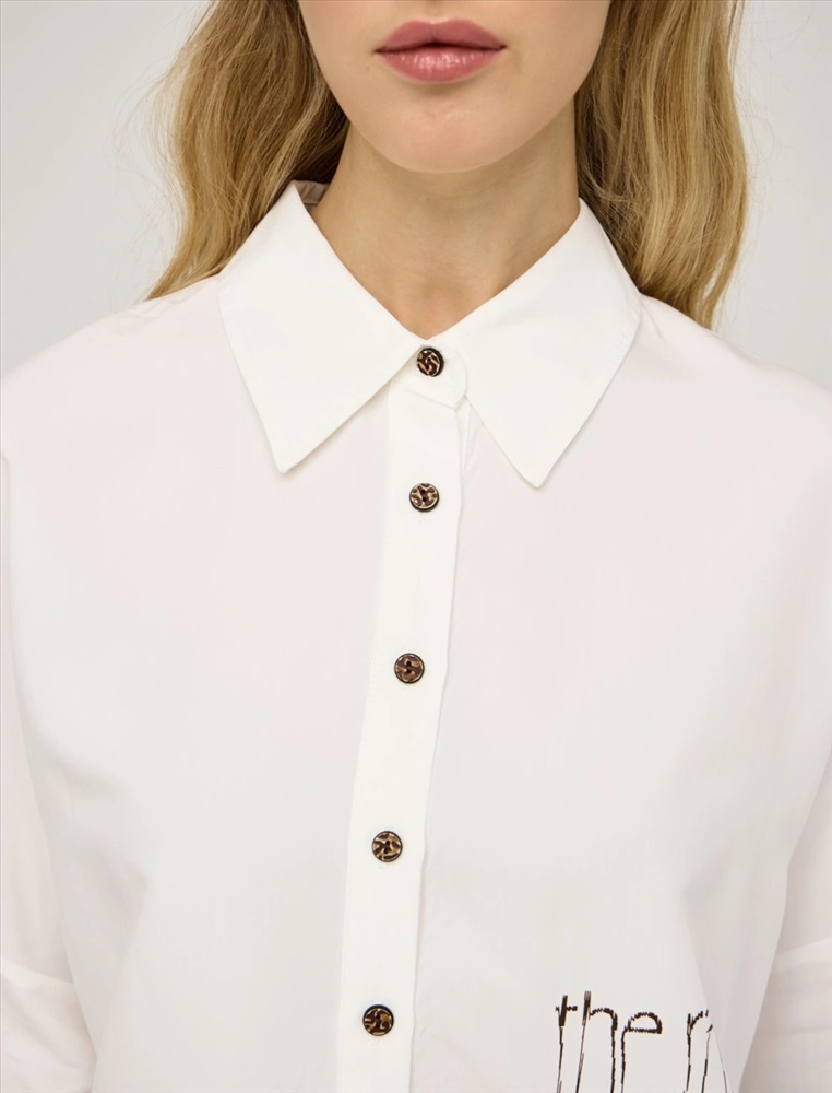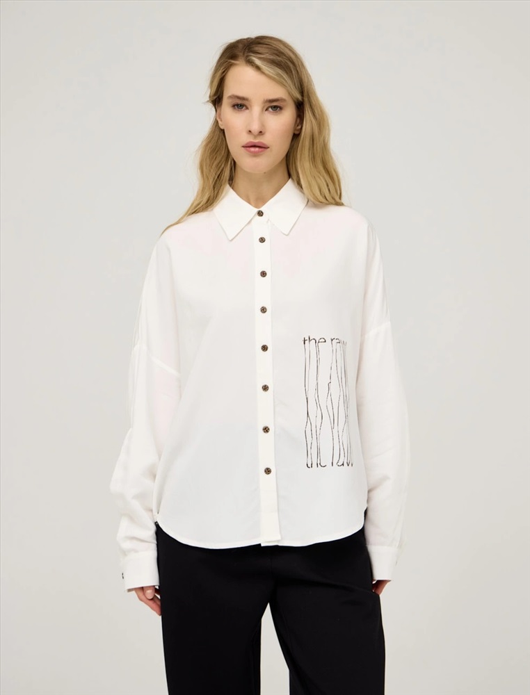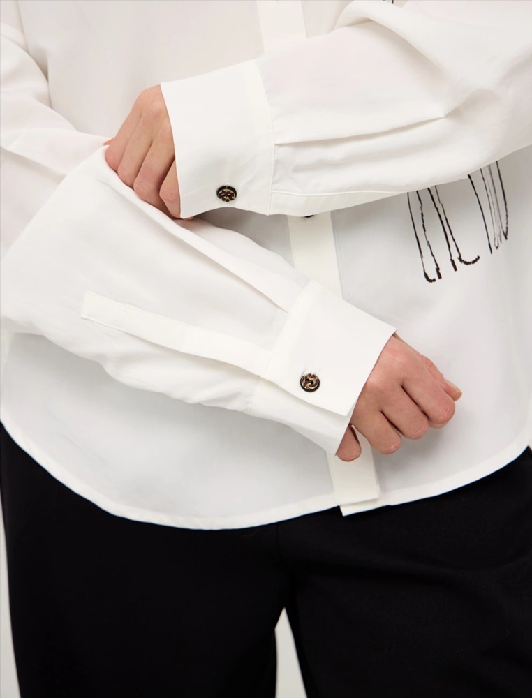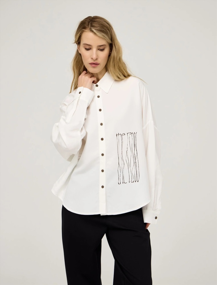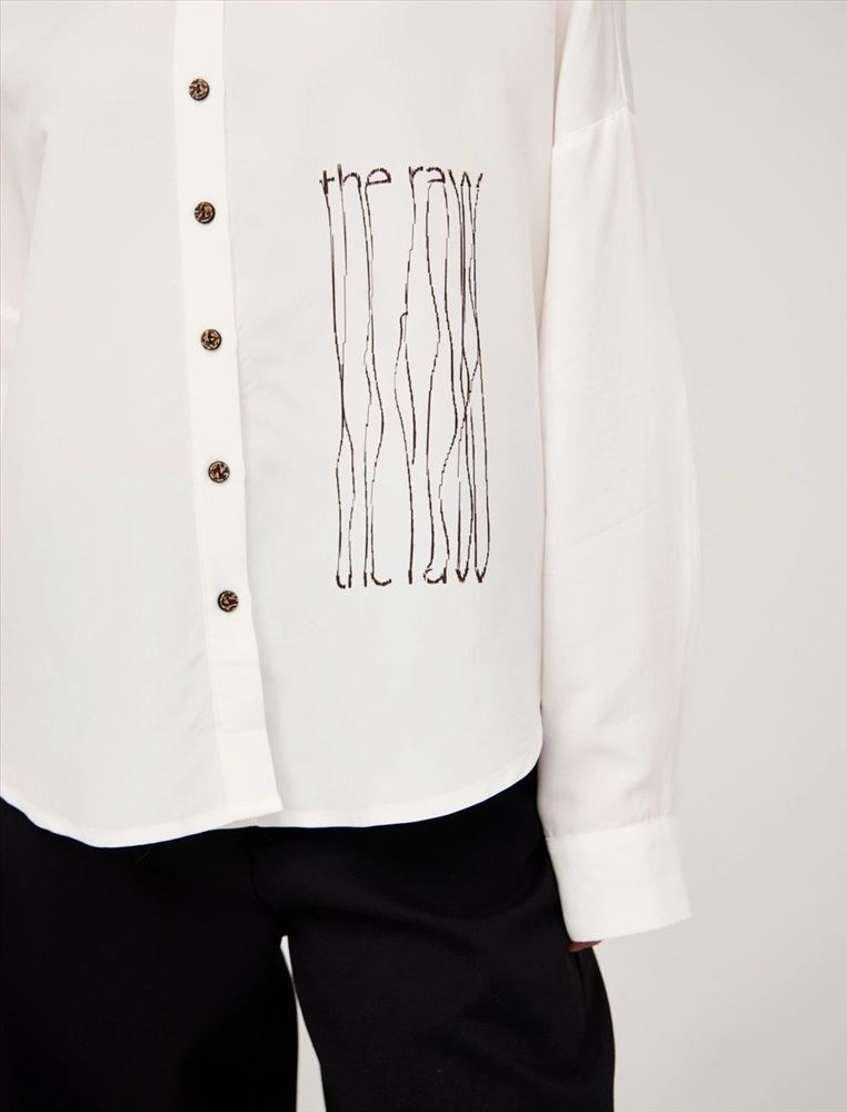 Рубашка свободного кроя с отложным воротником. Линия плеча спущена. По передней части изделия — планка с застежкой на пуговицы. По рукавам - манжеты с шлицами, застегивающиеся на пуговицы. Округлый низ изделия. Акцентной деталью изделия является контрастный принт по передней части с левой стороны. Выполнена из смесового хлопка, что обеспечивает износостойкость и долговечность изделия. Представлена в белом цвете.