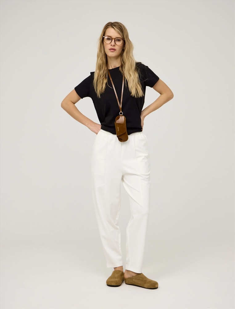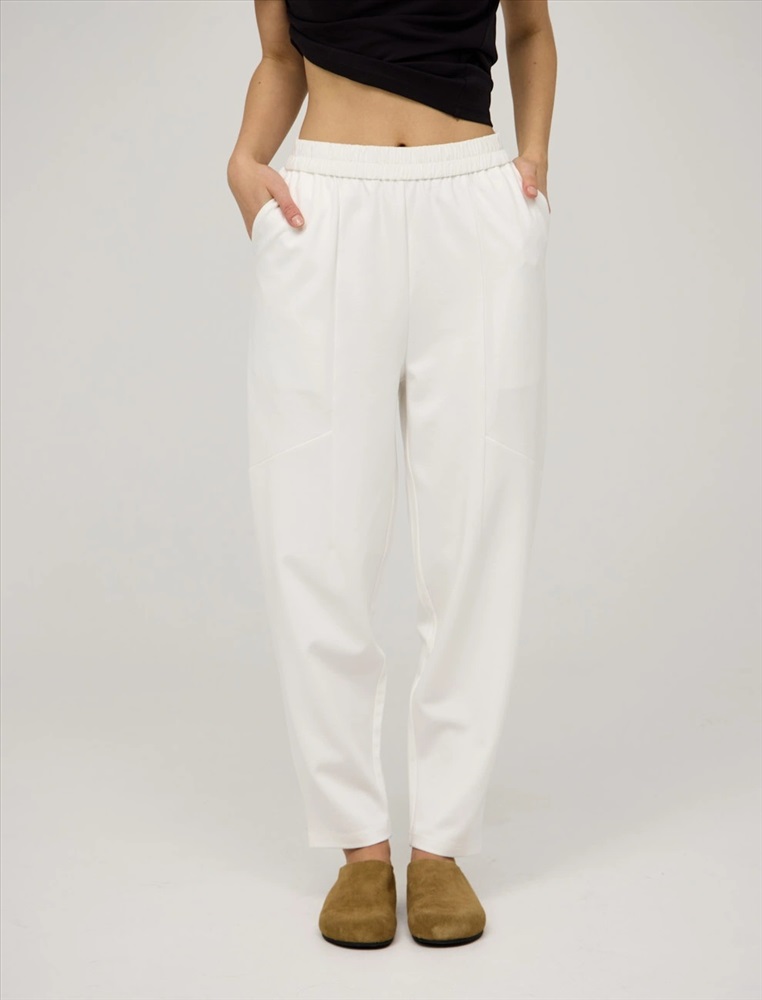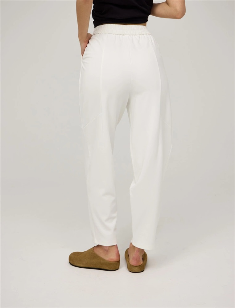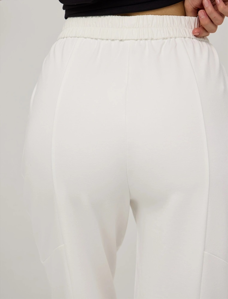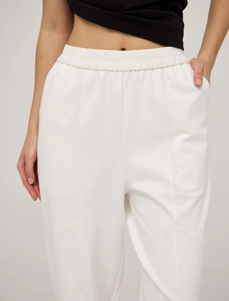 Брюки зауженного к низу силуэта, укороченные, с посадкой на уровне талии. По переду изделия два отрезных кармана, усиленных отделочной строчкой. Пояс на эластичной резинке для комфортно посадки. По переду изделия вытачки и рельефные швы для улучшенной посадки по фигуре. Выполнены из хлопка (95%) и спандекса, что обеспечивает комфорт и долговечность. Представлены в белом цвете.