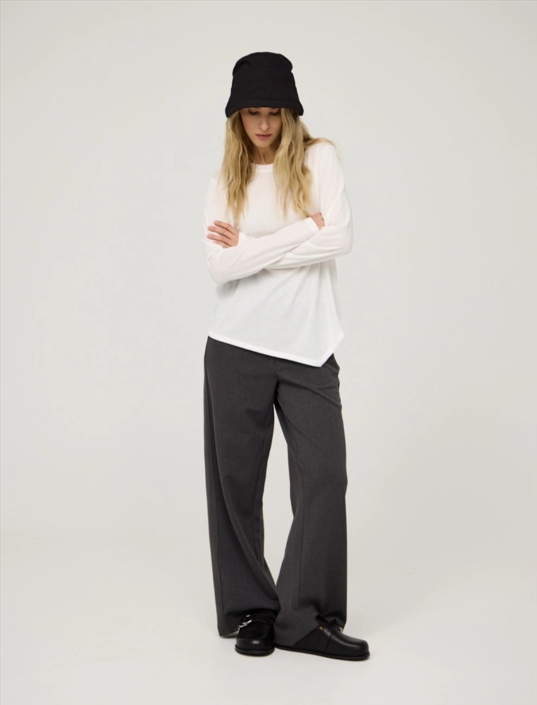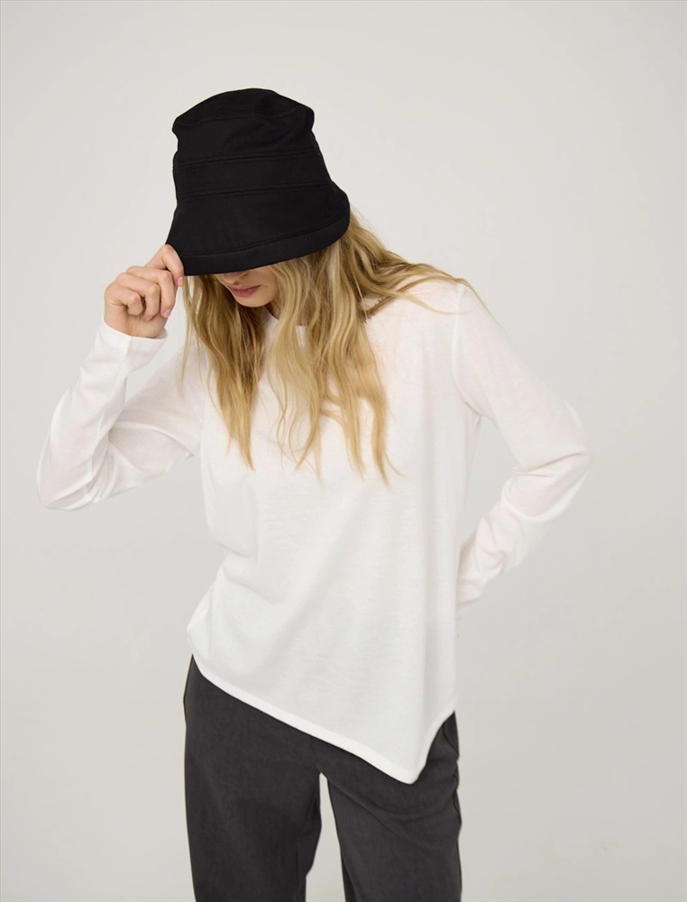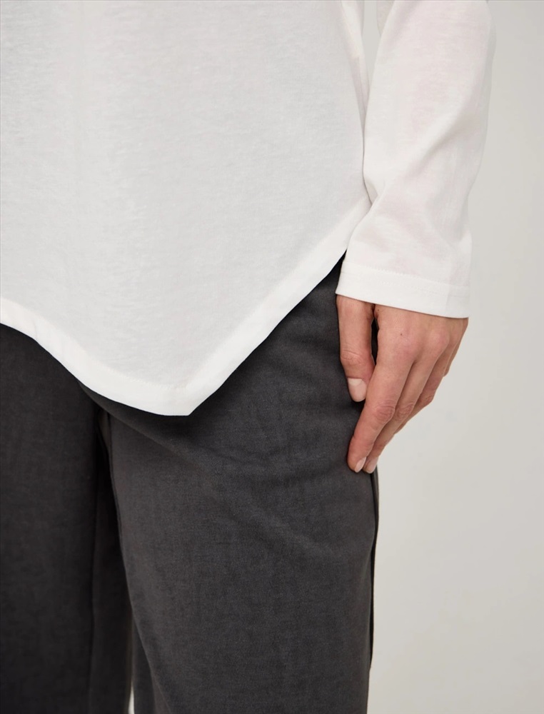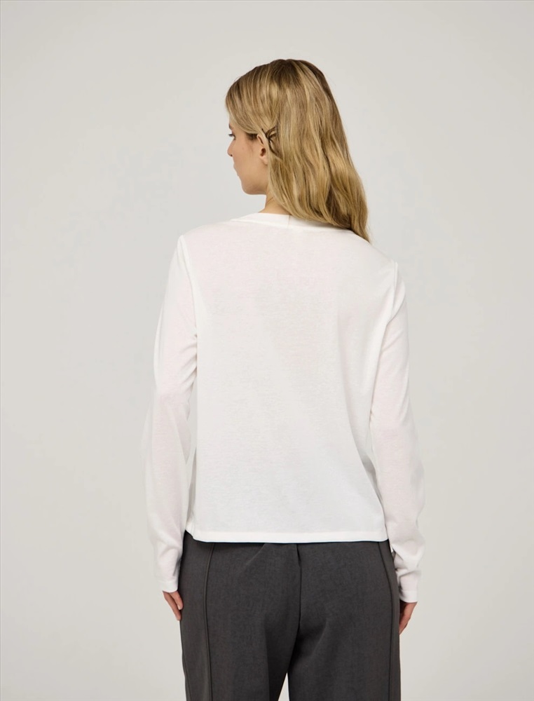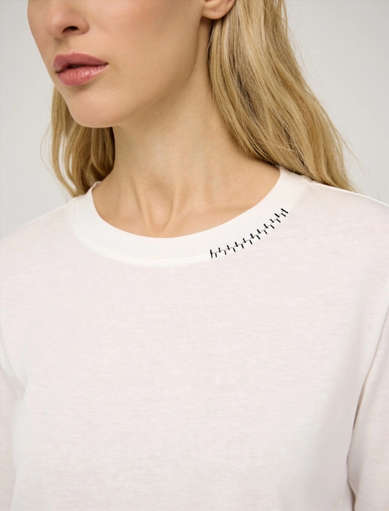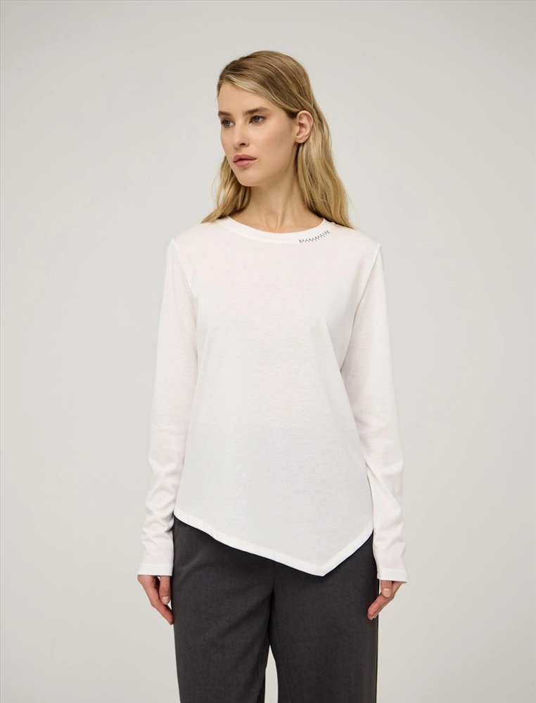 Джемпер регулярного силуэта с круглой горловиной и длинными рукавами. По горловине с левой стороны контрастная вышивка. Низ джемпера асимметричный. Выполнен из хлопка (60%), лиоцелла (34%) и полиэстера. Представлен в белом и янтарном оттенках.