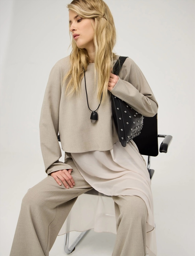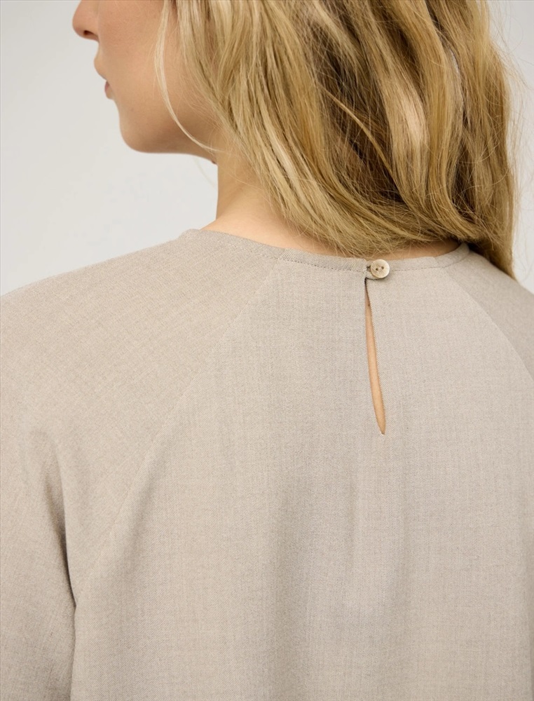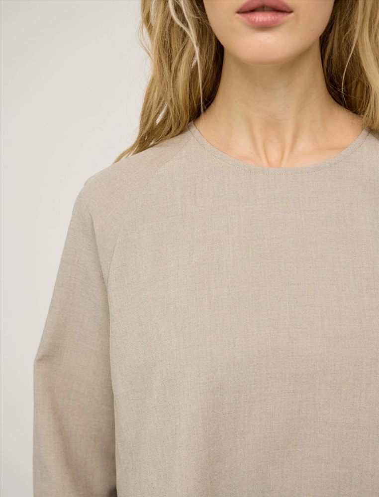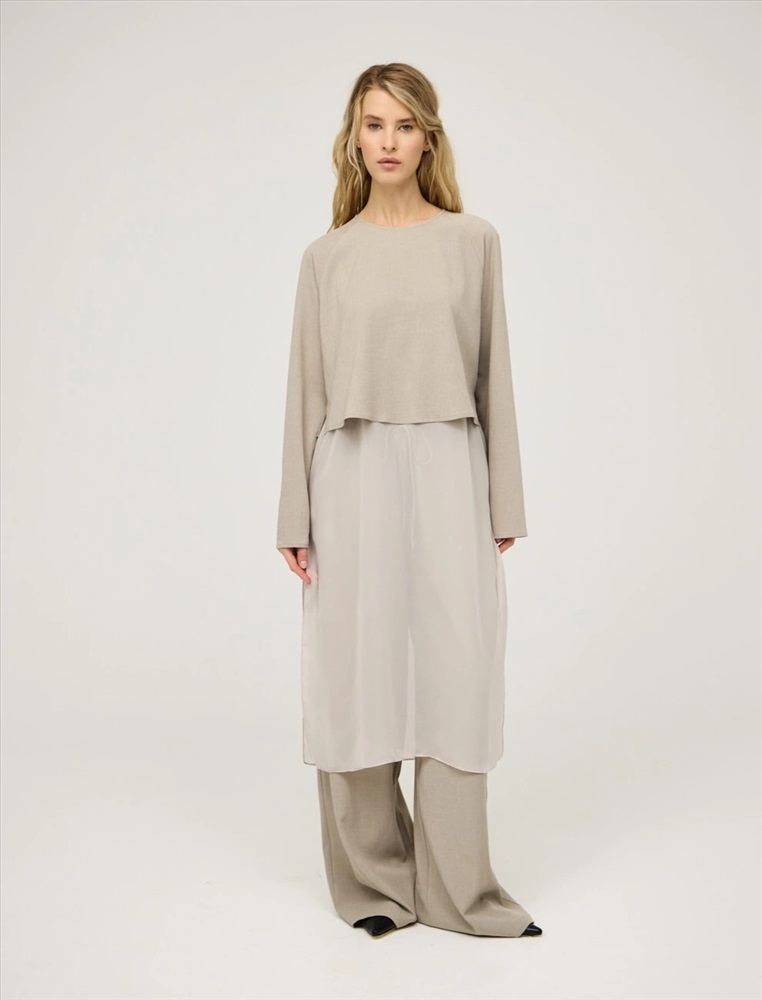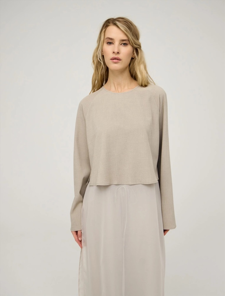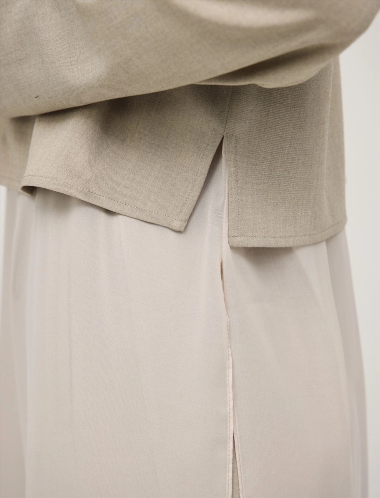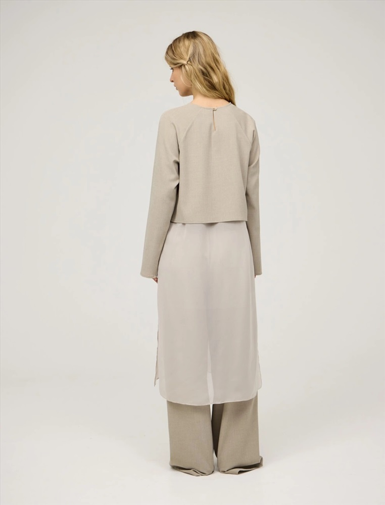 Блузка регулярного силуэта с круглой горловиной и длинными рукавами по типу реглан. Верхняя часть блузки укороченная и выполнена из костюмной ткани. Нижняя вставка из тусса-шелка с разрезами в боковых швах и длиной ниже колена. Представлена в бежевом цвете.