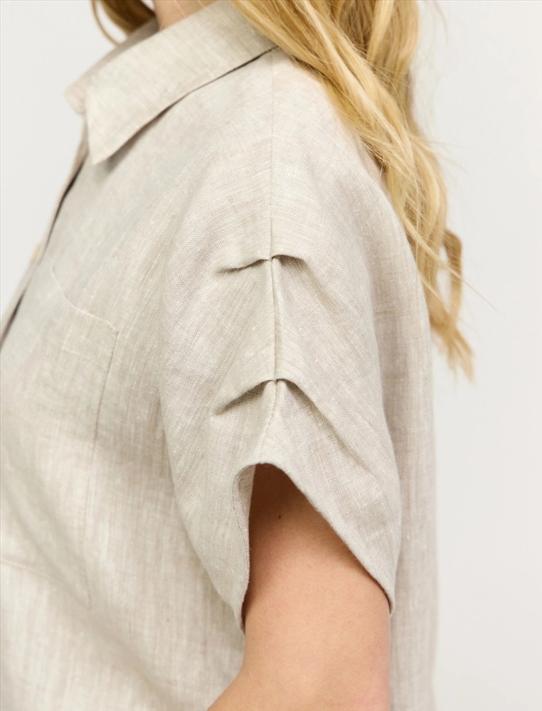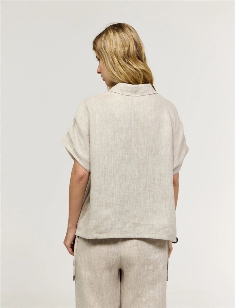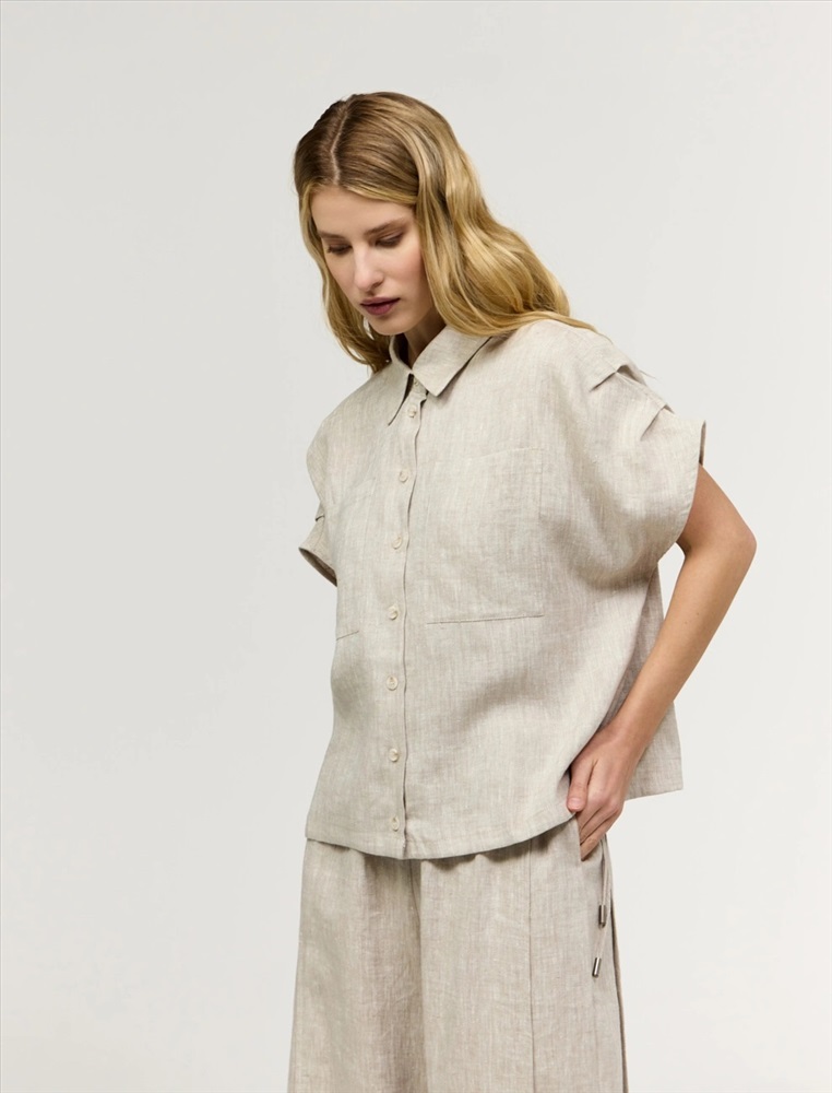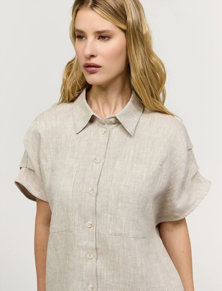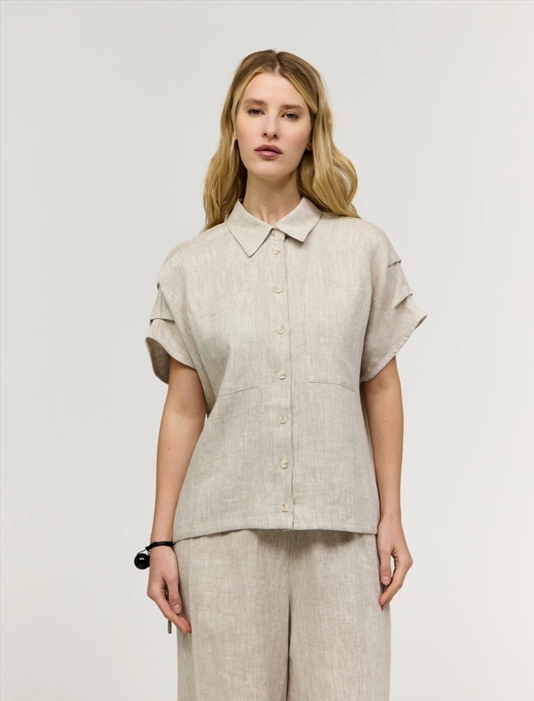 Рубашка прямого силуэта с короткими цельнокроеными рукавами. По горловине отложной воротник. По передней части изделия застежка на пуговицы. Выполнена из 100% льна. Представлена в бежевом и коричневом оттенке.
