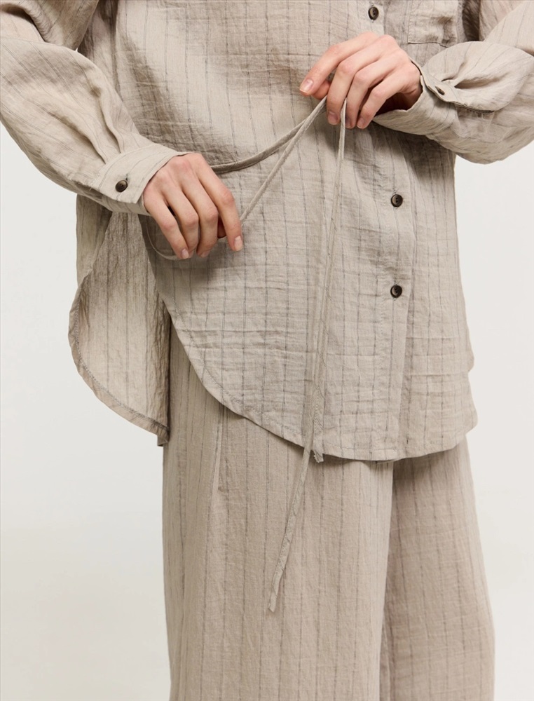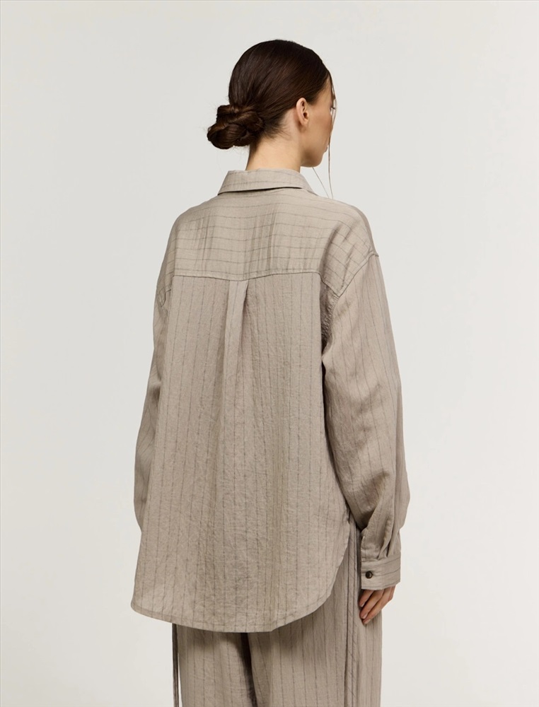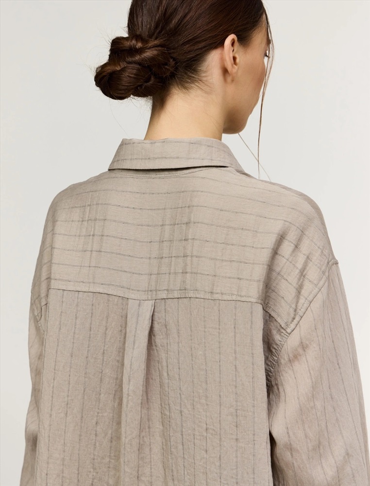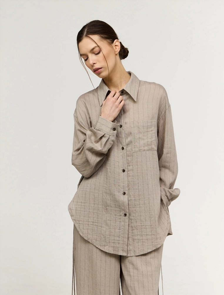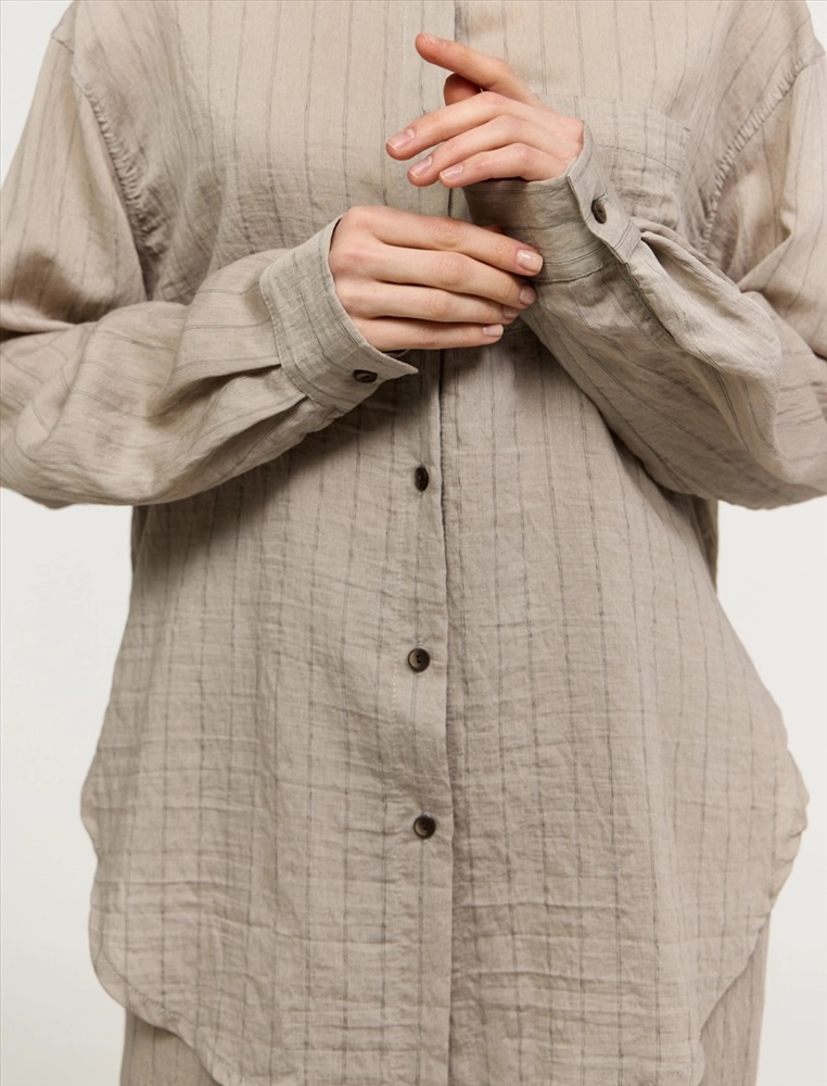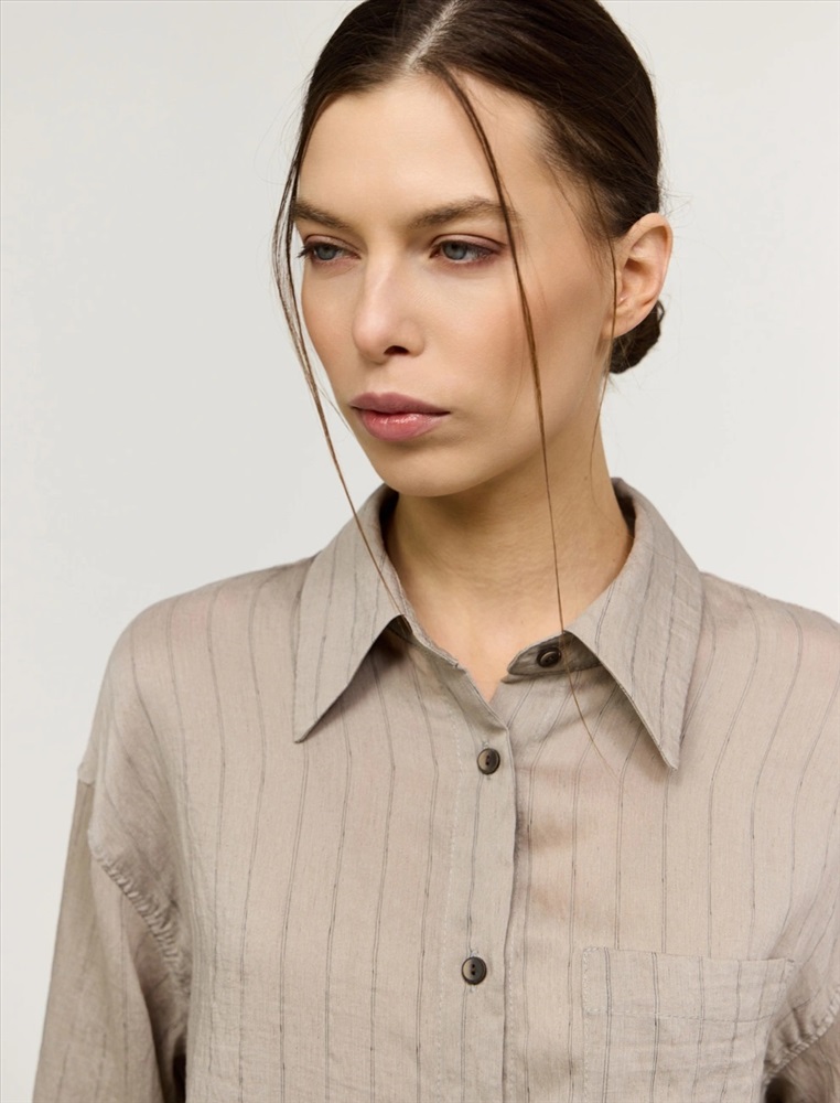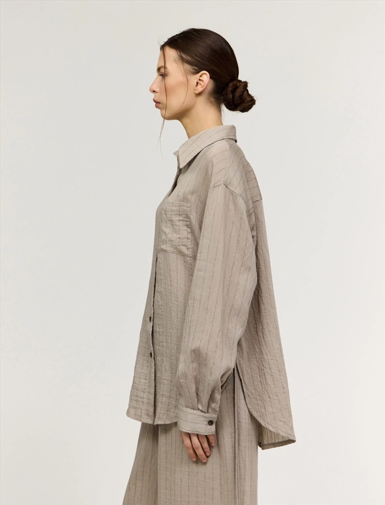 Рубашка оверсайз силуэта. Линия плеча спущена. По горловине отложной воротник. По передней части изделия застежка на пуговицы, слева, на груди накладной карман. Выполнена из хлопка, тенсела и льна. Представлена в бежевом оттенке в тонкую полоску.