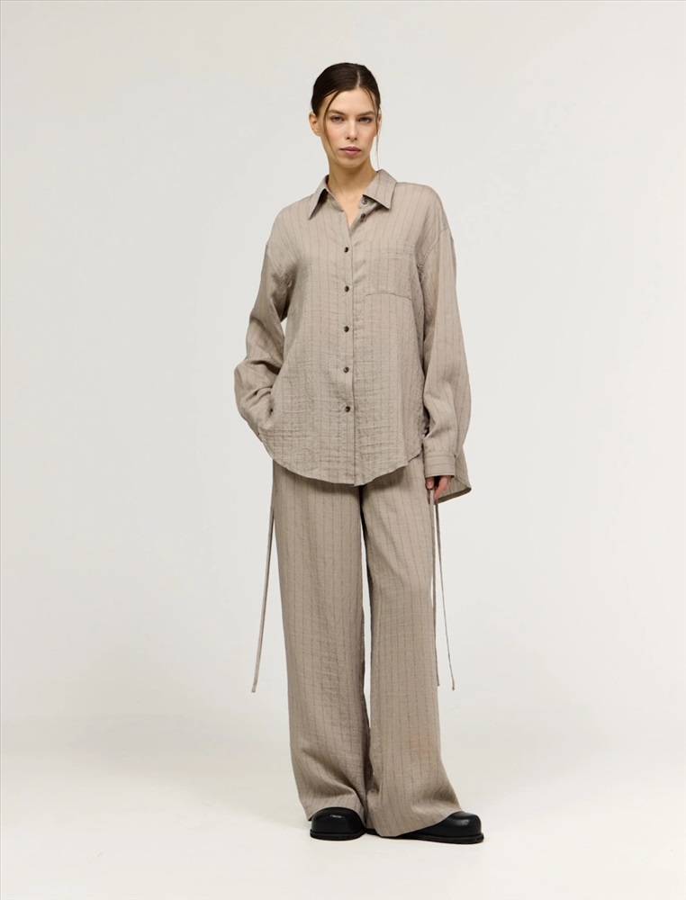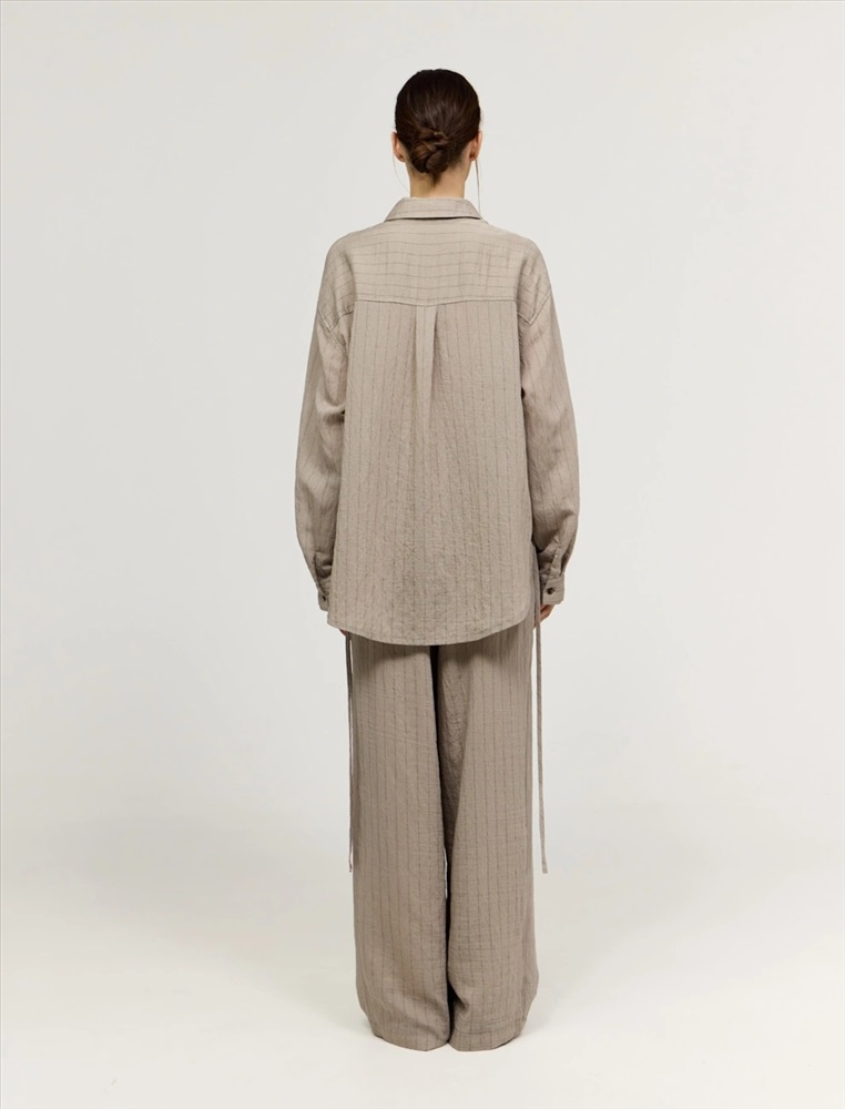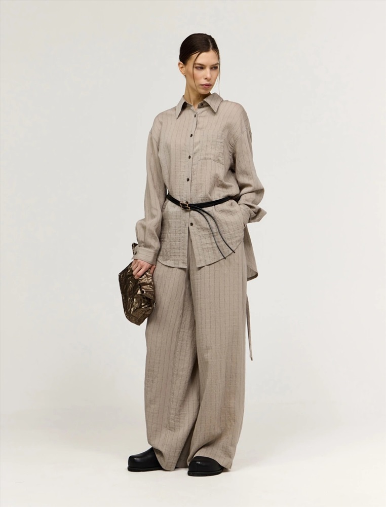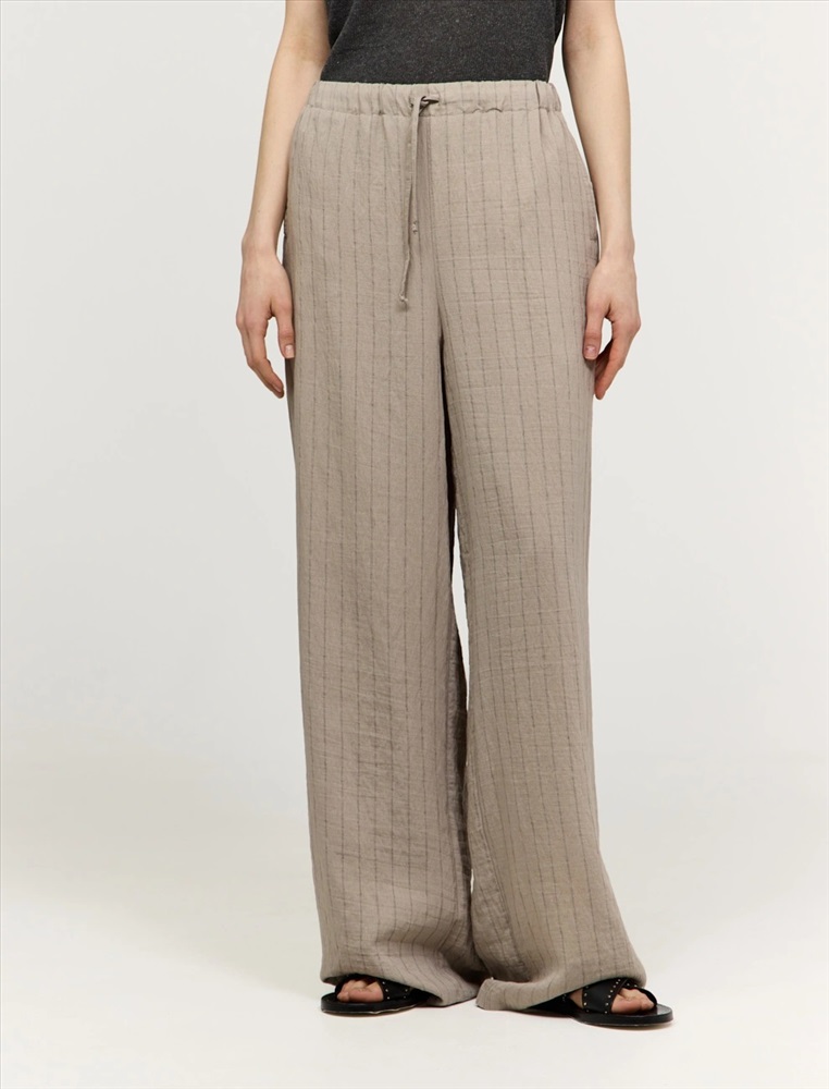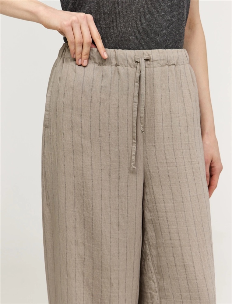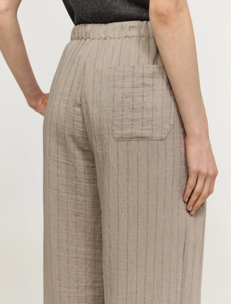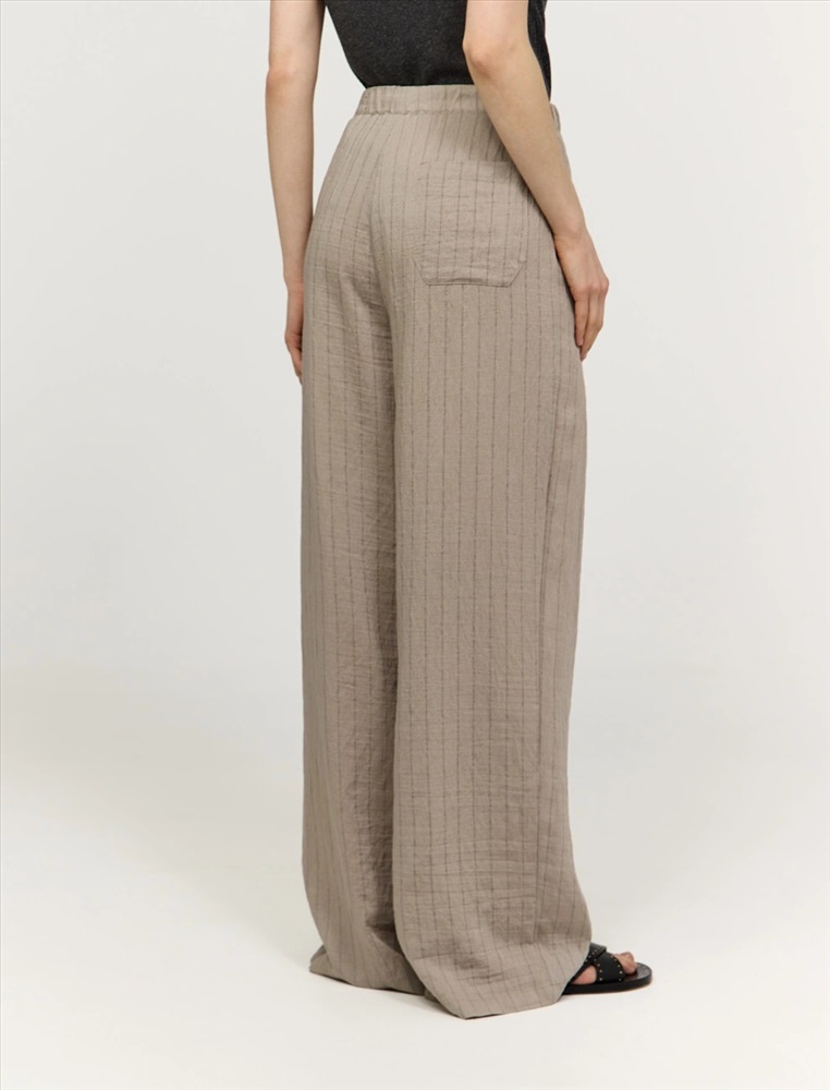 Брюки-палаццо прямого силуэта, посадка на талии. По поясу эластичная резинка и шнурок для затягивания. По бокам косые карманы. В составе ткани хлопок, тенсел, лен. Представлены в бежевом оттенке в тонкую полоску.