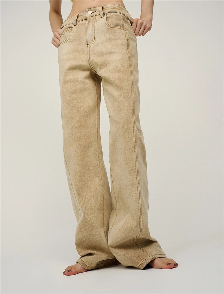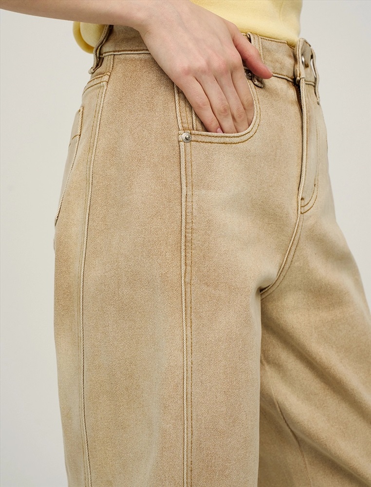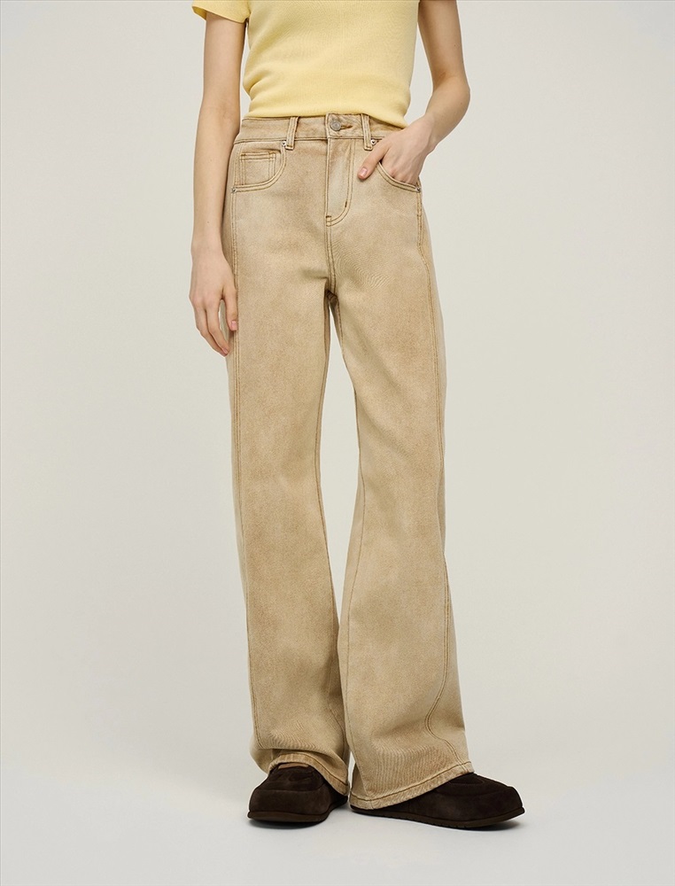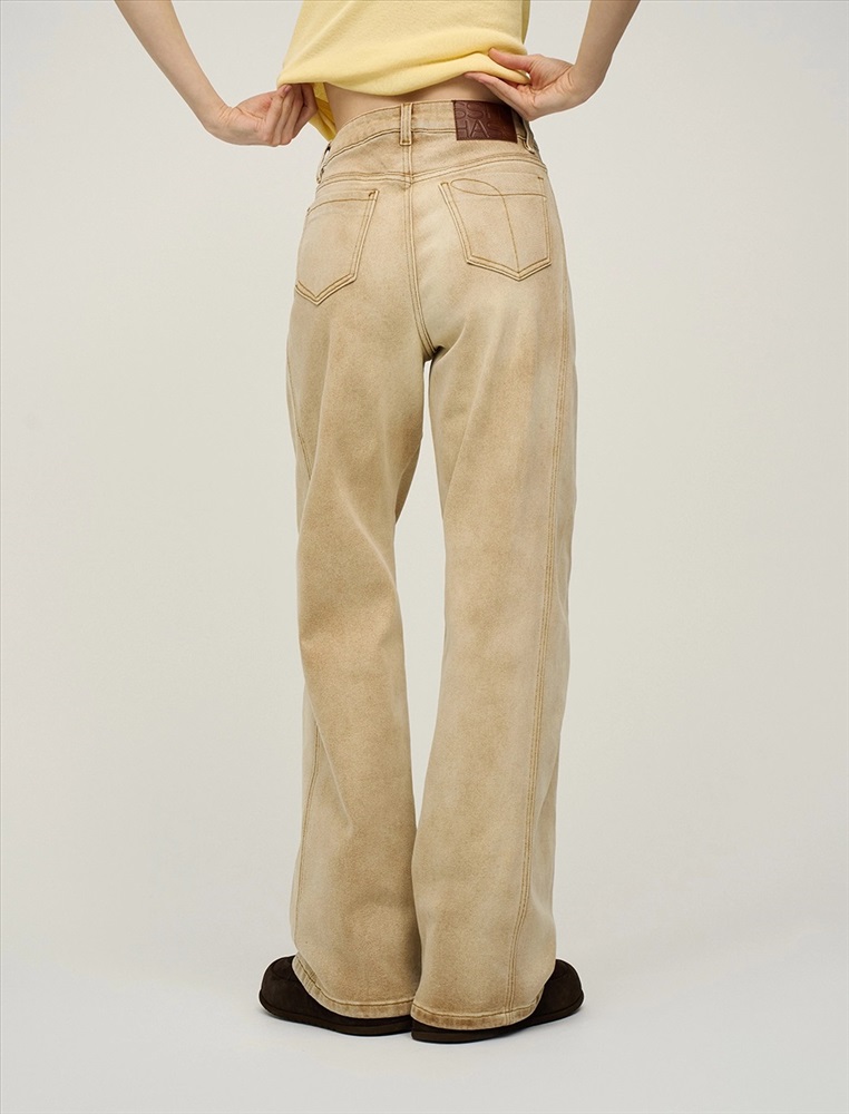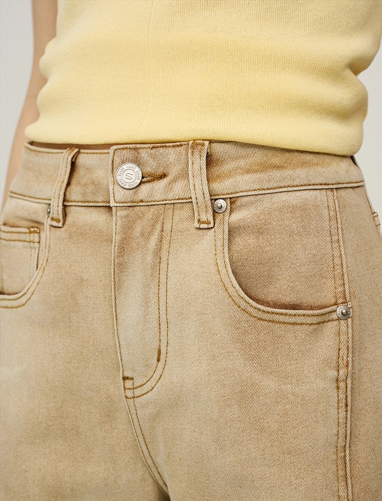 Джинсы прямого силуэта с посадкой на уровне талии. По поясу шлевки для ремня. По передней части изделия – классический гульфик, застежка на пуговицу и три кармана. Сзади кокетка, накладные карманы и брендированный патч HASS. Боковые швы перенесены на переднюю и заднюю части изделия, что создает эффект лампасов из основной ткани. Акцентной деталью изделия является варка. Выполнены из хлопка с добавлением спандекса, что обеспечивает комфорт и долговечность. Представлены в бежевом цвете.