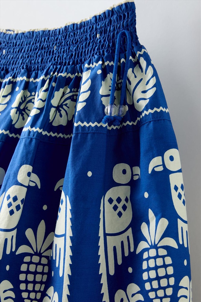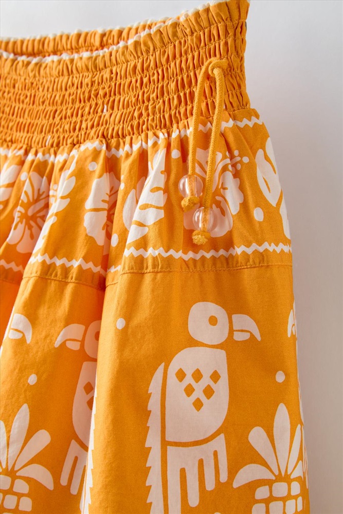 Skirt with an elasticated waistband and beaded drawstrings on the sides. Scalloped hem. COMPOSITION, CARE & ORIGIN COMPOSITION OUTER SHELL 100% cotton LINING 100% cotton Which contains at least: OUTER SHELL 100% OCS certified organically grown cotton LINING 100% OCS certified organically grown cotton CERTIFIED MATERIALS OCS CERTIFIED ORGANICALLY GROWN COTTON This fibre is produced using no artificial fertilisers or pesticides and is grown from seeds that have not been genetically modified. We are currently working with the Organic Content Standard (OCS) that monitors the process from the source to the end product. Certified by Intertek 193341 More information CARE Caring for your clothes is caring for the environment. Lower temperature washes and delicate spin cycles are gentler on garments and help to protect the colour, shape and structure of the fabric. Furthermore, they reduce the amount of energy used in care processes.