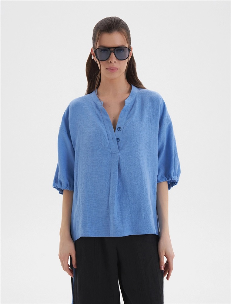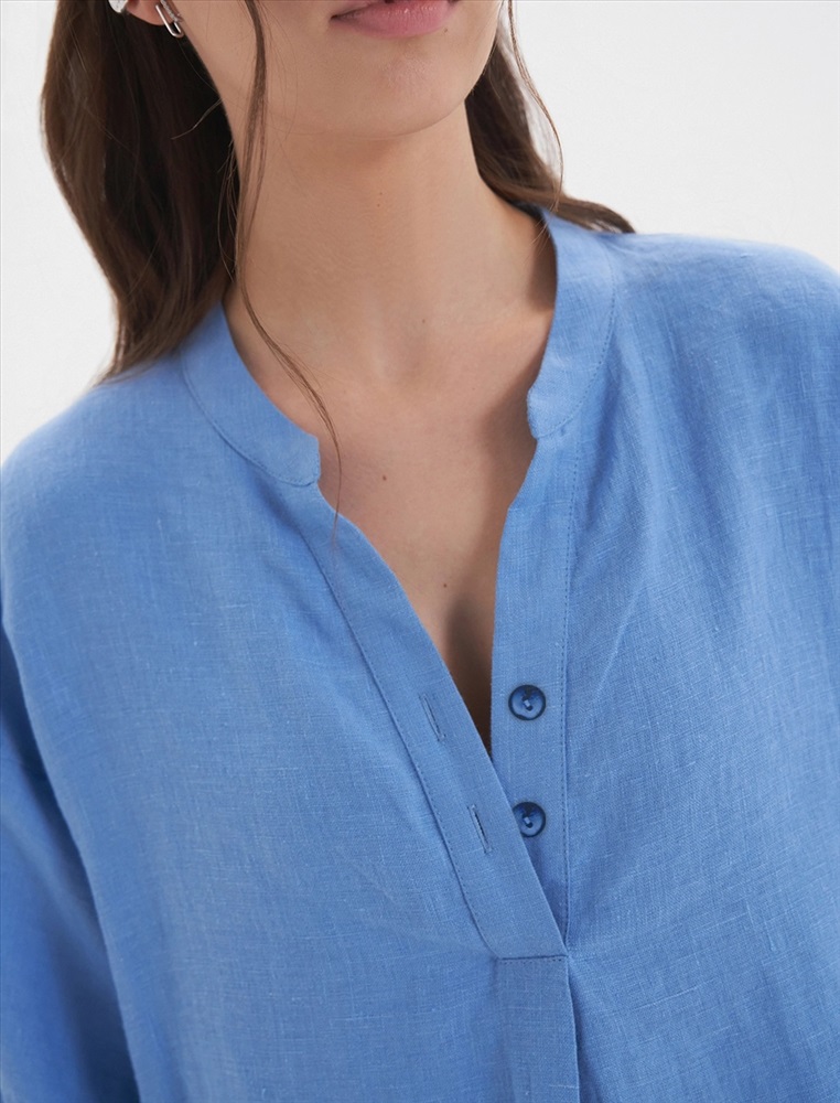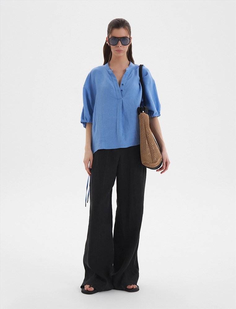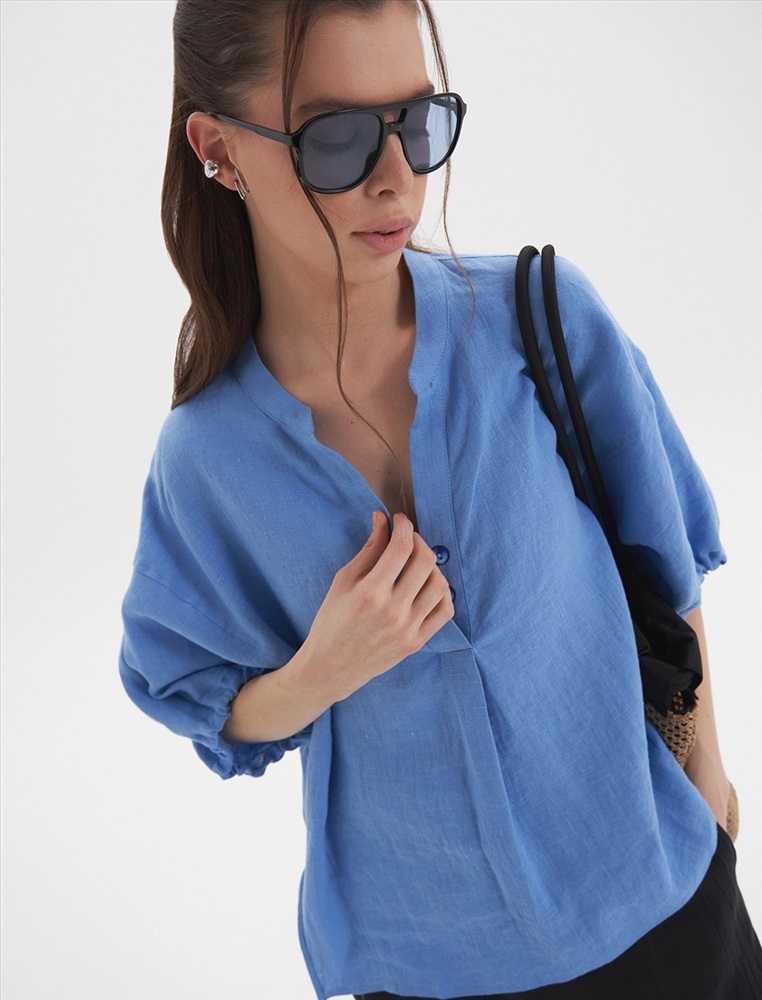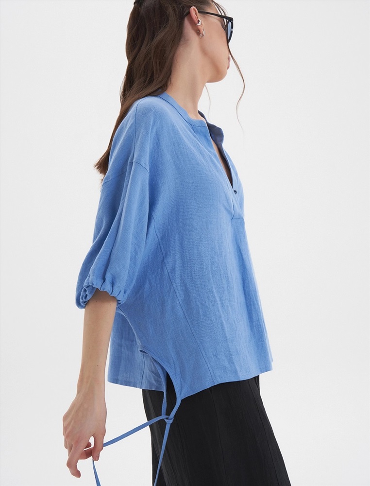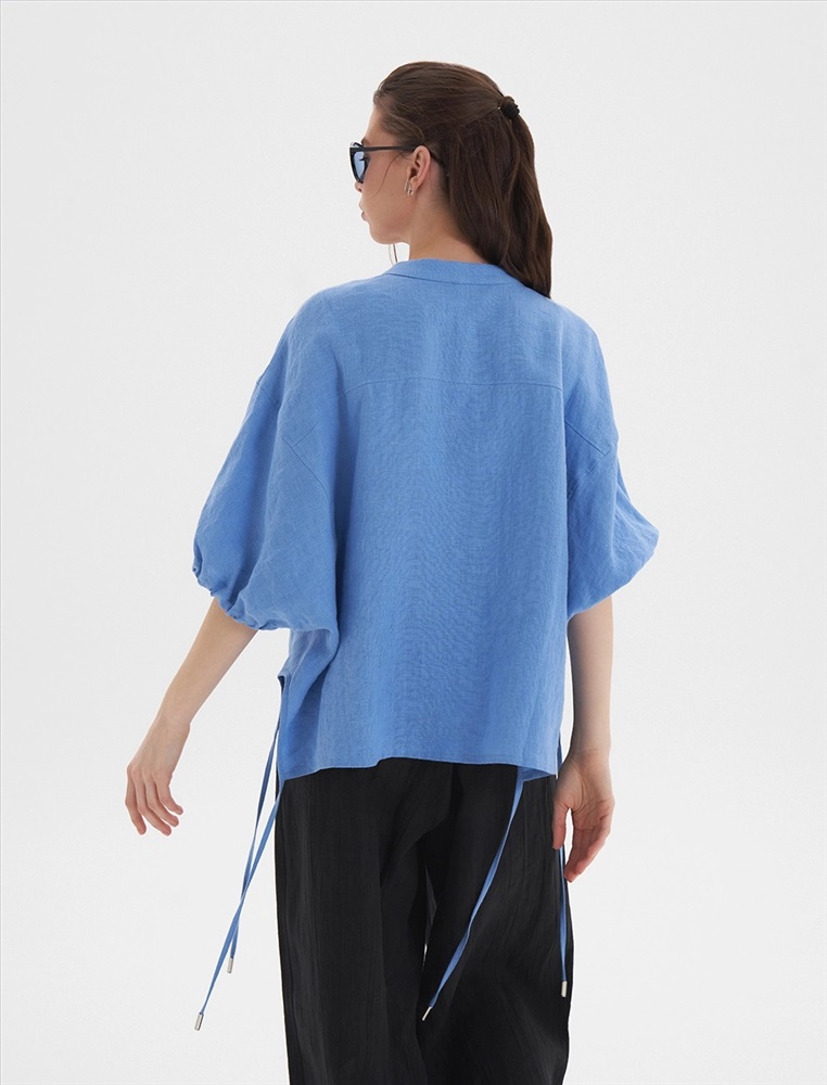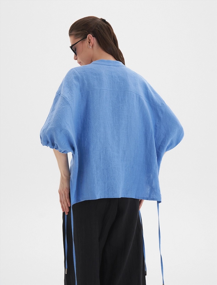 весна-лето 100% Лен Блуза oversize силуэта с воротником-стойкой и горловиной по типу V-neck. Рукава по длине до уровня локтя. На воротнике застежка на пуговицы. По низу рукавов - резинка, а по бокам - шнурки с концевиками. Изделие выполнено из 100% льна. Комментарии к товару