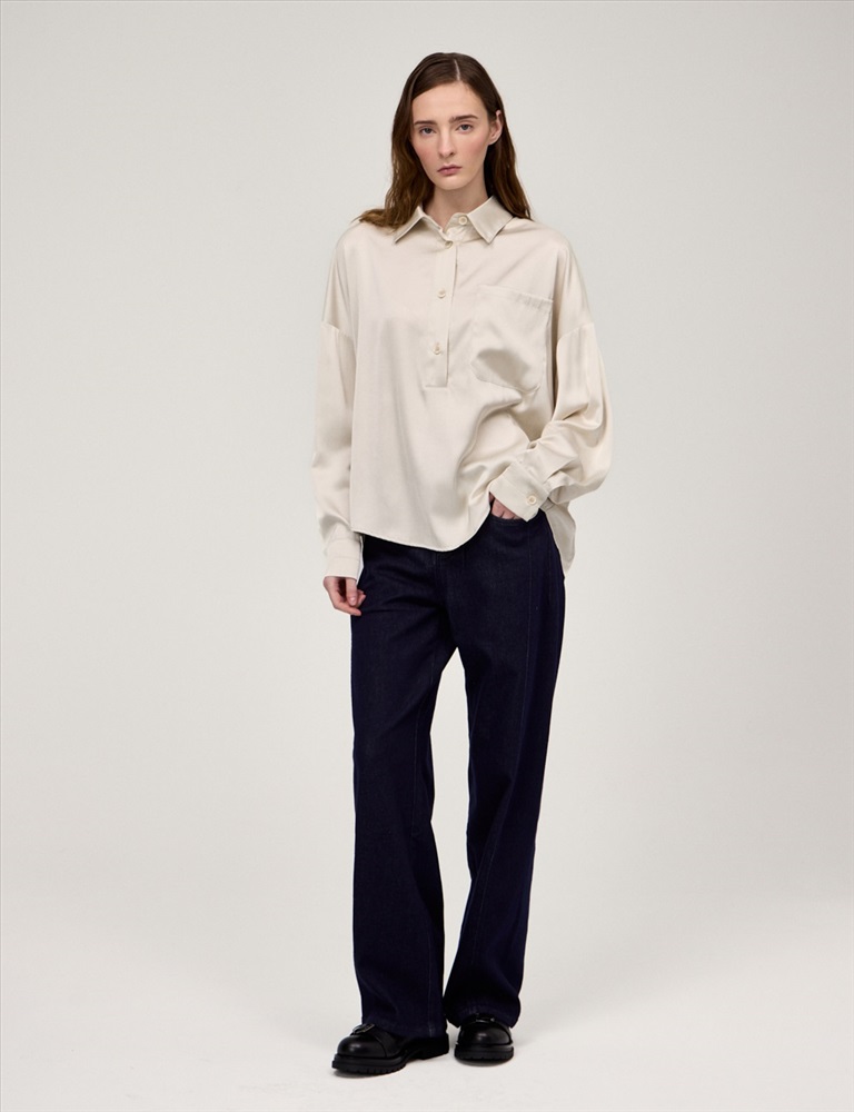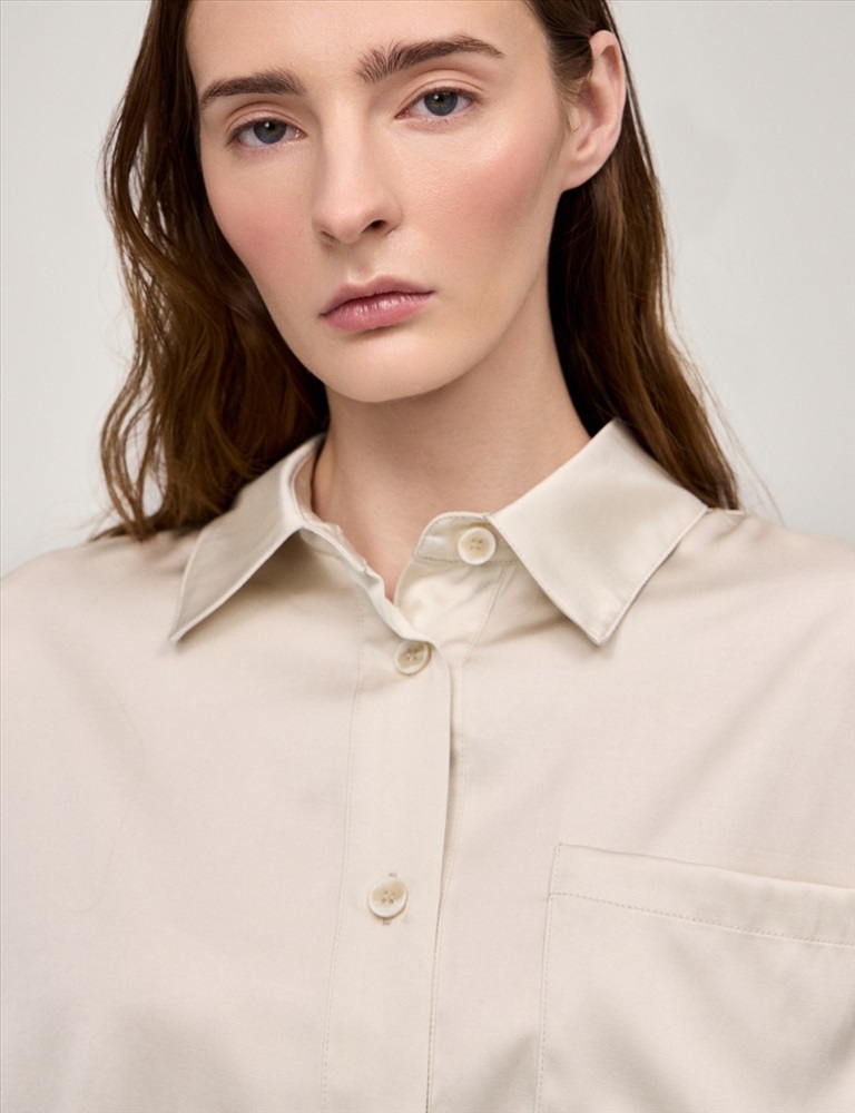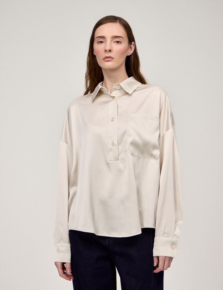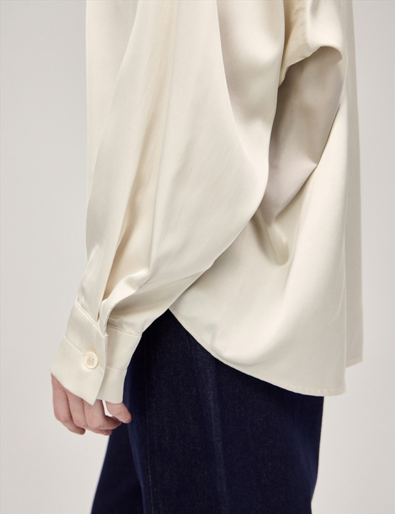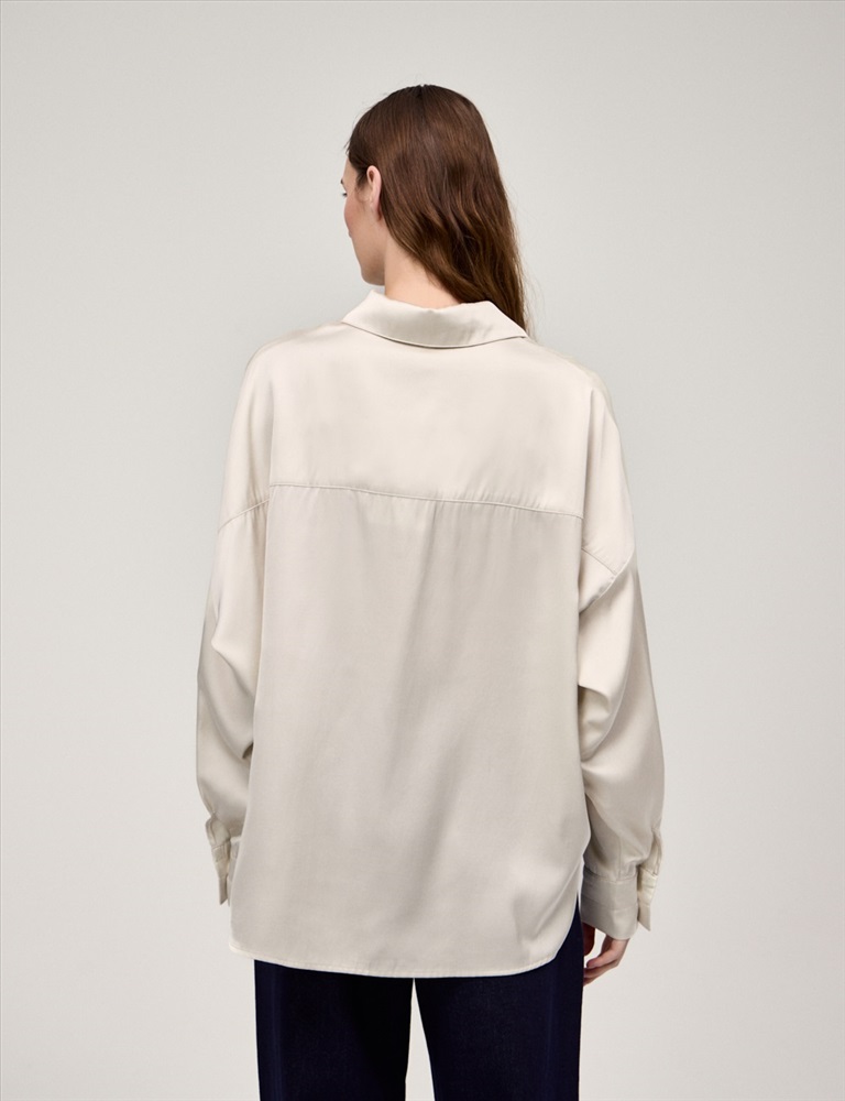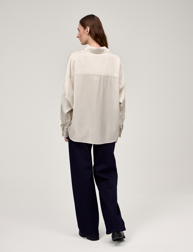 Видео: https-//hassfashion.ru/upload/iblock/d27/x3ef5rleqy0k0zimqttecekrrilrbc7r.mp4 осень-зима 100% Ацетатный шелк Рубашка силуэта оверсайз. Линия плеча спущена. По передней части изделия — планка-застежка на пуговицы, доходящая до уровня талии, отложной воротник и нагрудный накладной карман. Манжеты застегиваются на пуговицы. На спинке кокетка. Выполнена из 100% ацетатного шелка. Представлена в бежевом цвете.