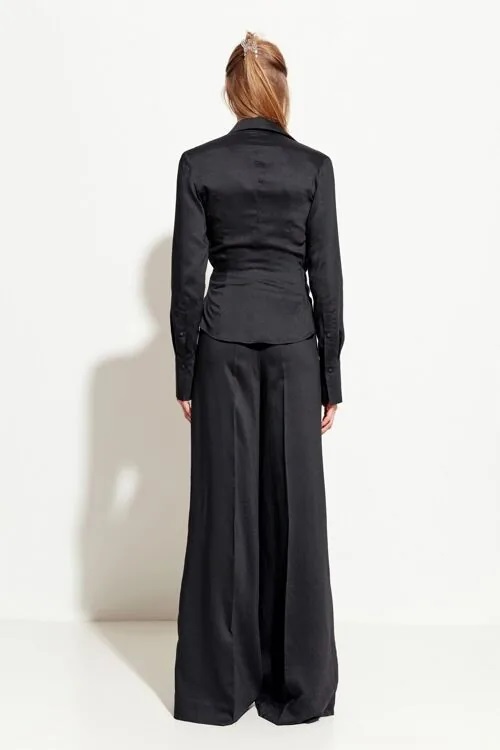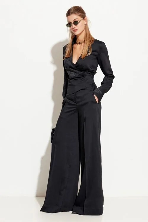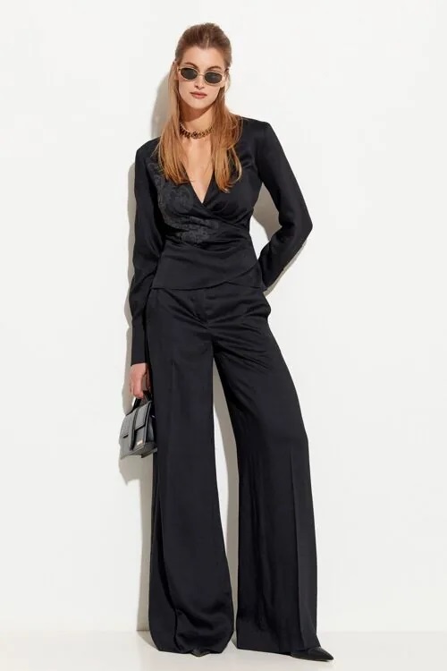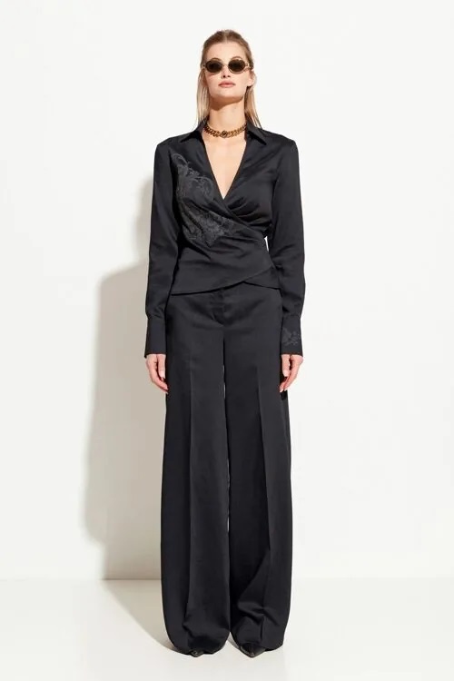 Блуза на запах прилегающего силуэта, длиной выше линии бедер. Воротник отложной. Глубокий V-образный вырез. На груди справа и левой манжете декор в виде кружева, который добавляет образу романтичности и легкости. Классическая модель, которая сочетается с любым низом. Идеальный вариант для образов по особым случаям.