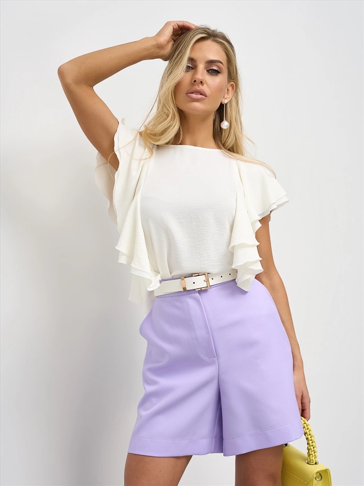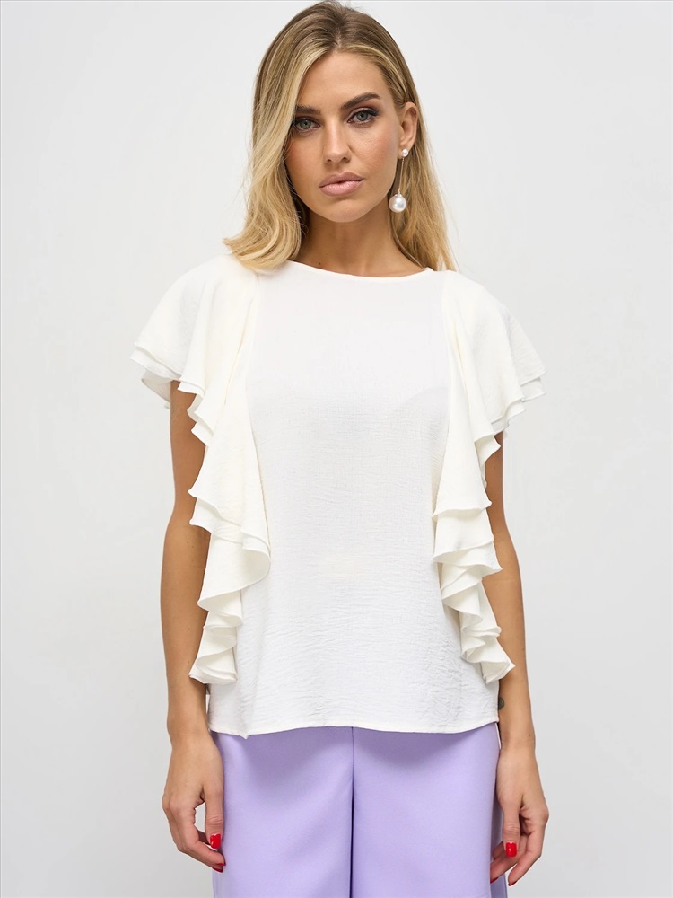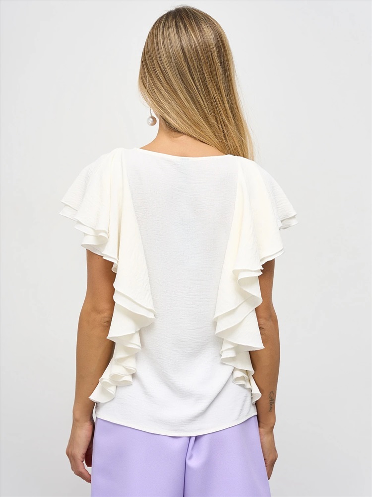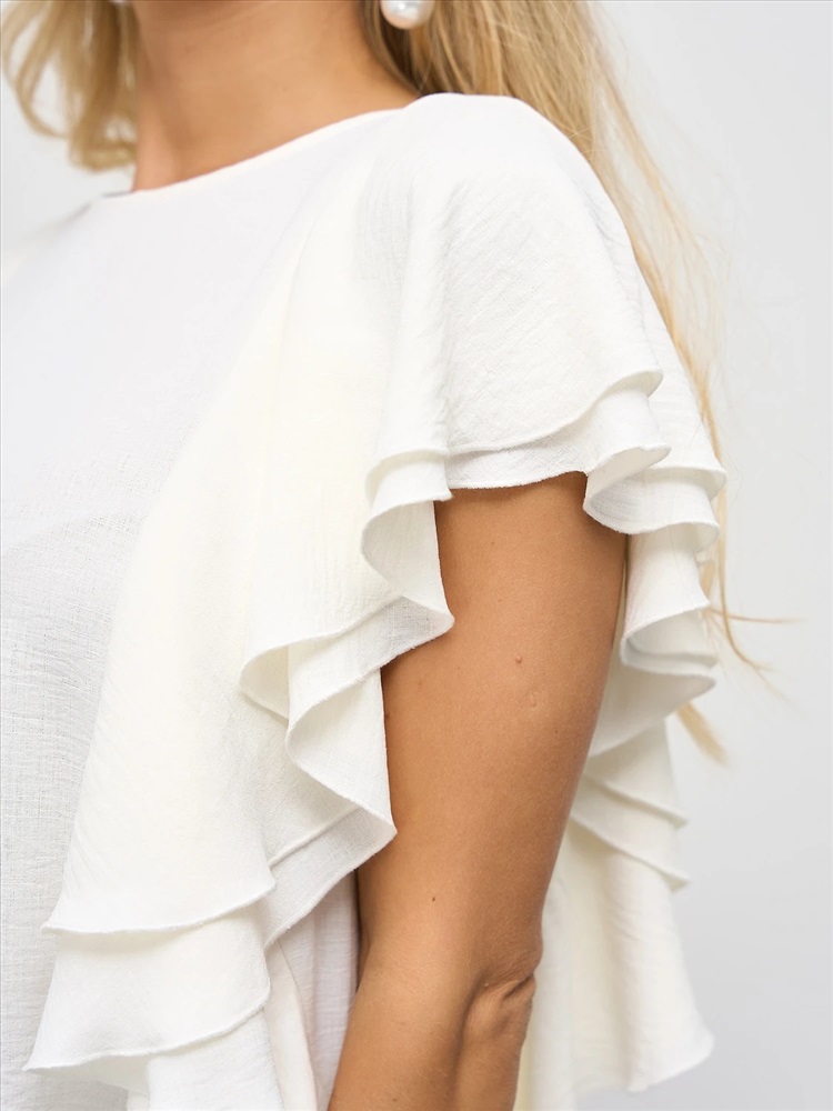 Перед и спинка изделия декорированы двойным пришивным воланом, который мягко ложится на плечо и имитирует рукав. Комментарии к товару