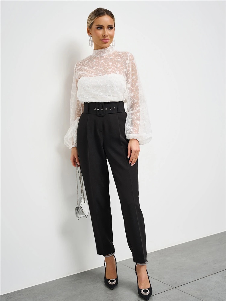 Длинные объемные рукава на резинке. Воротник-стойка. В верхней части спинки расположен разрез в виде капли, который фиксируется застежкой на кнопку. Топ не входит в комплект. Комментарии к товару