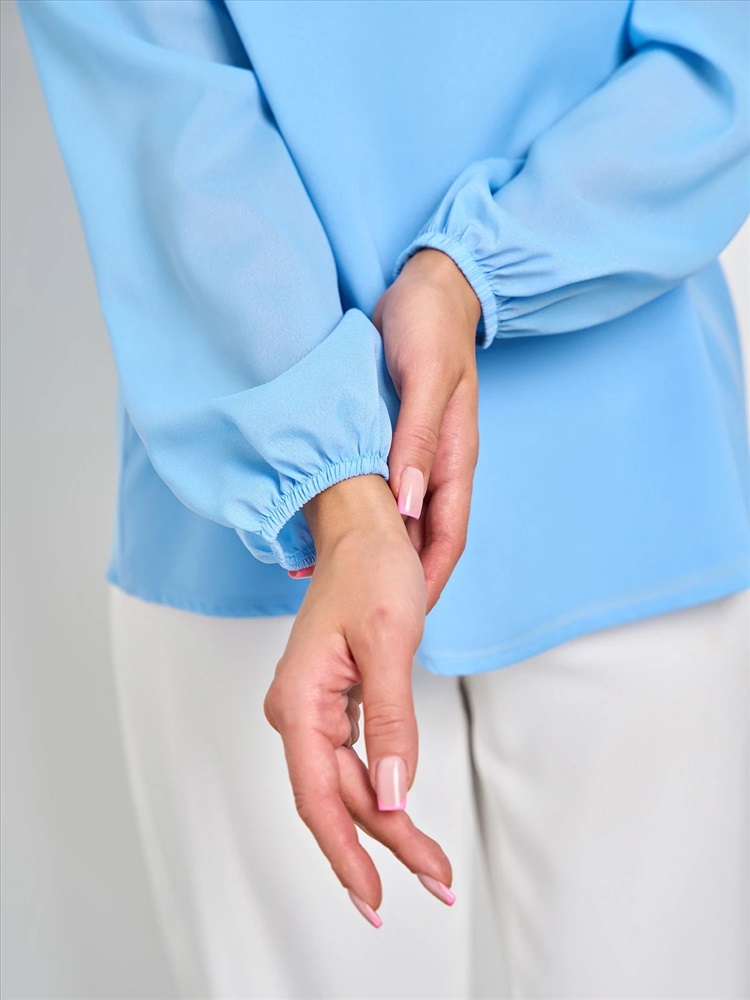 Длинные втачные рукава оканчиваются сборкой на резинку.