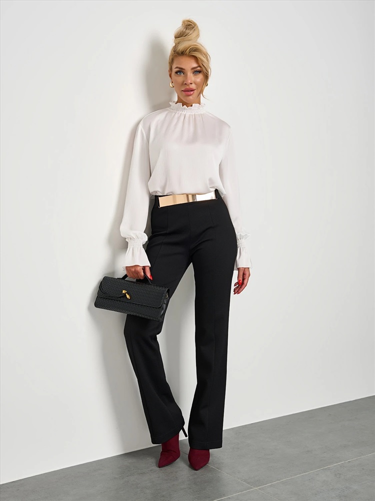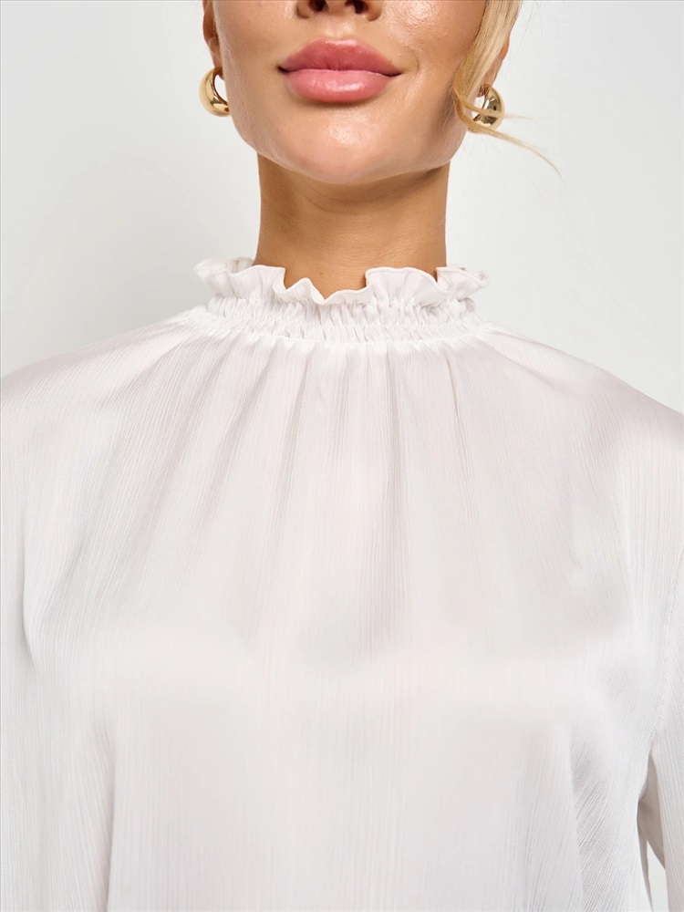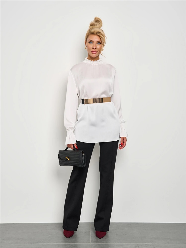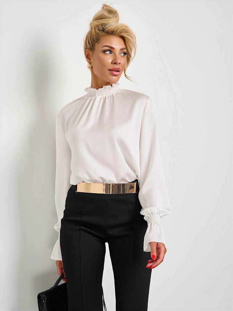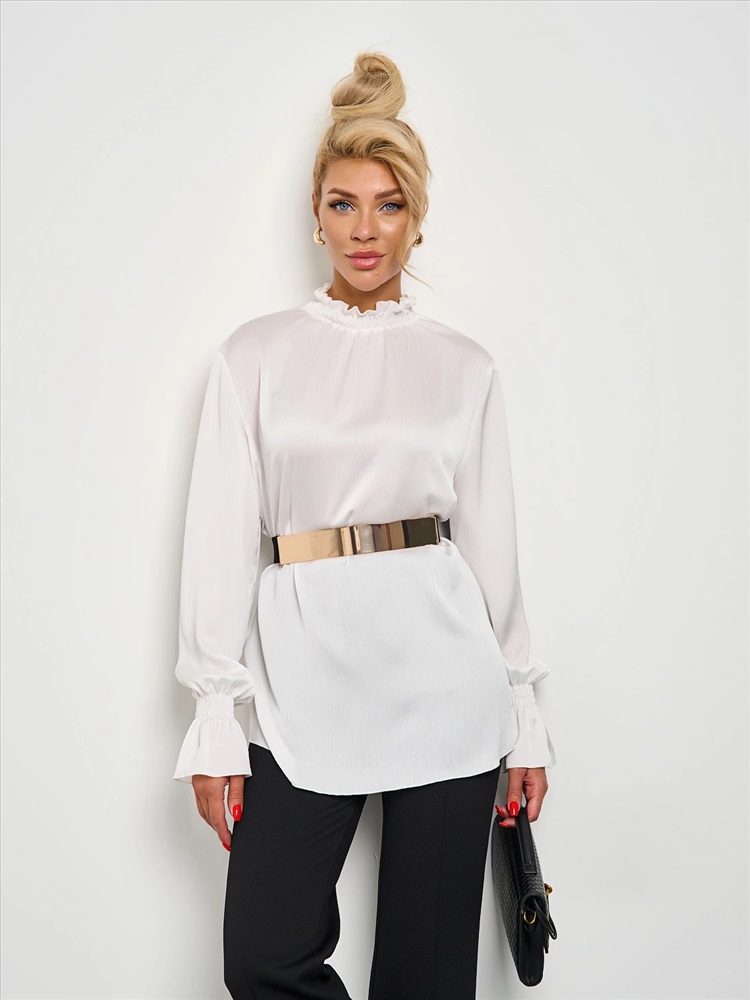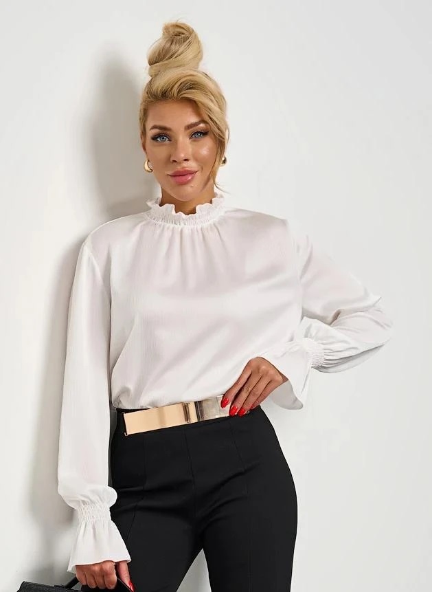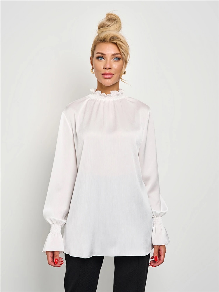 Круглый вырез горловины с воротником-стойкой со сборкой на резинку-нитку. Длинные втачные рукава оканчиваются сборкой на резинку-нитку. Комментарии к товару