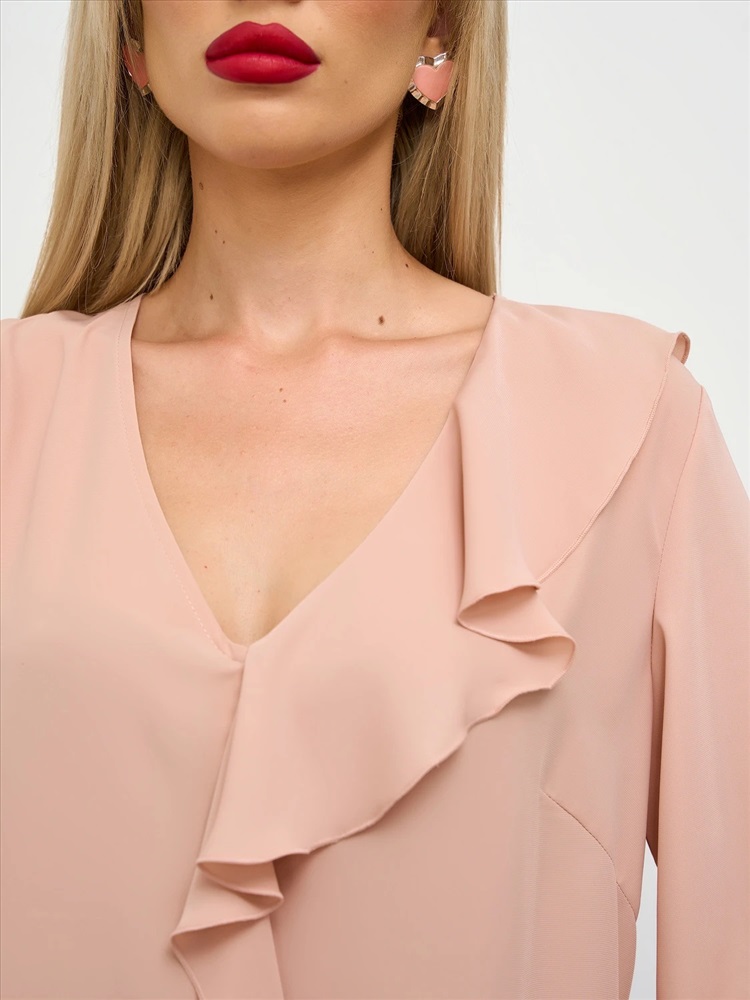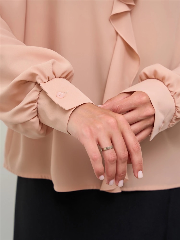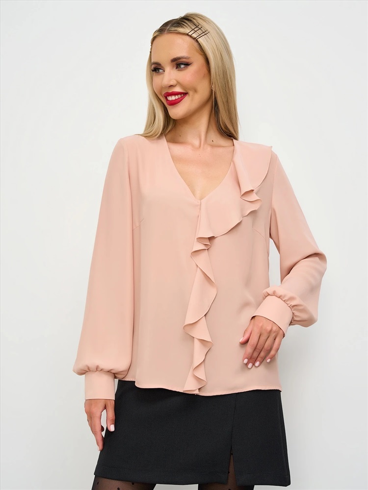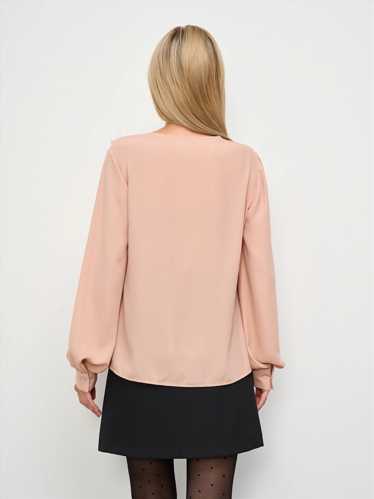 По одному краю горловины пришит волан, который уходит в средний шов блузки по переду.