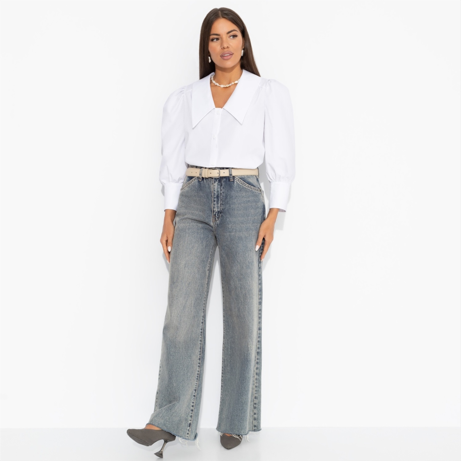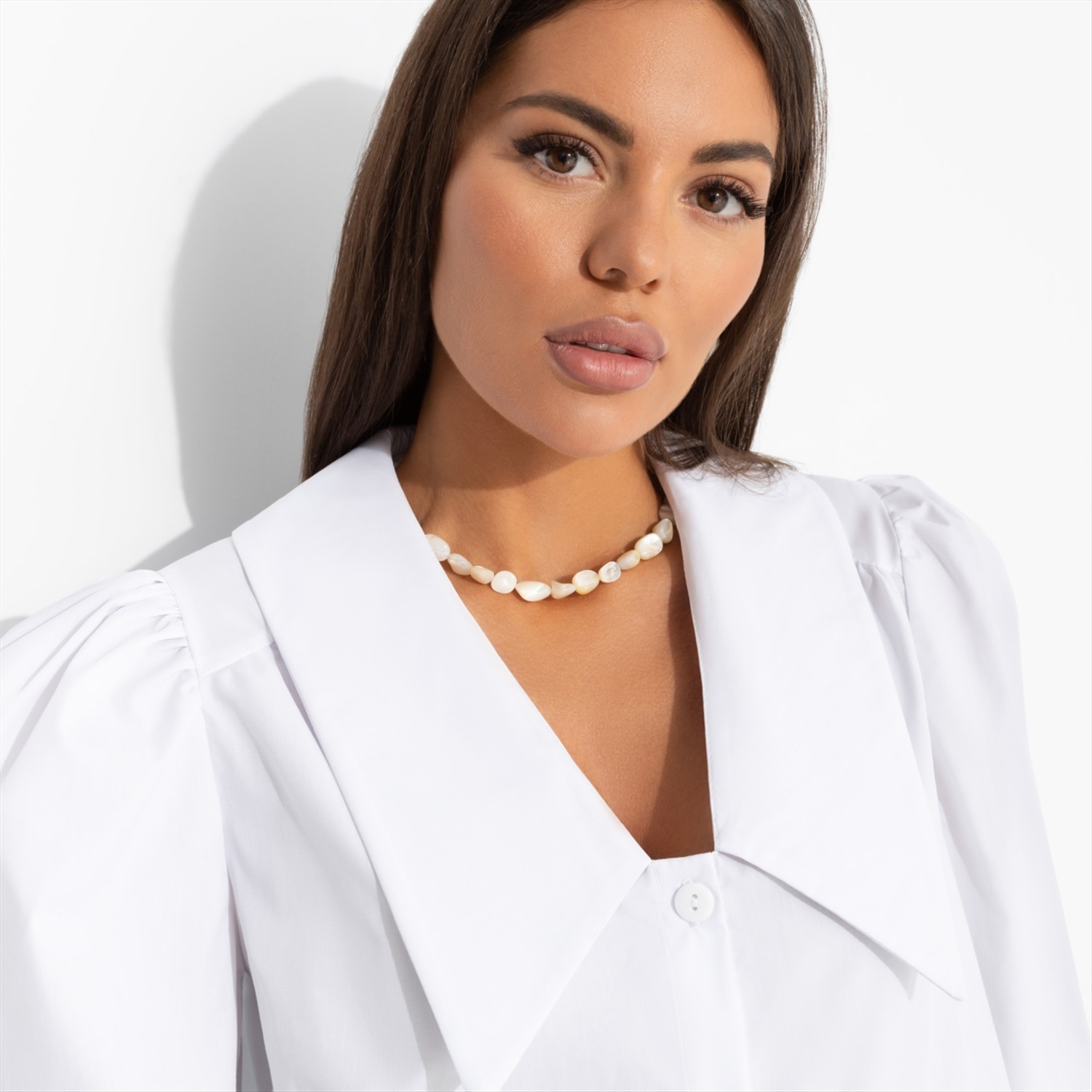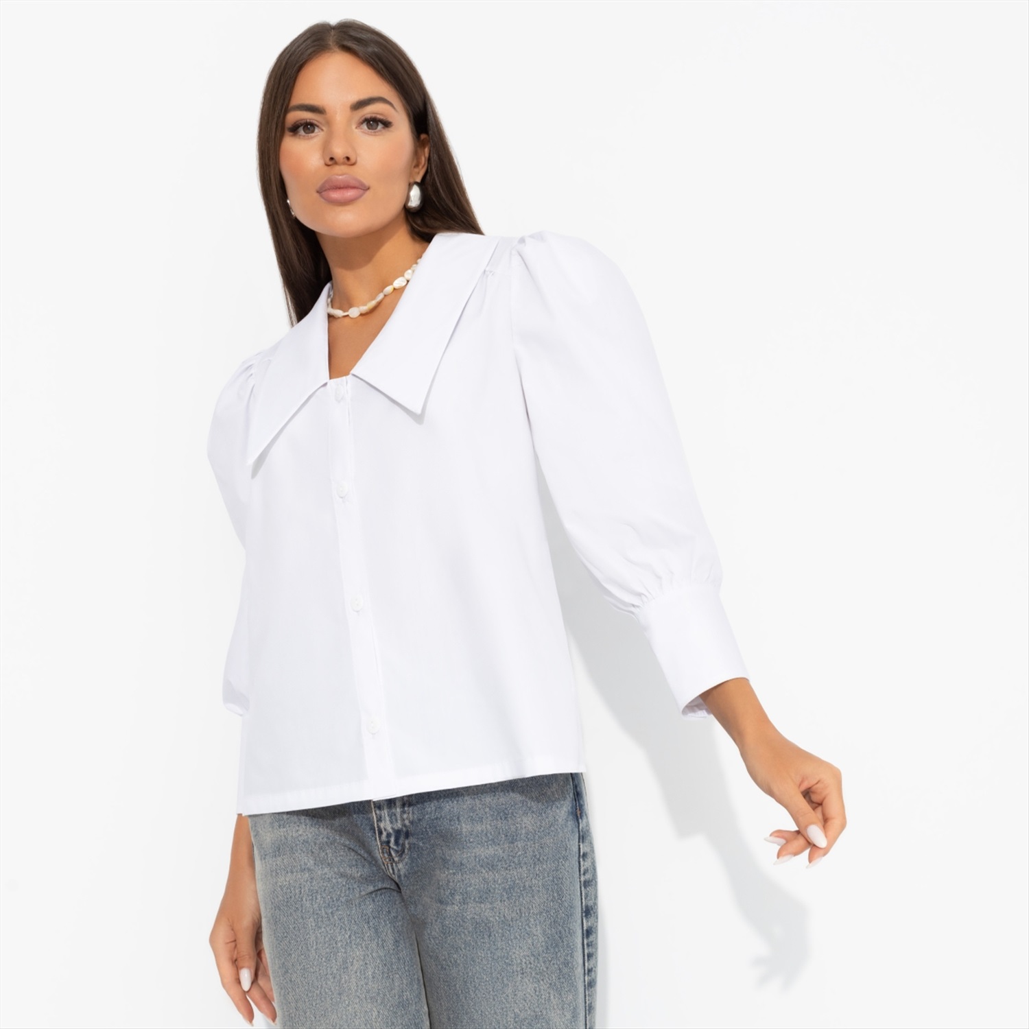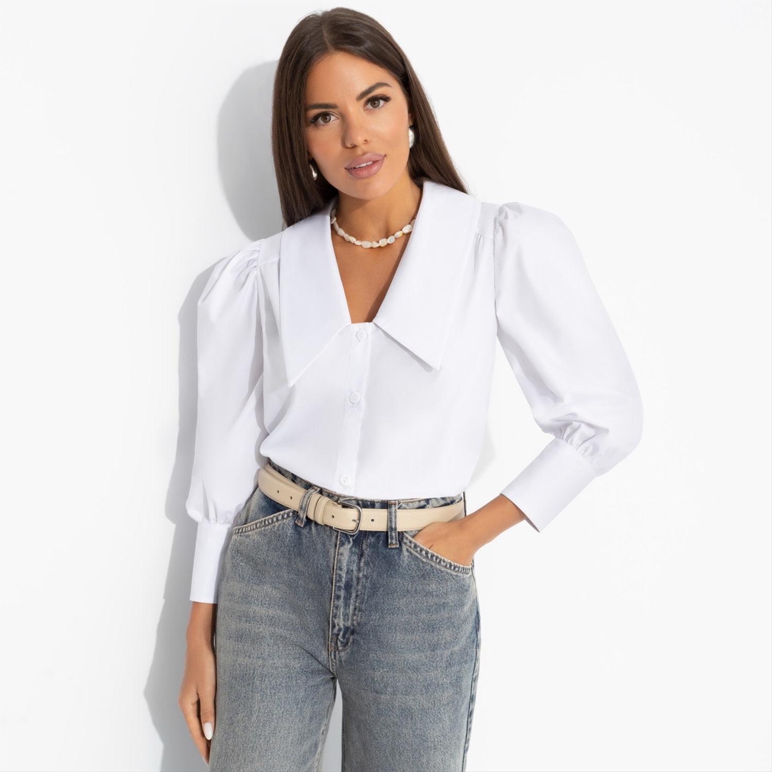 Состав: «Поплин тиси» (90% хлопок, 10% полиэстер) Плотность ткани: Средняя Тип ткани: Текстиль Вид застежки: Пуговица/-ы Карманы: Нет Основной цвет ткани: Белый Отрезная талия: Нет Подклад: Нет Резинка по талии: Нет Рисунок/раппорт: Нет, все изделия идентичны Сезон: Круглогодичный Силуэт: Прямой Стиль: Классический Параметры модели на фото: