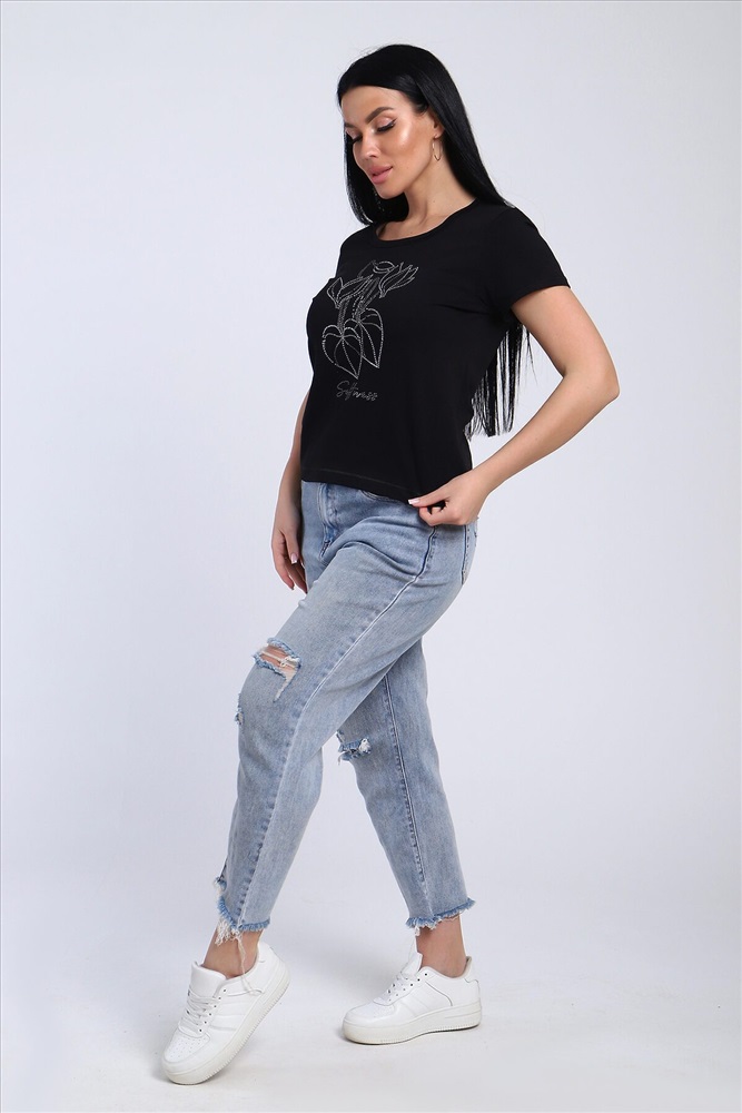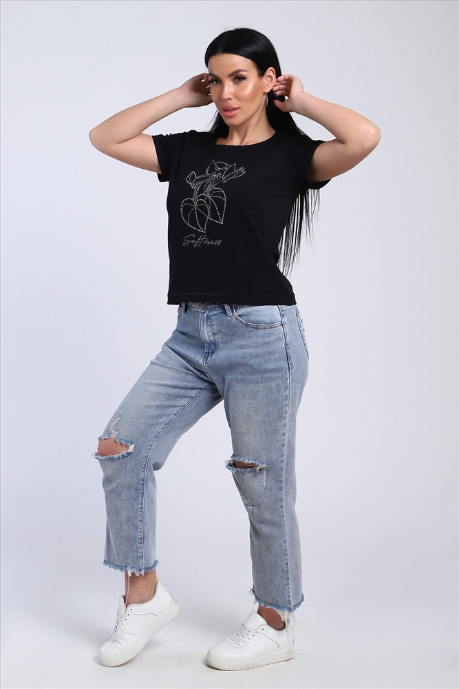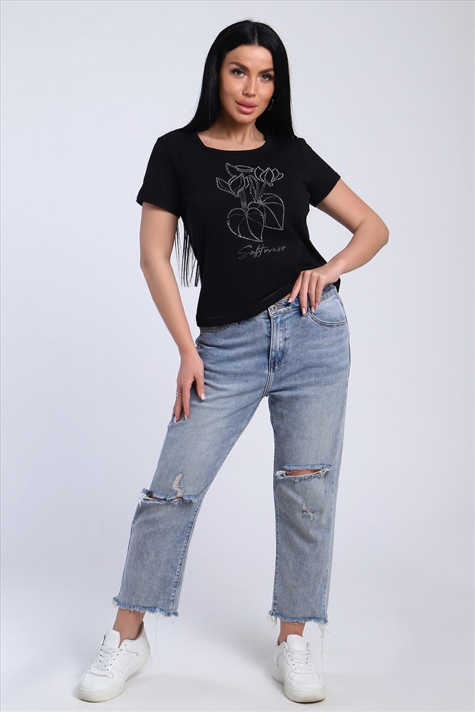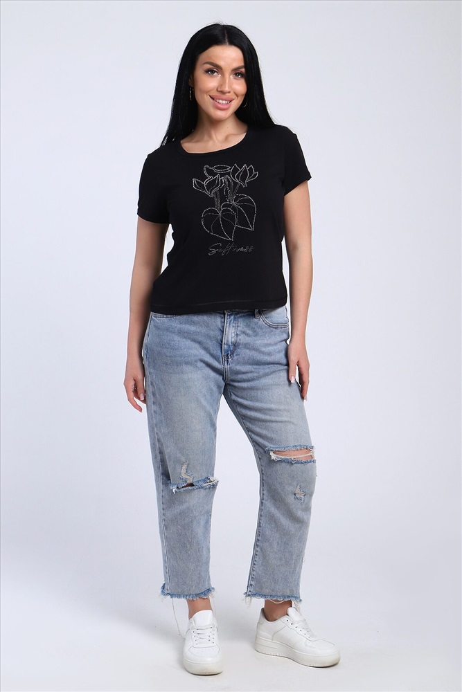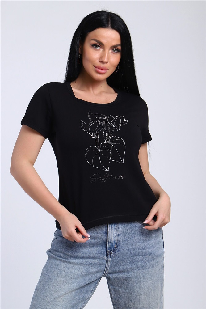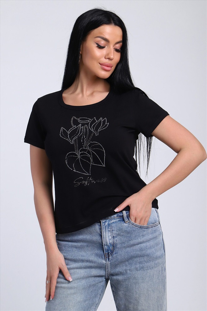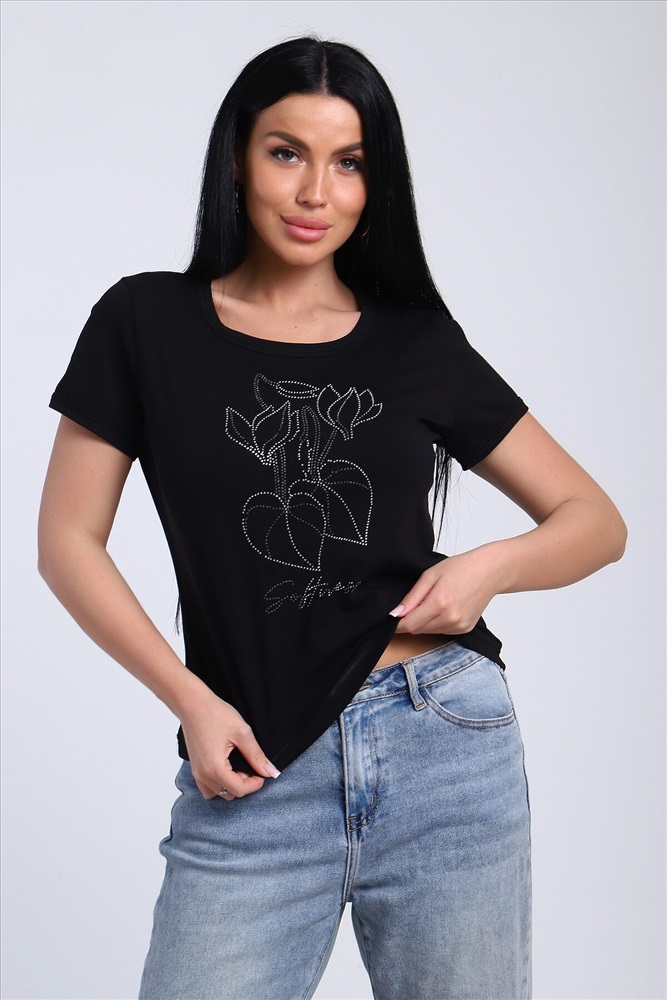 Страна производства: Россия Футболка женская со стразами, ткань мягкая и приятная к телу. Базовая футболка это отличный вариант для вашего гардероба, ее можно сочетать с любыми вещами.