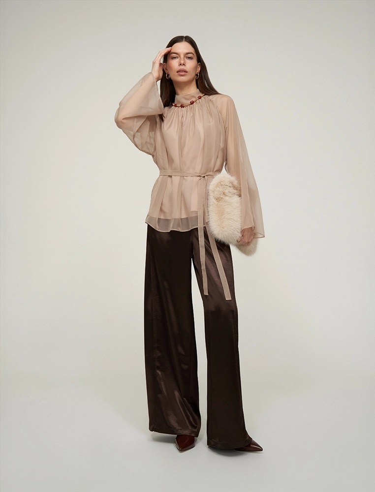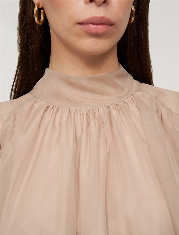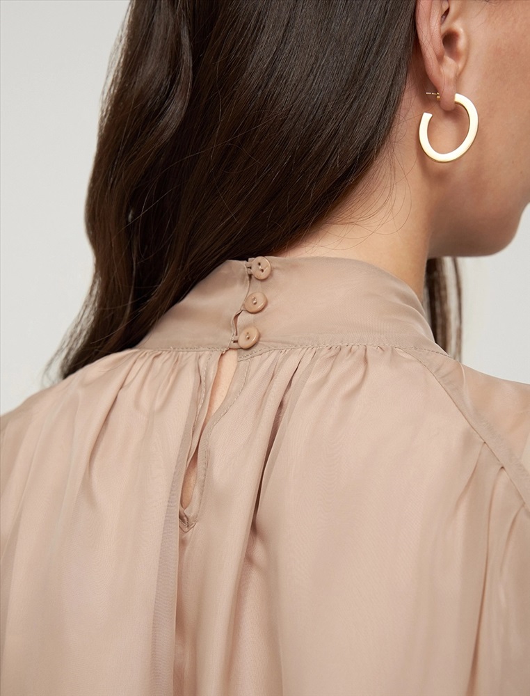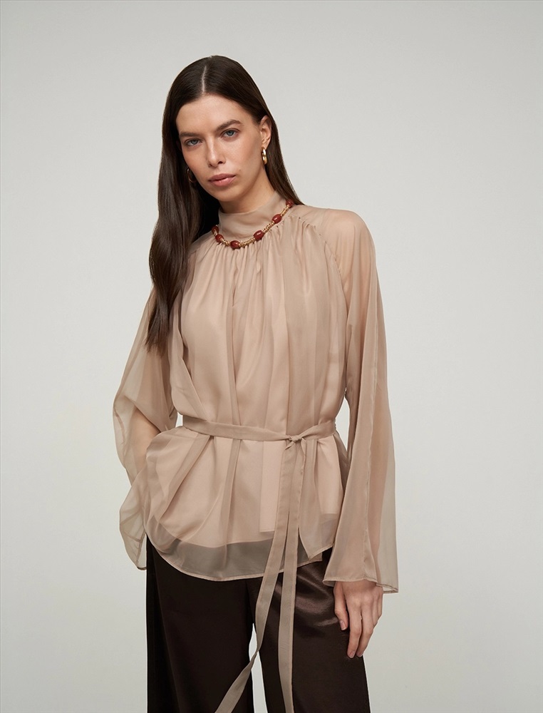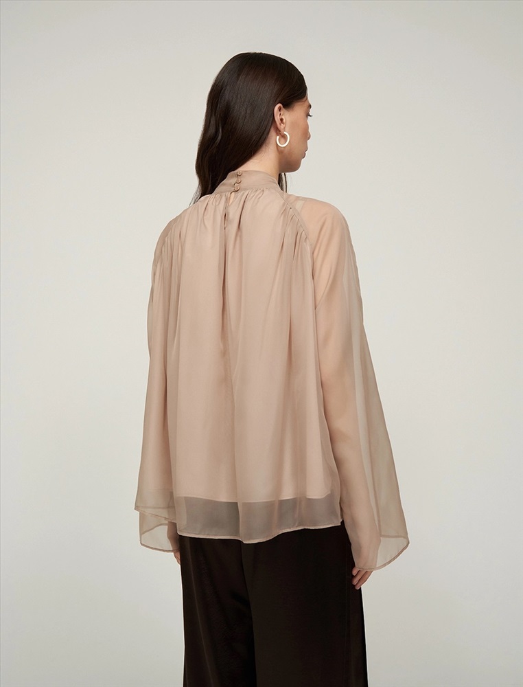 Видео: https-//hassfashion.ru/upload/iblock/99d/b3frv1qw0i008wzfsk2emcke7f19svpo.mp4 осень-зима А: 71% Вискоза, 22% Нейлон, 7% Шелк; В: 78% Вискоза, 22% Нейлон; Блуза свободного силуэта с воротником-стойкой и рукавом по типу реглан. Складки внизу воротника и по пройме рукавов создают объемную сборку. На спинке по воротнику застежка на пуговицы и разрез. Ткань верха выполнена из вискозы (71%), нейлона и шелка, что создает эффект прозрачности, а подкладочная ткань из вискозы (78%) и нейлона. Представлена в бежевом оттенке. В комплекте пояс из ткани верха.