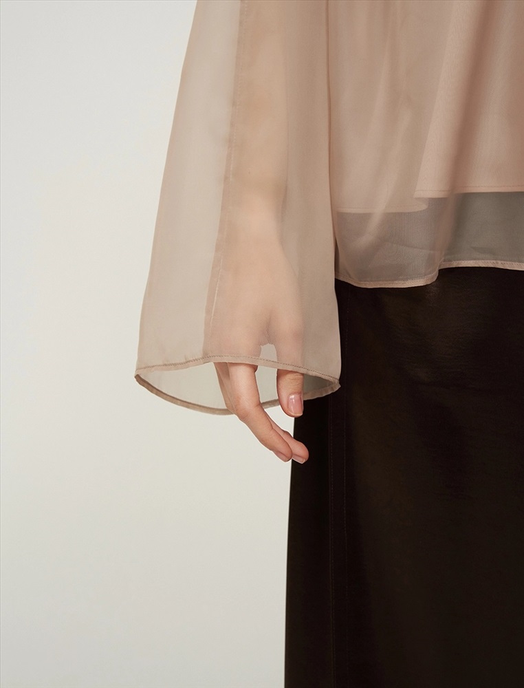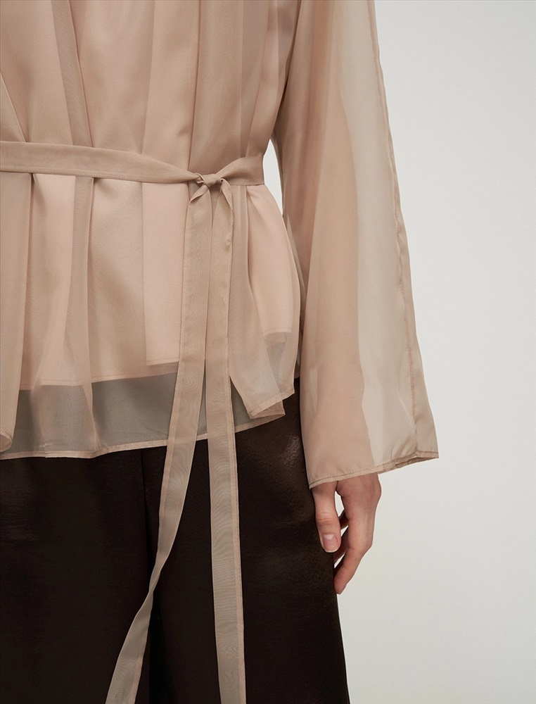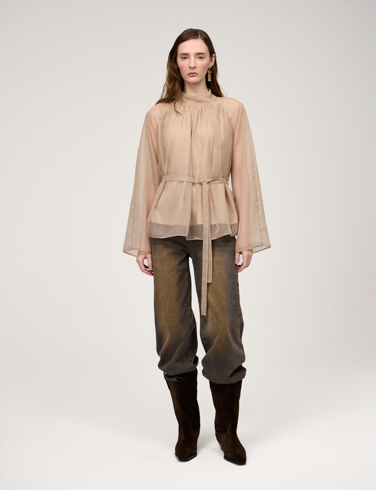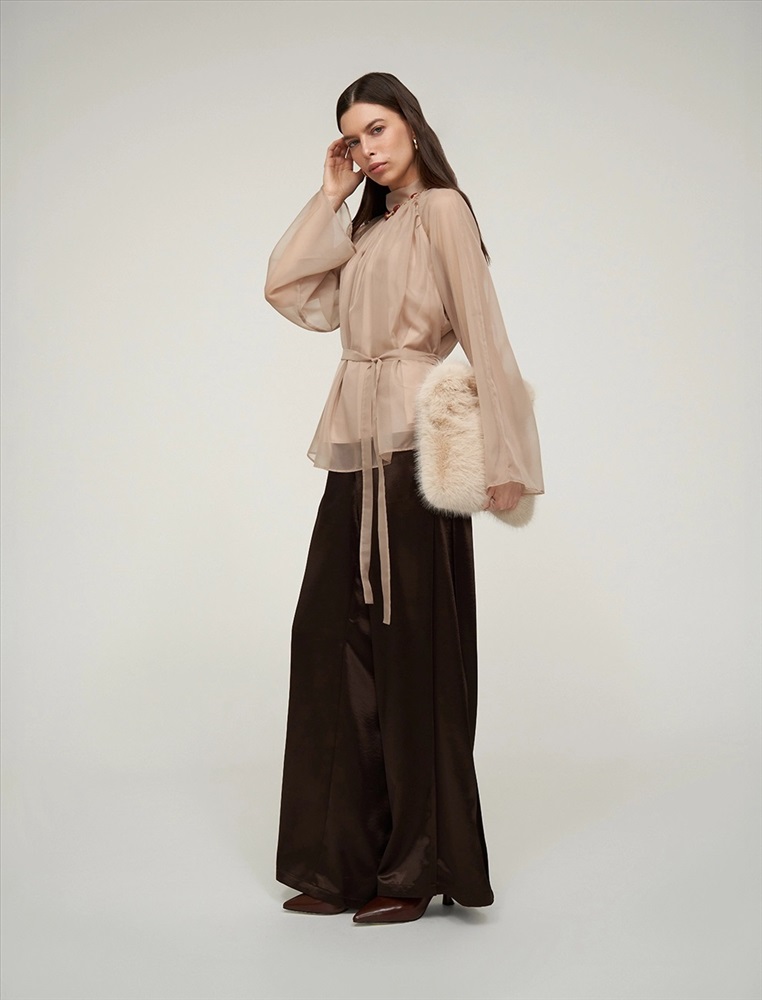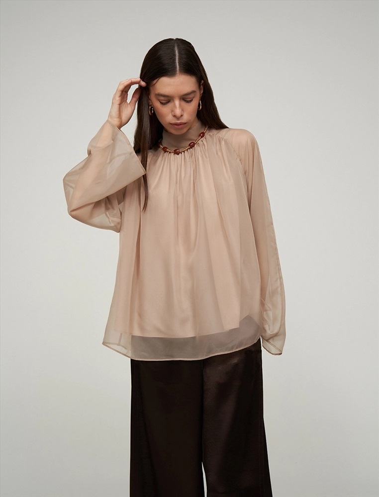 Видео: https-//hassfashion.ru/upload/iblock/99d/b3frv1qw0i008wzfsk2emcke7f19svpo.mp4 осень-зима А: 71% Вискоза, 22% Нейлон, 7% Шелк; В: 78% Вискоза, 22% Нейлон; Блуза свободного силуэта с воротником-стойкой и рукавом по типу реглан. Складки внизу воротника и по пройме рукавов создают объемную сборку. На спинке по воротнику застежка на пуговицы и разрез. Ткань верха выполнена из вискозы (71%), нейлона и шелка, что создает эффект прозрачности, а подкладочная ткань из вискозы (78%) и нейлона. Представлена в бежевом оттенке. В комплекте пояс из ткани верха.