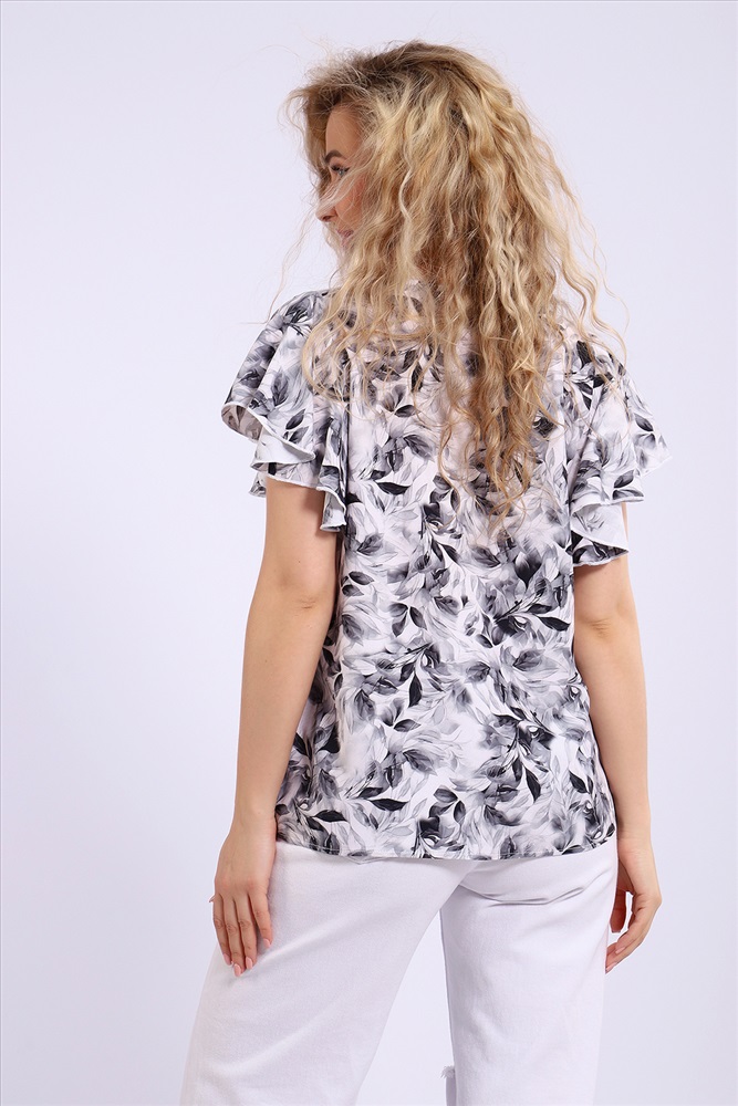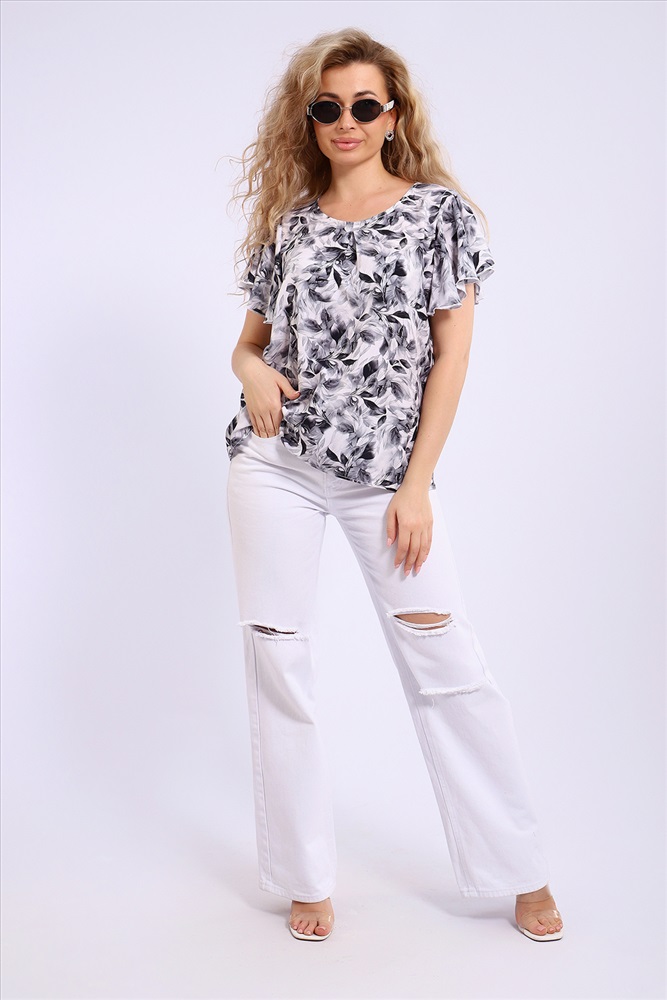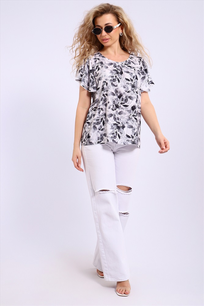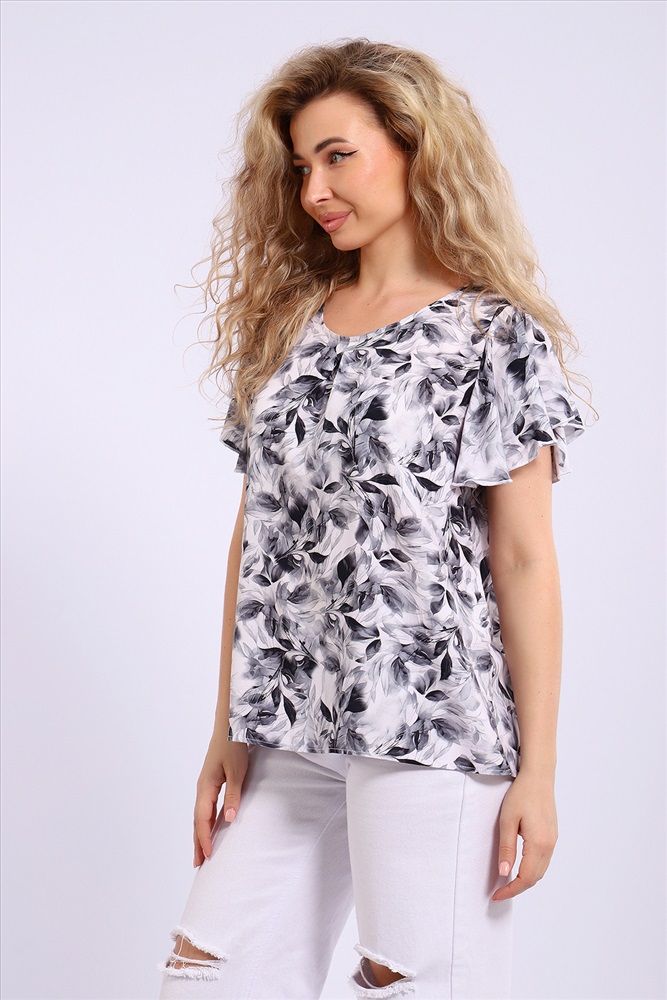 Состав: 100% вискоза Модель: Блузка 32737 Тип товара: блузка Материал: штапель | штапель Бренд: Натали Суслова Карман: без карманов Отделка: с воланами | с волнистым краем Рисунок: геометрия | цветы Рукав: короткий рукав Сезонность: лето | осень | весна Силуэт: свободный Стиль: повседневный Воротник: без воротника Застежка: без застежки Очаровательная женственная блузка для летнего отдыха и не только. Выполнена из натуральной ткани штапель, что обеспечивает комфорт и удобство при носке. Блузка свободного кроя, слегка расклешенная, подходит на любую фигуру. Штапель отлично драпируется, поэтому объемные рукава-крылышки лежат красивыми складками, придавая блузке нарядный вид. Округлая горловина обработана косой бейкой, рукава - краевой спецмашиной. Длина изделия до линии бедра. Черно-белая гамма расцветок позволит комбинировать блузку с юбкой или брюками разных цветов. Таблица размеров и веса