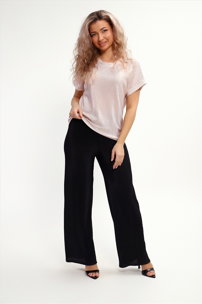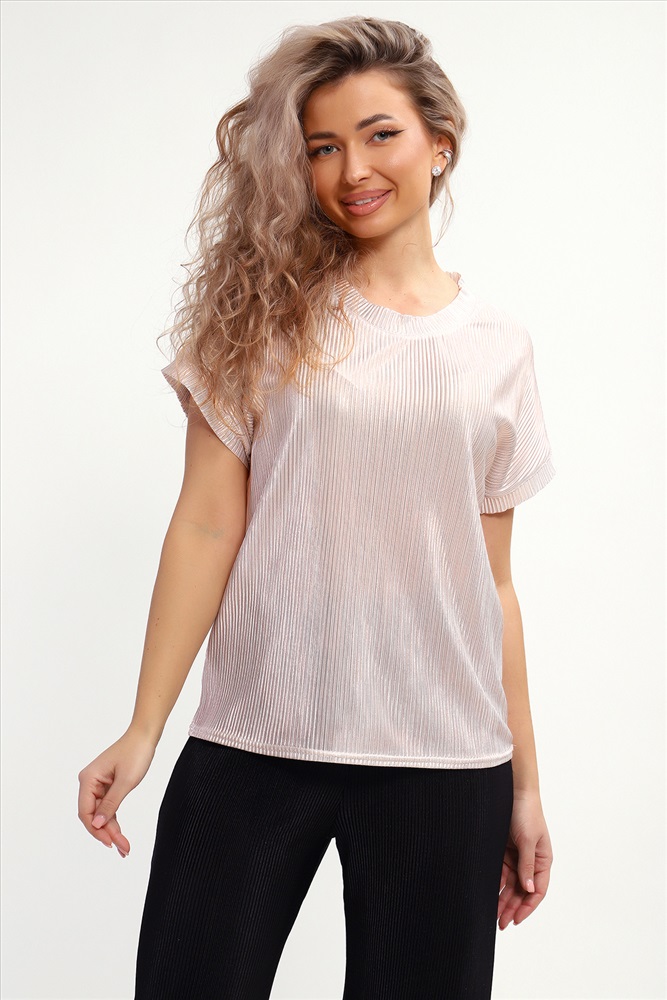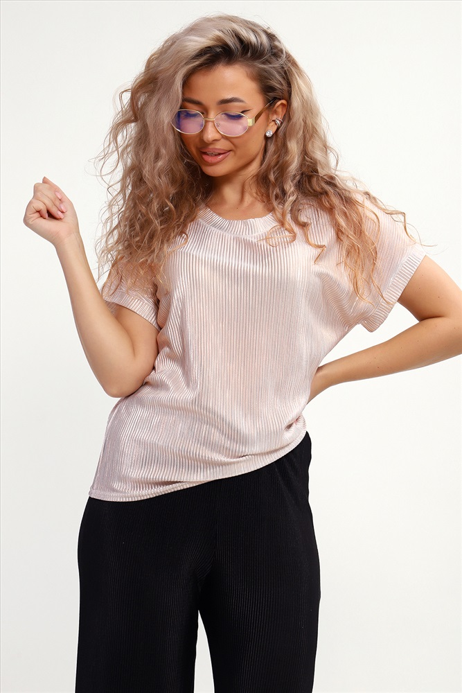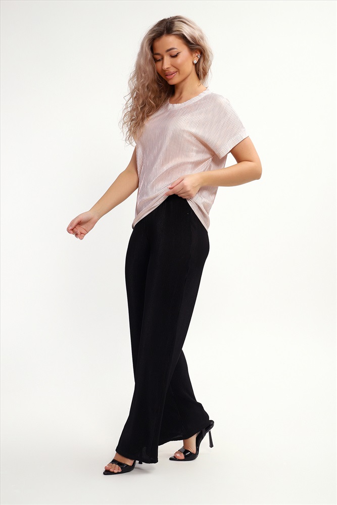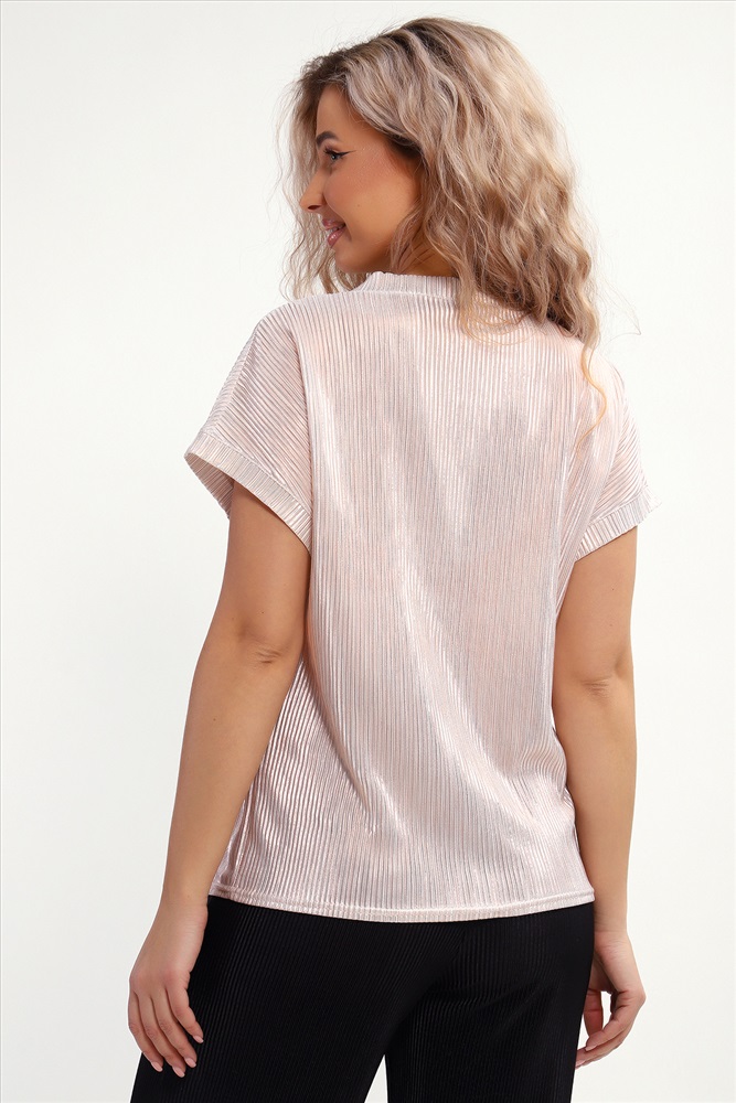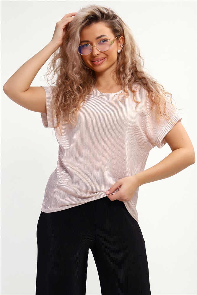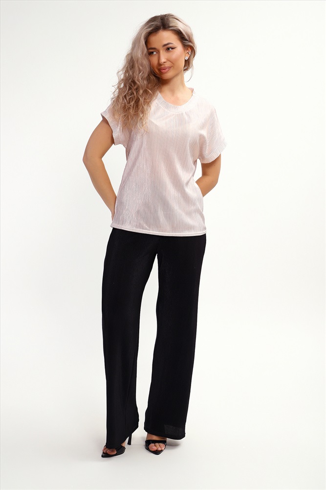 Застежка: без застежки Стильная нарядная блузка, сочетающая в себе комфорт и элегантность. Благодаря свободному крою, блузка создает легкий силуэт и деликатно скрывает особенности фигуры. Добавляет изюминку изделию блестящая ткань с прочным напылением фойл, которое отлично держится на ткани после стирки. Ткань атлас гофре приятна на ощупь, хорошо тянется, не мнется, держит форму. Блузка смотрится и как офисная, и как вечерняя модель, а также это отличный вариант для летнего наряда. Округлая горловина, обработанная обтачкой, подчеркивает женственность образа, спущенный рукав не стесняет движений. Нарядная блузка позволит вам эффектно выглядеть не только на праздничных мероприятиях, но и в будни. Блузка представлена в трех базовых расцветках, к которым легко подобрать юбку или брюки. На модели брюки 32827, которые изготовлены из такой же ткани, только без блестящего напыления.