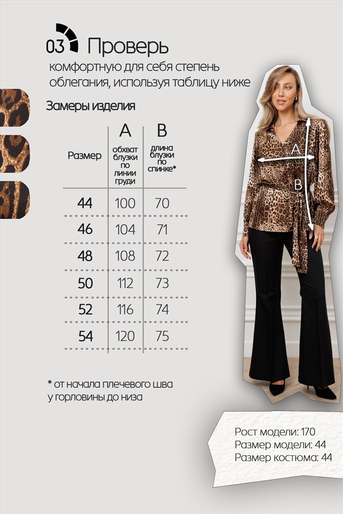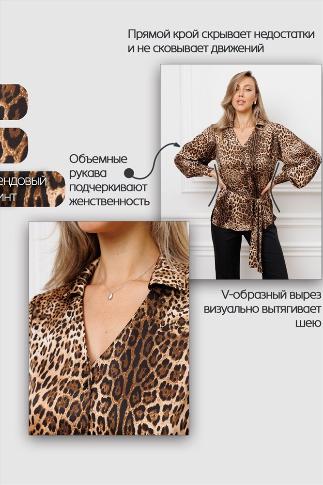 Состав: 100% полиэстер Модель: Блузка атласная нарядная с поясом 51060 Тип товара: блузка Материал: атлас | атлас Бренд: TOPLES Карман: без карманов Отделка: с манжетами | с поясом Рисунок: анималистичный Рукав: длинный рукав Сезонность: лето | осень | весна | зима Силуэт: полуприлегающий Стиль: нарядный | повседневный Воротник: без воротника Застежка: пуговицы Блузка с поясом от российского производителя бренда женской одежды! Блуза прямого силуэта с V-образным вырезом, застегивается на пуговицы. Данная модель свободного кроя имеет леопардовый принт, в боковых швах имеются разрезы, пояс съемный. Рукав полной длины внизу имеет две складки, разрез и манжету, которая застегивается на две пуговицы. Необычное дизайнерское решение позволило совместить элегантную классику и эффектный стиль. Леопардовая рубашка женская станет отличным дополнением к любому гардеробу. Шелковая модель имеет в комплекте пояс, что подчеркивает талию и создает элегантный силуэт. Стильная блузка с поясом станет отличным выбором для женщин, стремящихся выглядеть нарядно и модно. Изготовленная из легкой атласной ткани, она обладает свободным кроем оверсайз, что обеспечивает комфорт в носке. Черный и белый цвета отлично подойдут как для праздничного мероприятия, так и для офисных встреч. Эта рубашка дополнена рукавами-фонариками, что придает образу романтичности и элегантности. Пояс позволяют регулировать силуэт, создавая акцент на талии. Также присутствует стильный леопардовый принт, который добавляет нотку дерзости в наряд. Блуза идеально подходит для школьной формы или делового стиля. Она станет универсальным элементом гардероба ее можно сочетать с юбками или брюками, создавая разнообразные образы на лето и вечеринки. Праздничные выходы станут еще ярче с этой модной одеждой. Вам понравится удобство и легкость этой женской рубахи! Стройнящий силуэт позволит чувствовать себя уверенно и привлечет внимание окружающих. Нарядная блузка доступна в больших размерах плюс сайз - 50, 52 и 54, будет шикарно смотреться в любом возрасте, подойдет для полных девушек. Таблица размеров и веса