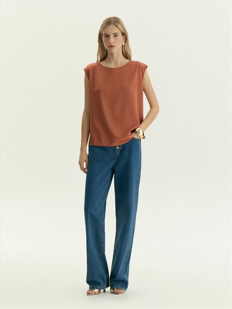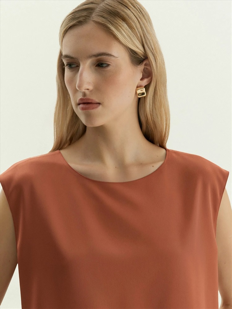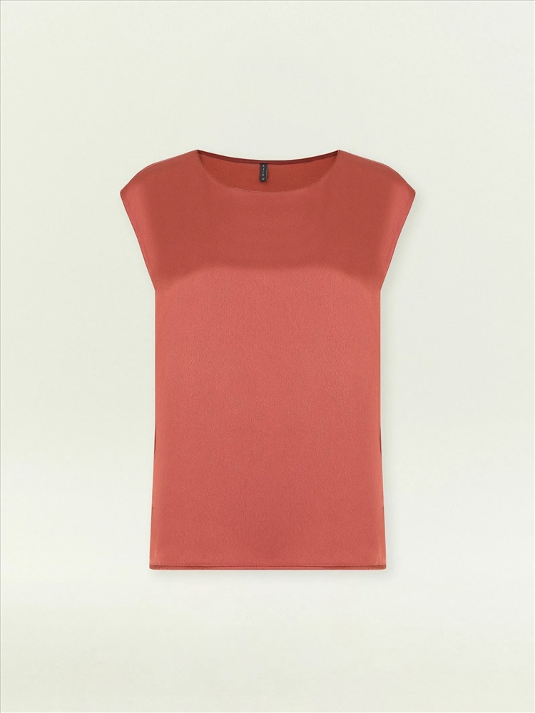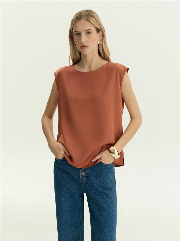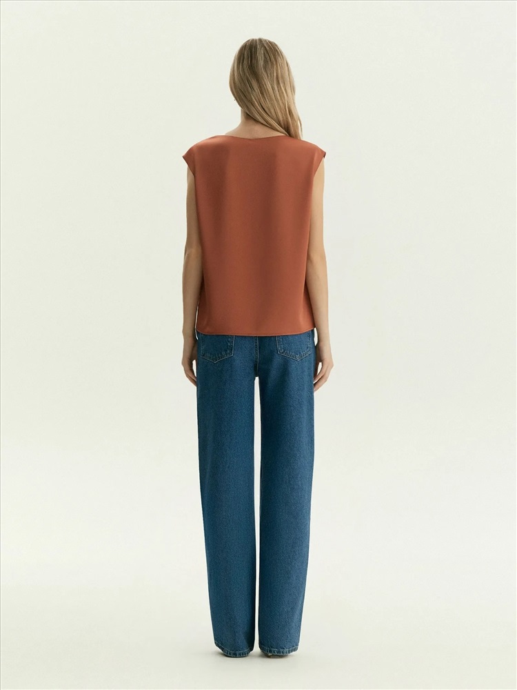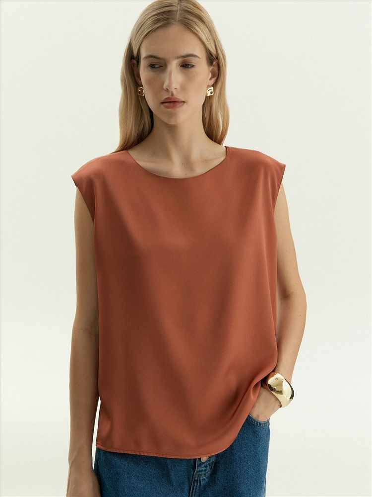 Топ в согревающем цвете между терракотовым и апельсиновым. Удобная модель без рукавов идеальна под жакеты. Прямой силуэт подойдёт любому типу фигуры. Топ станет лаконичным дополнением деловых и ежедневных образов. Выполнен без подкладки.
