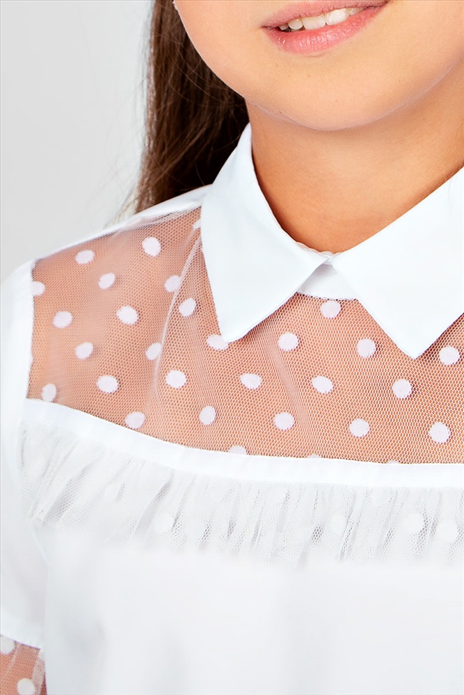 Застежка: без застежки Подростковая блузка белого цвета с отложным воротником. Рукава и передняя полочка выполнены из фатина. Состав материала: 70% - вискоза, 25% нейлон, 5% спандекс.