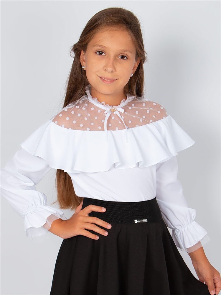 Застежка: молния Блузка школьная нарядная с прозрачной вставкой для девочки подростка. Детская блуза декорирована прозрачными вставками с флоковыми горошками. На спинке модели расположена удобная застежка молния. Мягкий летящий материал и изысканные детали делают её стильной и удобной. Шифоновая блуза украсит и дополнит любой образ в школу. Подростковые блузки хорошо смотрятся в сочетании с юбками, сарафанами и брюками. Кофточка для девочек подходит в школу на каждый день и для праздников: будет идеально смотреться на школьной линейке 1 сентября, в день учителя, 8 Марта, на выпускной, утренник или День рождения. Покрой модели прямой, благодаря чему блуза будет прекрасно сидеть как на стройной, так и на полной фигуре. Основа выполнена из мягкой дышащей вискозы, с большим содержанием нейлона, благодаря чему хорошо держит форму, не садится, не образует катышек на поверхности, имеет эффектный внешний вид даже при активной носке и после многократных стирок. Кофту можно носить без дополнительной глажки. Прекрасная идея для делового стиля и для базового гардероба юной модницы