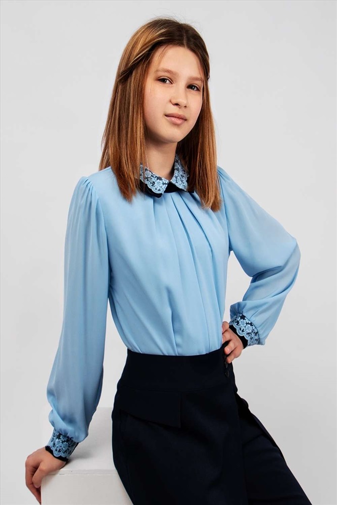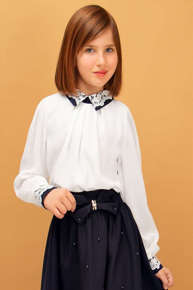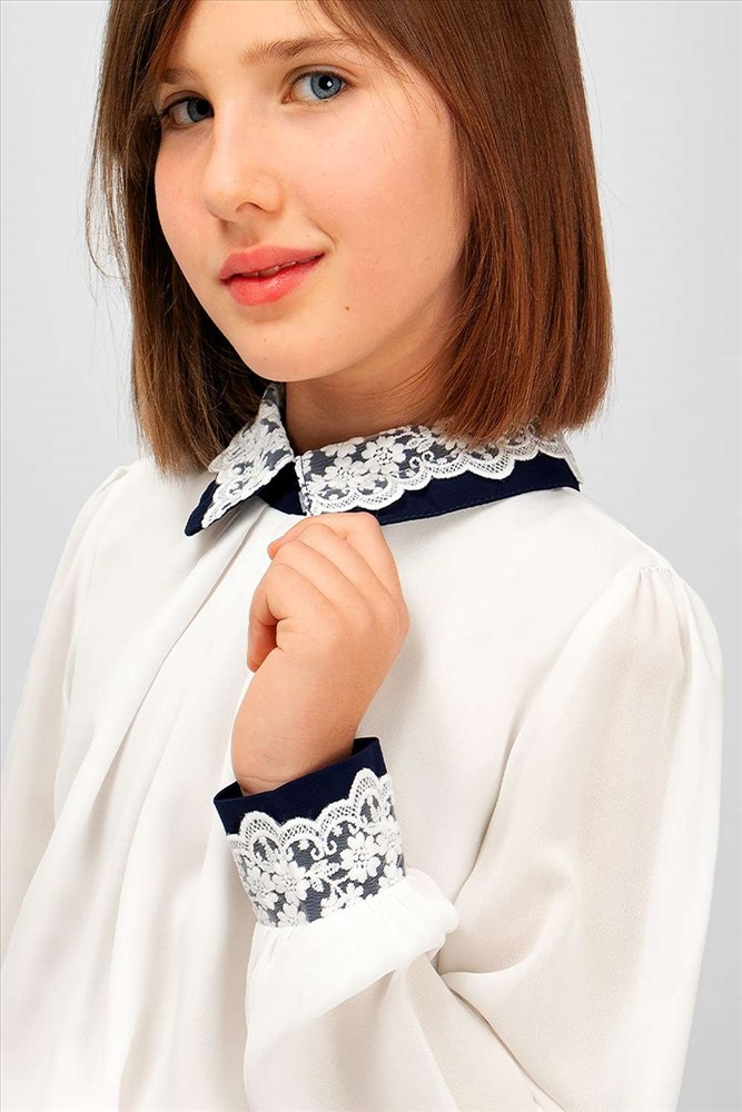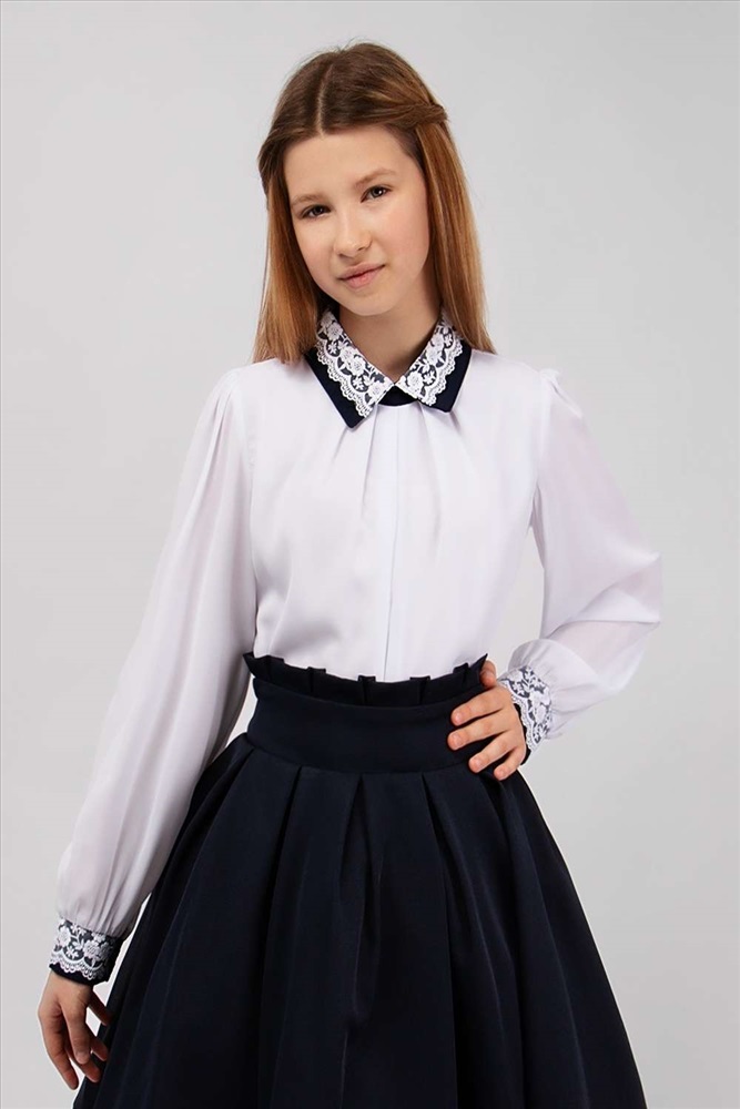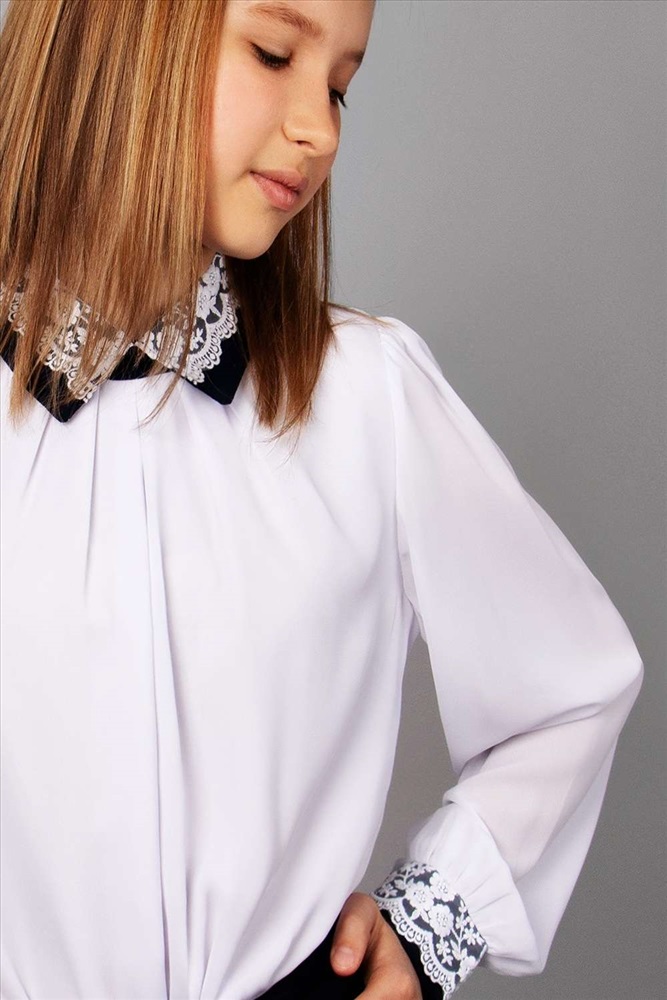 Застежка: молния Элегантная блузка свободного силуэта для девочки. Отложной воротник и манжеты на рукавах оформлены кружевным декором. На спине застежка - молния, передняя часть блузки с подкладом. Прекрасный выбор для создания красивого школьного образа. Размер 128-34 (рост 122-128 см) длина изделия 49 см, полуобхват груди 37 см, длина рукава 44 см. Размер 134-36 (рост 128-134 см) длина изделия 51 см, полуобхват груди 38 см, длина рукава 48 см. Размер 140-38 (рост 134-140 см) длина изделия 53 см, полуобхват груди 40 см, длина рукава 51 см. Размер 146-40 (рост 140-146 см) длина изделия 55 см, полуобхват груди 43 см, длина рукава 55 см. Размер 152-42 (рост 146-152 см) длина изделия 57 см, полуобхват груди 46 см, длина рукава 57 см.