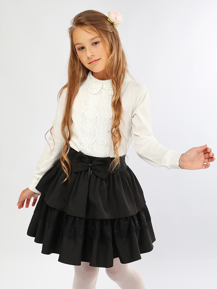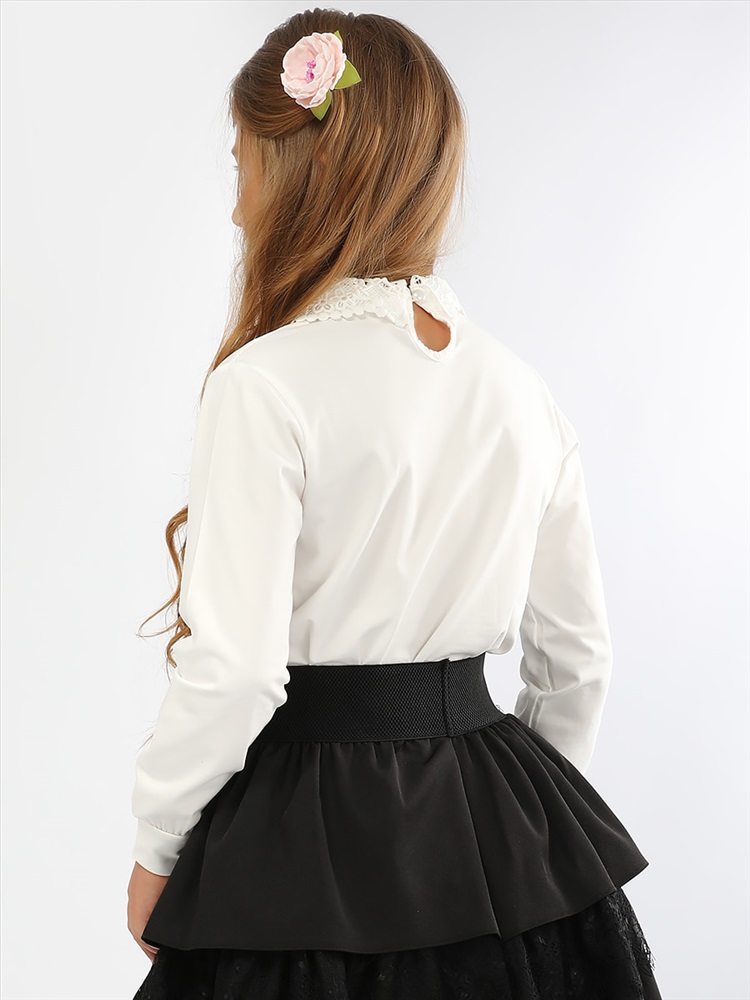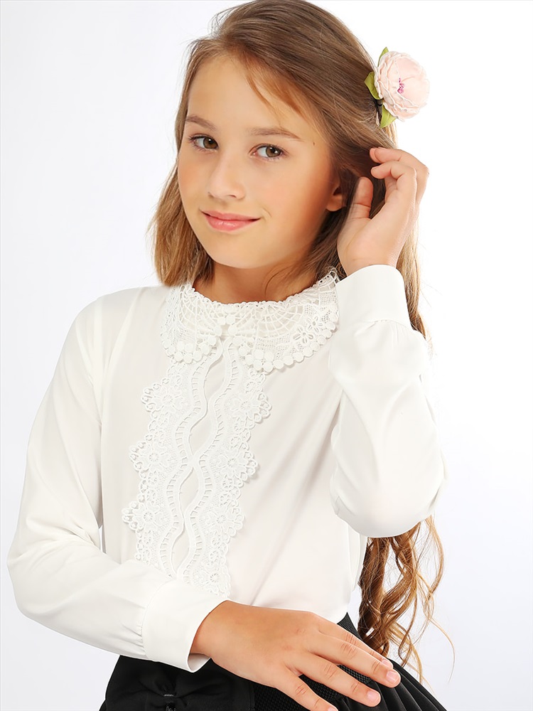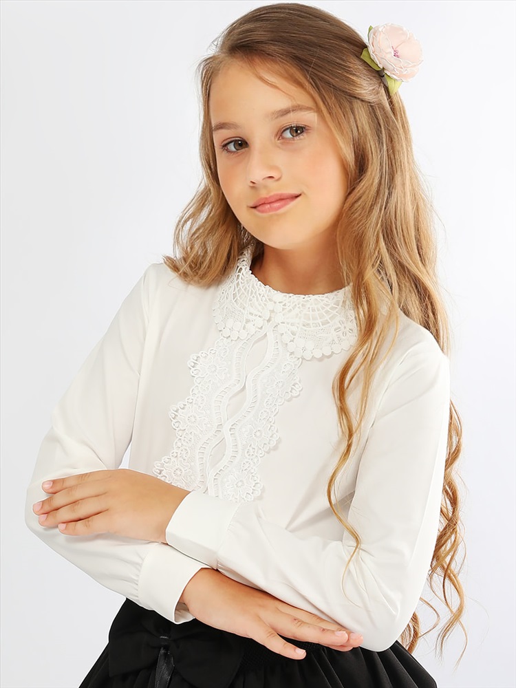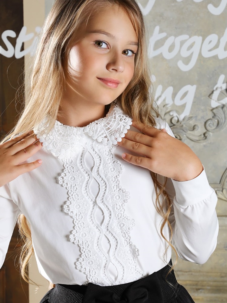 Элегантная блузка прямого силуэта для девочки. Передняя часть декорирована кружевом, отложной воротник также выполнен из кружева. Мягкий, приятный к телу трикотаж, обеспечит идеальную посадку изделия по фигуре. На спинке застёжка-пуговица. Прекрасный выбор для создания красивого школьного образа.