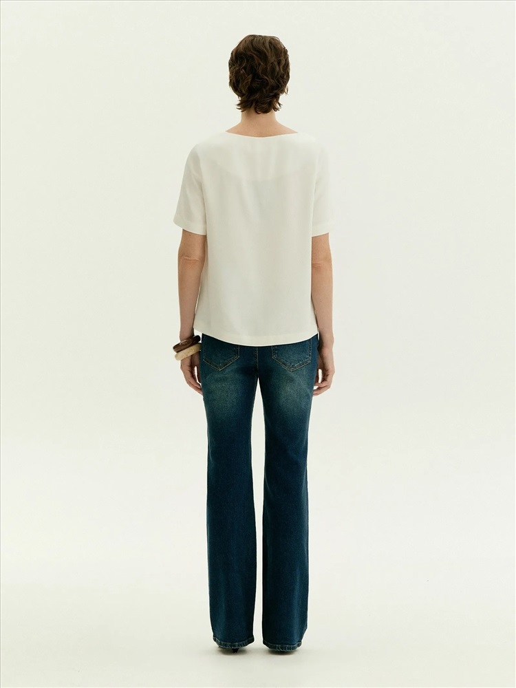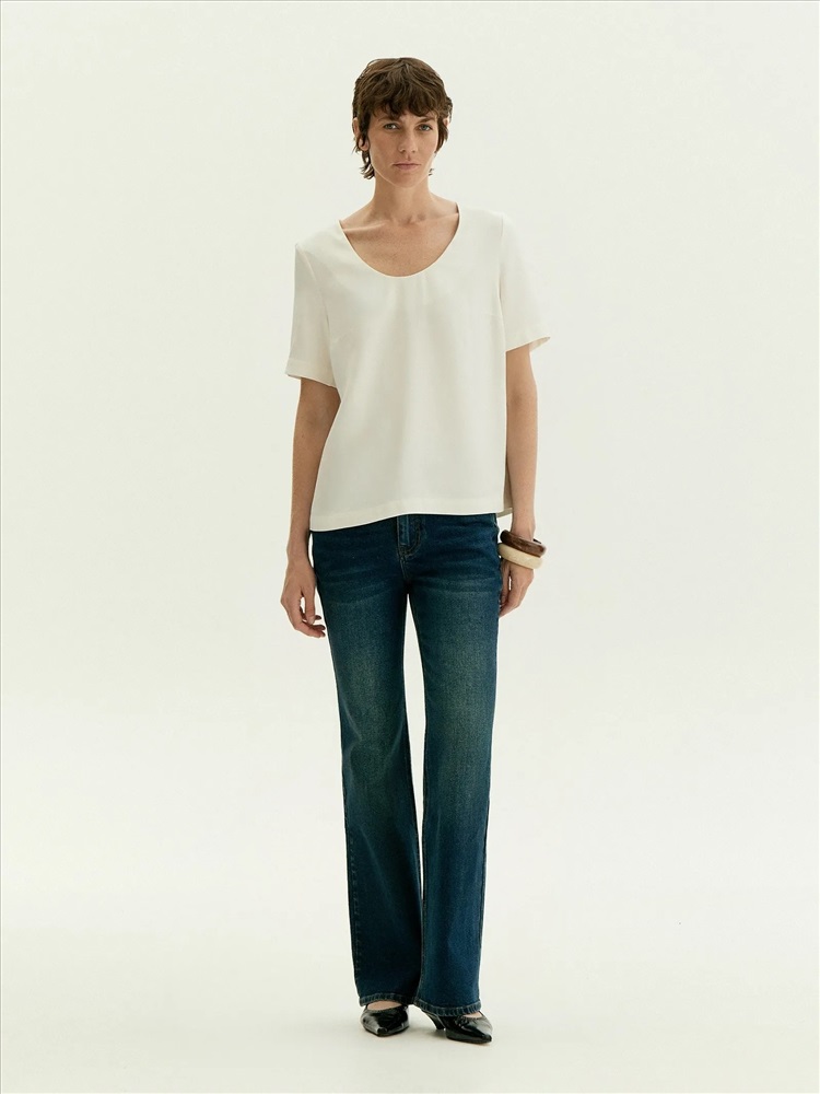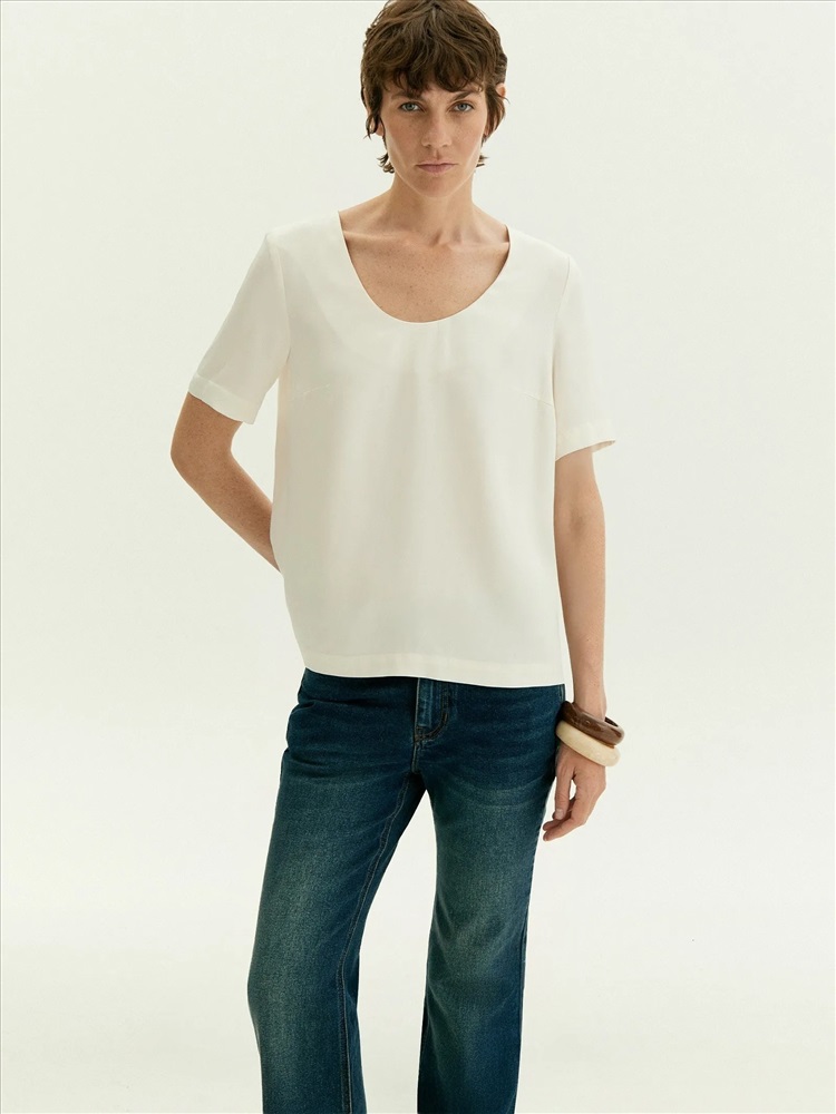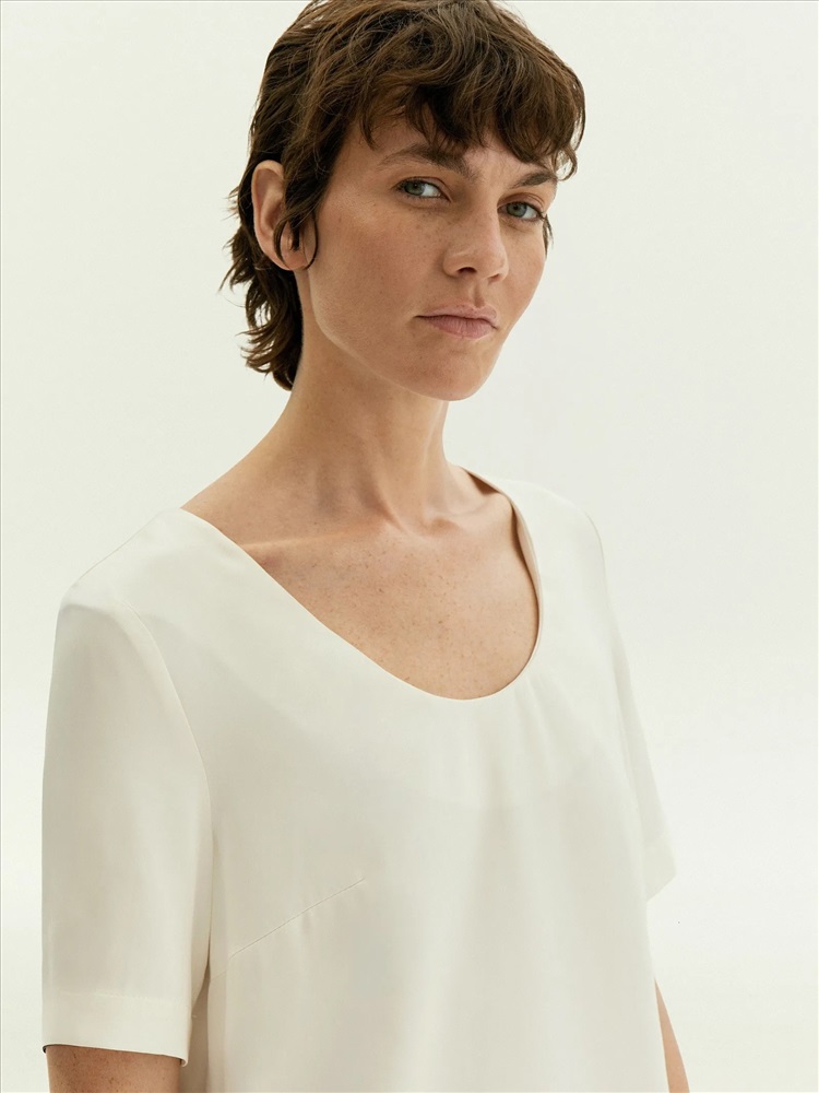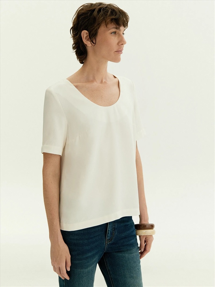Лаконичная блуза с коротким рукавом и расширенным U-вырезом поддержит минималистичное настроение. Красиво открывает ключицы и руки. Имеет аккуратные вытачки в области груди. Выполнена из приятной к телу вискозы, без подкладки. Сочетается с любым базовым низом, а также модными золотыми браслетами и крупными серьгами.