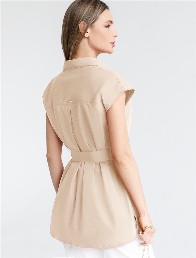 Удлиненная блузка в стиле сафари из легкого хлопкового поплина. Модель со спущенной линией плеча дополнена двумя накладными карманами. В комплекте идет пояс из основного полотна. В изделии будет комфортно, даже в самое жаркое время года. Подходит для любой фигуры. Сочетается в костюме с кюлотами D24.233 и юбкой D26.179