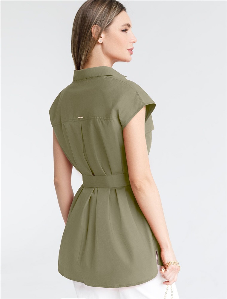 Размер товара на первом фото: 42 Удлиненная блузка в стиле сафари из легкого хлопкового поплина. Модель со спущенной линией плеча дополнена двумя накладными карманами. В комплекте идет пояс из основного полотна. В изделии будет комфортно, даже в самое жаркое время года. Подходит для любой фигуры. Сочетается в костюме с кюлотами D24.233 и юбкой D26.179