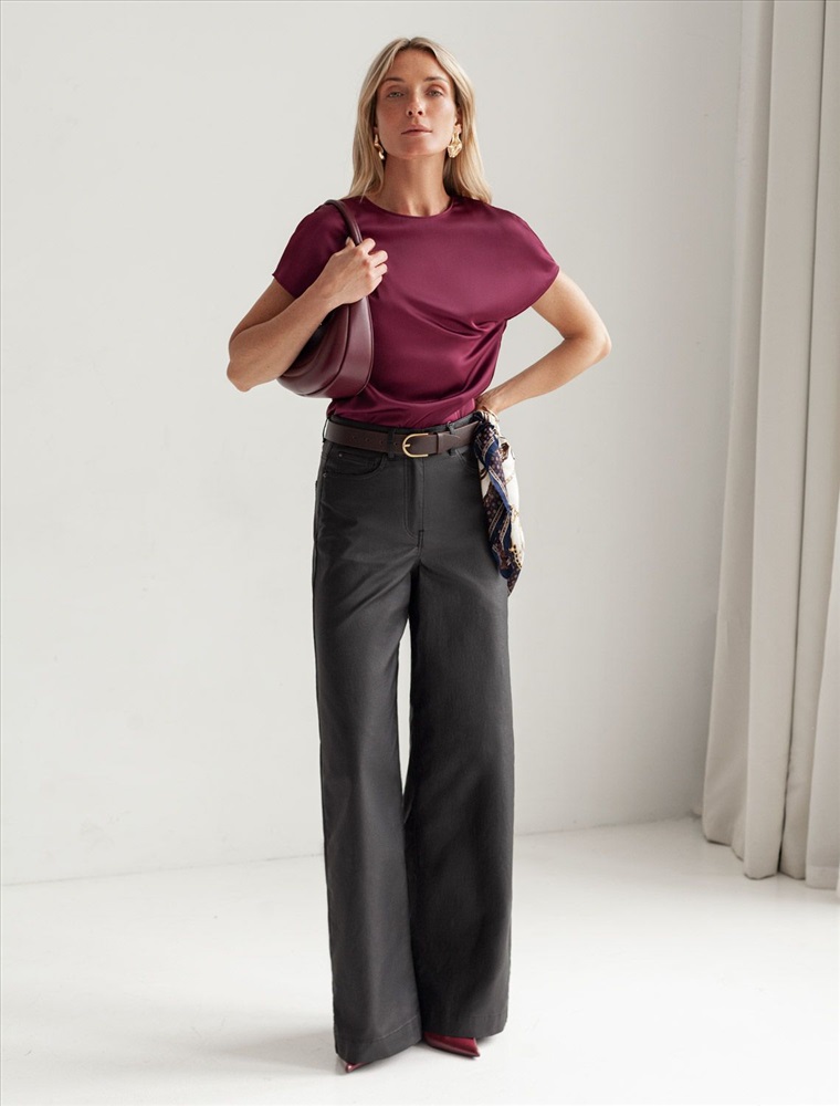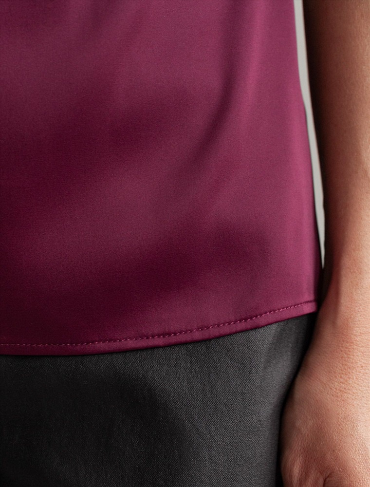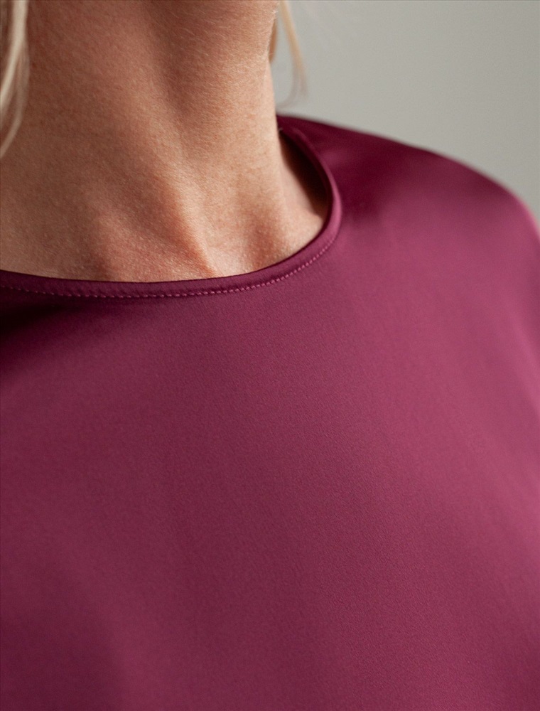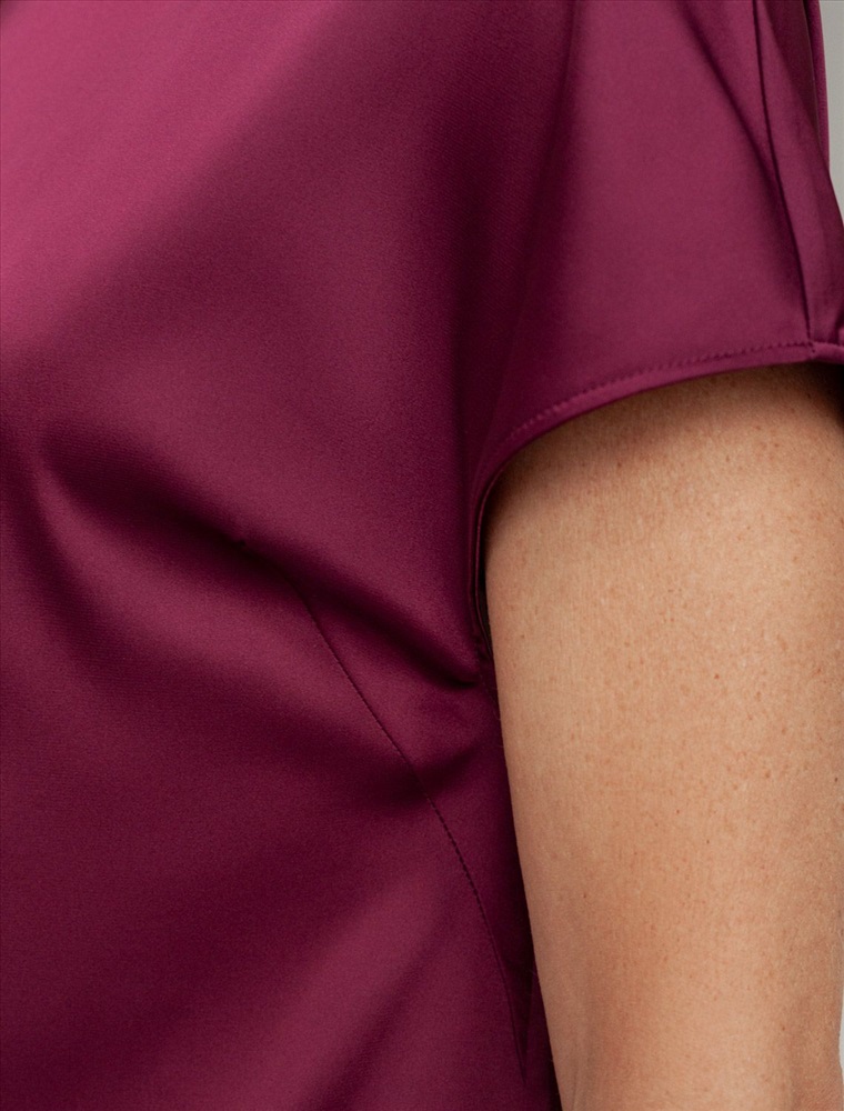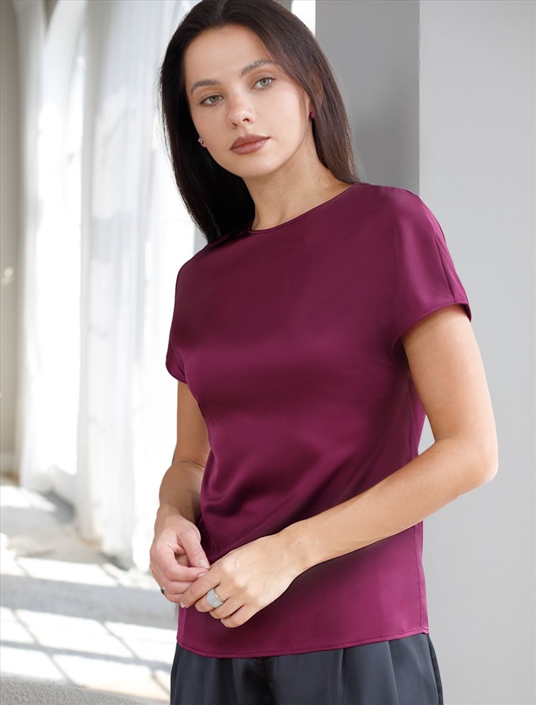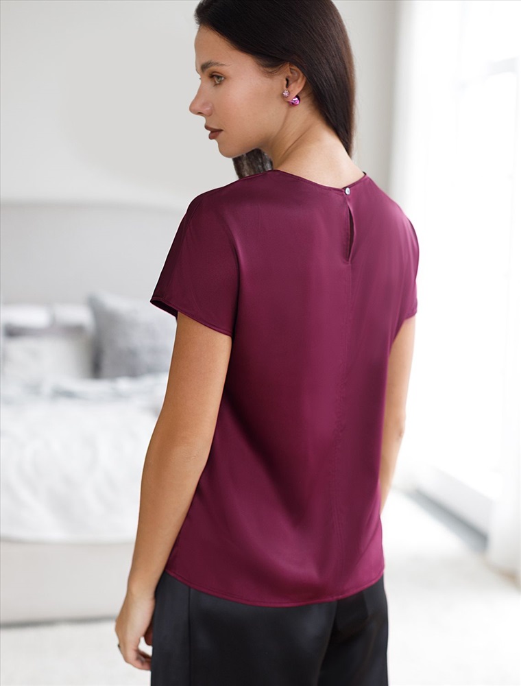 Размер товара на первом фото: 42 Стильная блузка винного цвета из сатина с удобной застежкой на пуговицу на спинке. Прямой крой и короткий рукав делают модель универсальной для любого сезона. Благородный блеск ткани подчеркивает элегантность, а удобная посадка обеспечивает комфорт. Благодаря эластану в составе ткань сохраняет первозданный вид, не образуя заломов. Ваш образ будет безупречен весь день! Блузка легко комбинируется с деловой одеждой и casual-вещами, подходит для разных случаев.