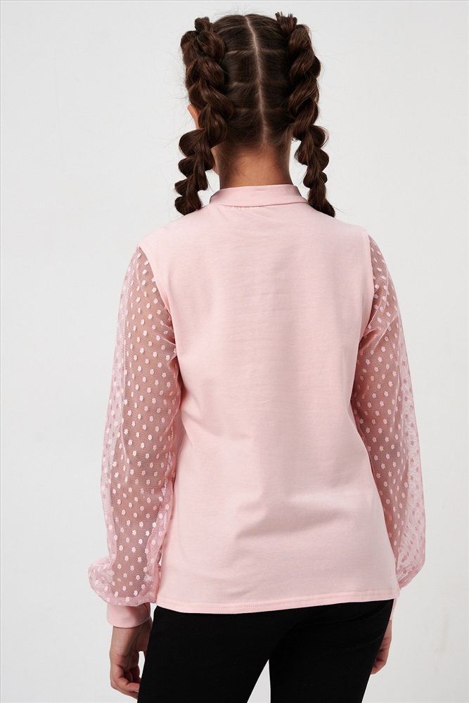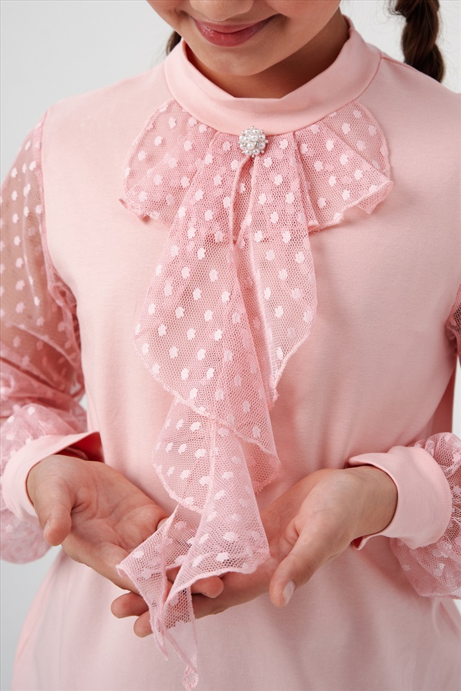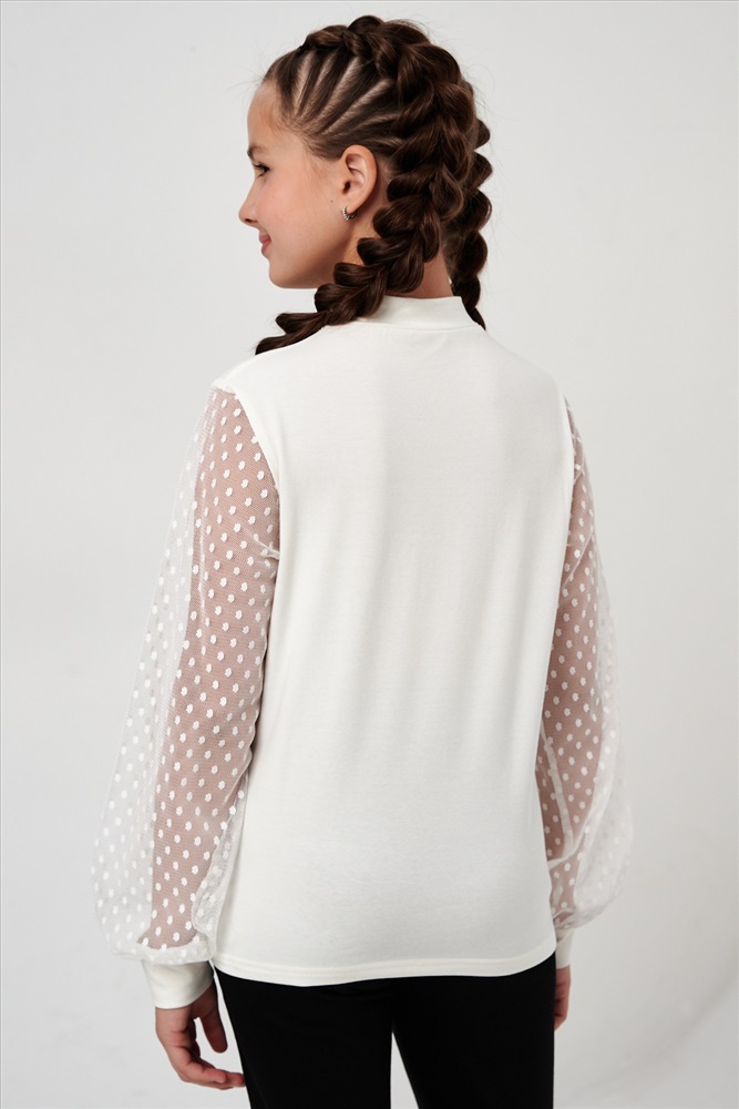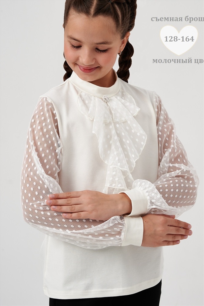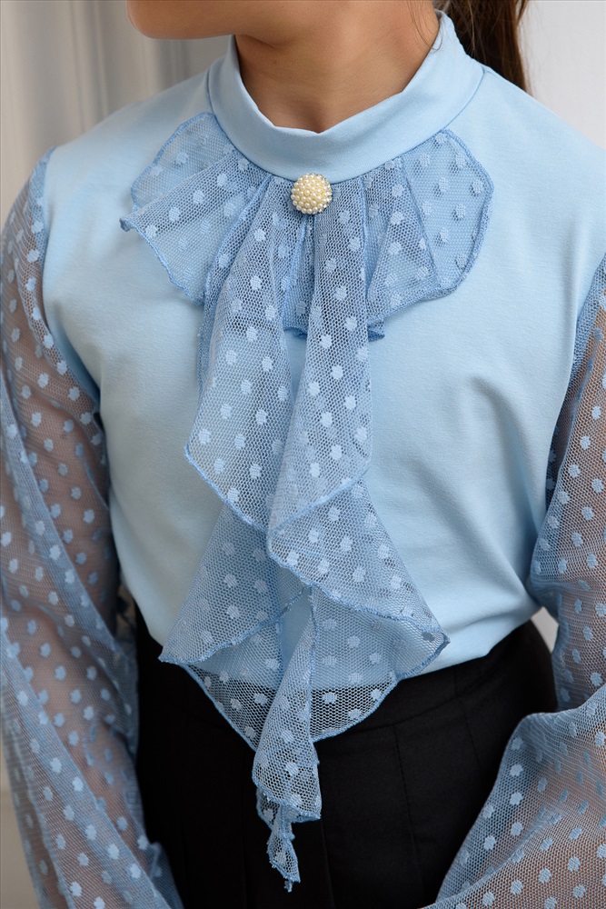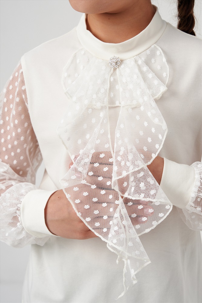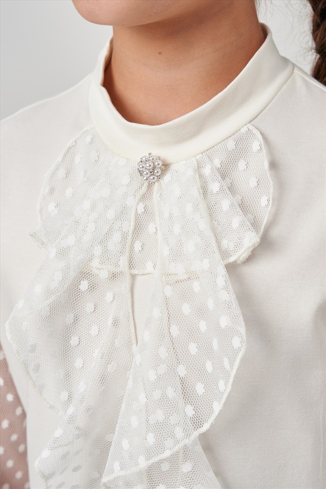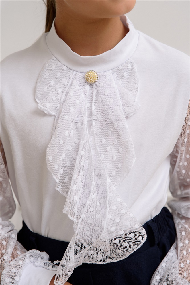 Застежка: без застежки Блузка школьная для девочек с длинными рукавами из фатина. Красивый джемпер для девочек с жабо на каждый день.