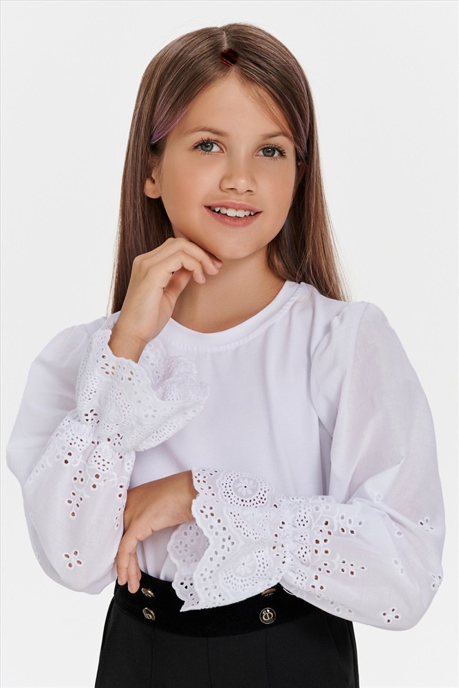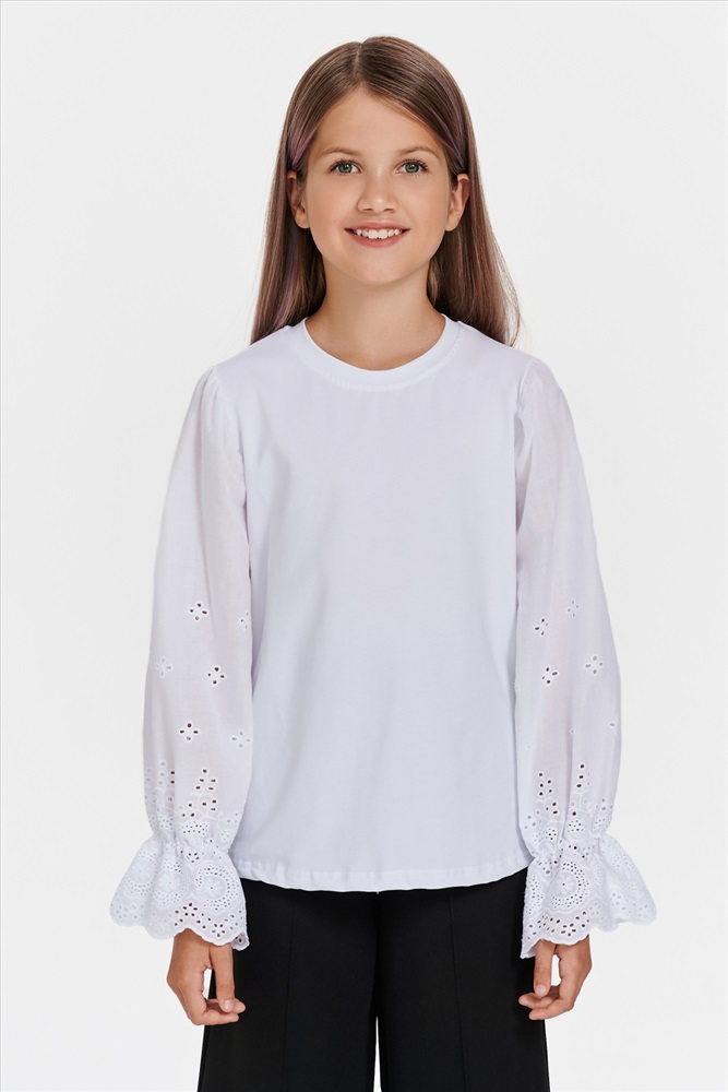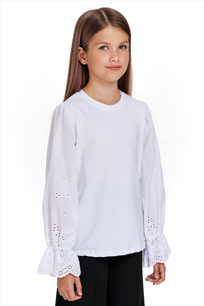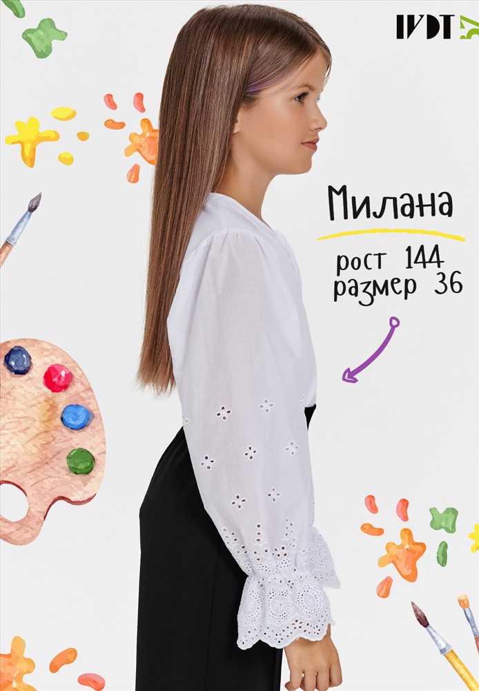 Состав: 95 Хб 5 Л-кра Отд.100ХБ Модель: Блузка Пелагея Тип товара: блузка Материал: кулирка с лайкрой | кулирка с лайкрой Бренд: Детский трикотаж 37 Карман: без карманов Особенности: на резинке Отделка: с воланами Рисунок: однотонные Рукав: длинный рукав Сезонность: лето | осень | весна | зима Силуэт: прямой | свободный Стиль: для школы | повседневный Воротник: без воротника Застежка: без застежки Блузка для школы летняя, которая будет смотреться хорошо и на обычном уроке, и на праздничной линейке. Лаконичная и минималистичная блуза - основа гардероба школьной одежды для девочки и прекрасный вариант на каждый день. Фасон предполагает простой крой и полуприталенный силуэт, Нежные ажурные узоры на рукавах делают эту блузку такой красивой и нарядной! Таблица размеров и веса